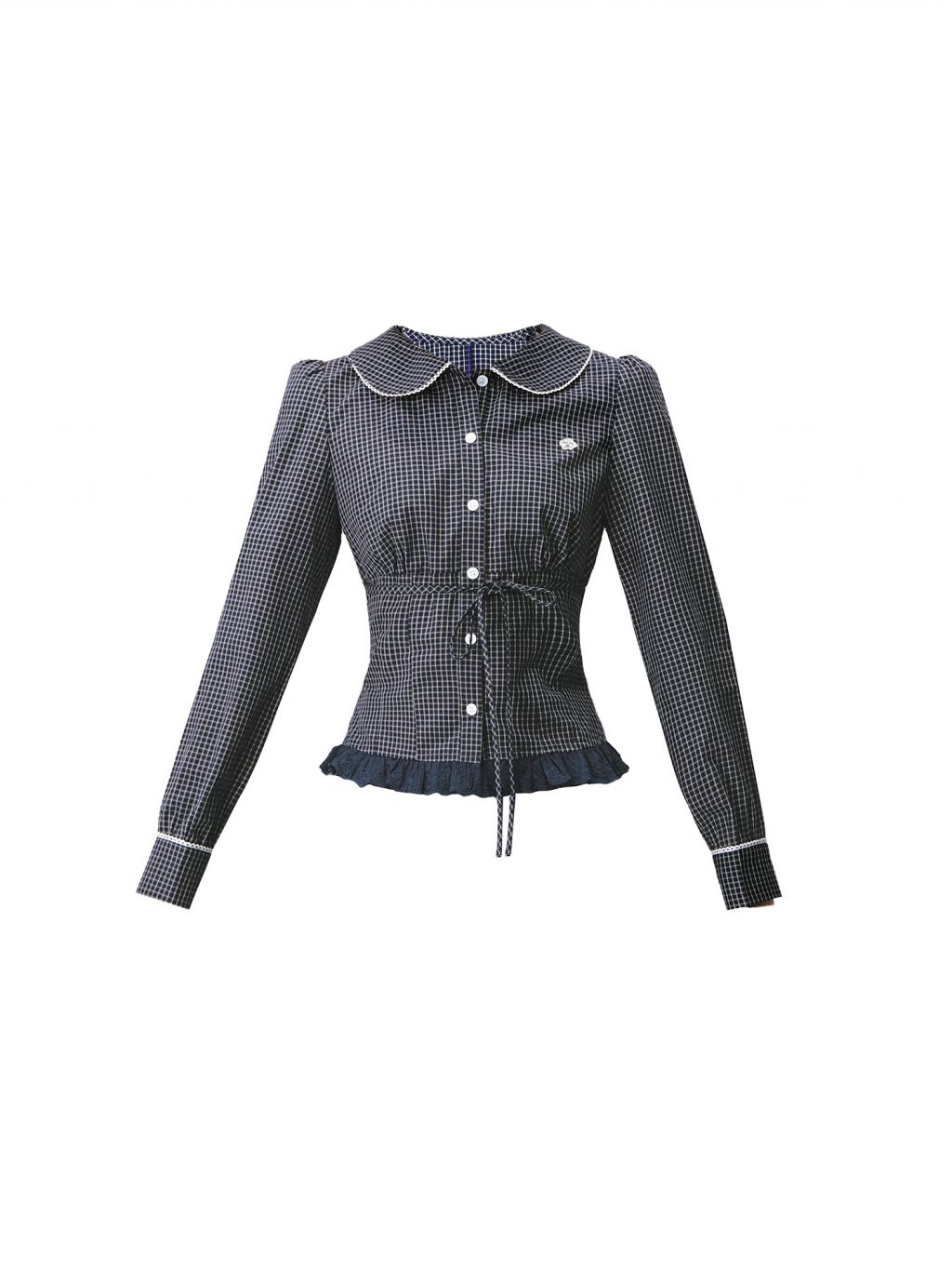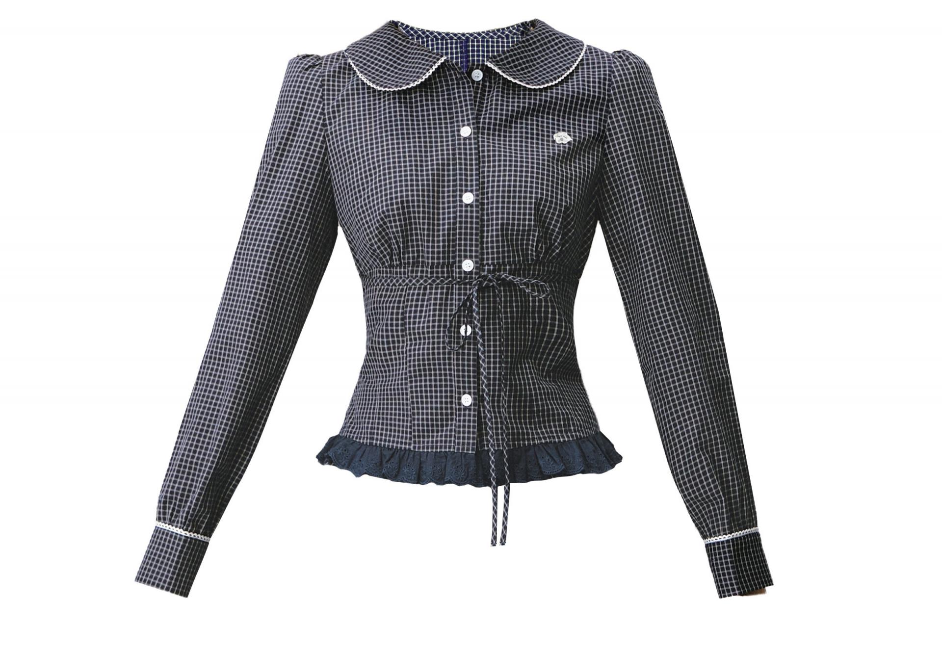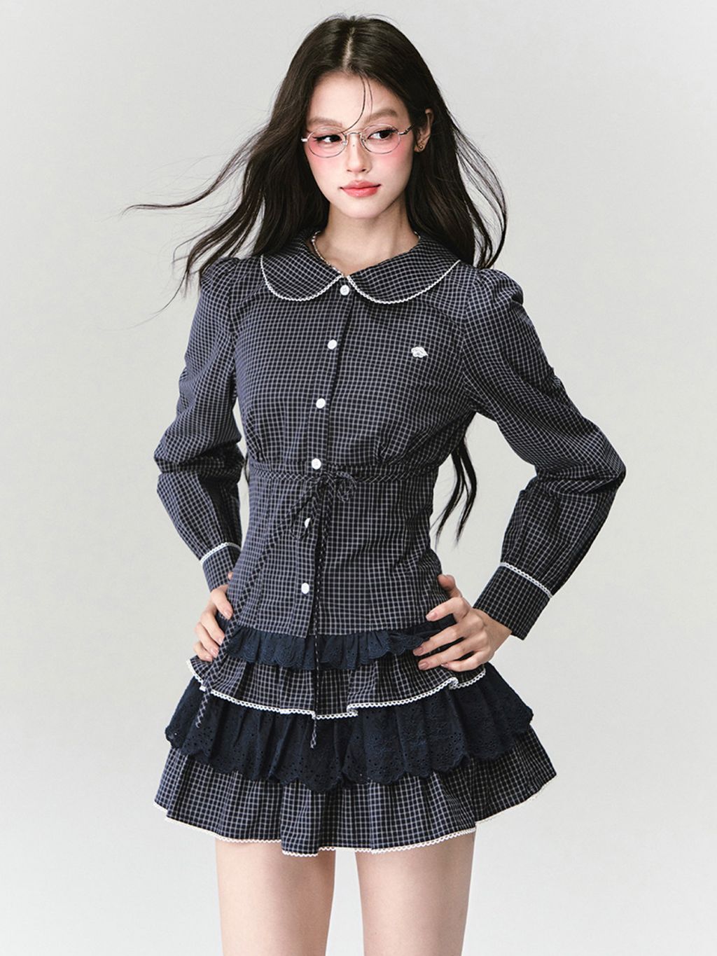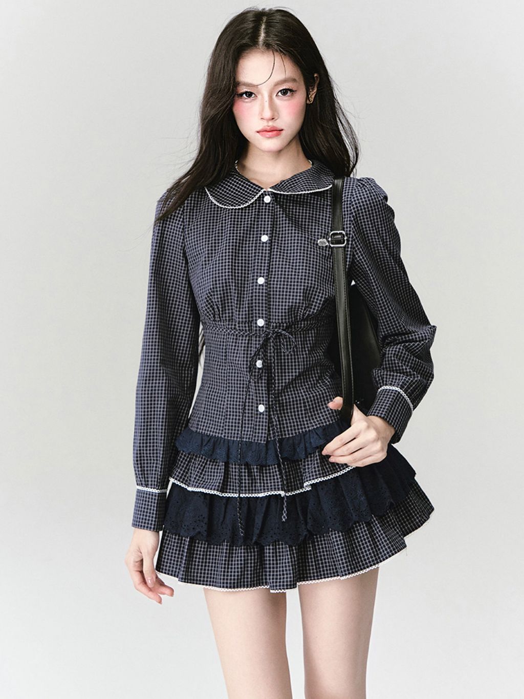 잔잔한 체크에 화이트 파이핑·빅 칼라 디테일을 더해, 한 벌만으로 “프레피 무드”가 완성되는 투피스 셋업입니다. 블라우스는 허리 스트링으로 라인을 잡아주고, 스커트는 캉캉 레이스 레이어로 다리 비율이 더 가볍게 보입니다.