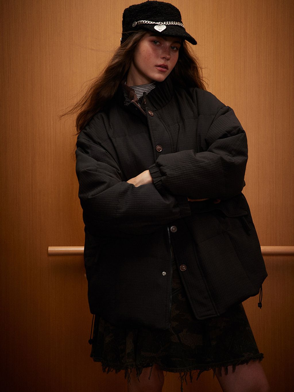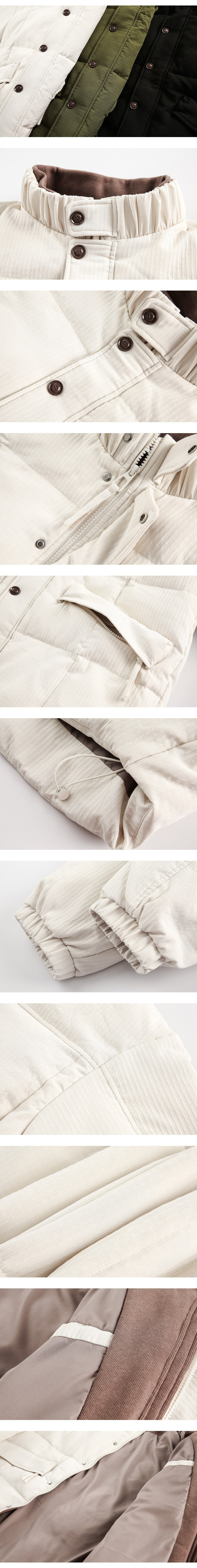 - 벨벳 배색 스탠드 카라/이너 디테일로 포인트 + 보온 무드 강화