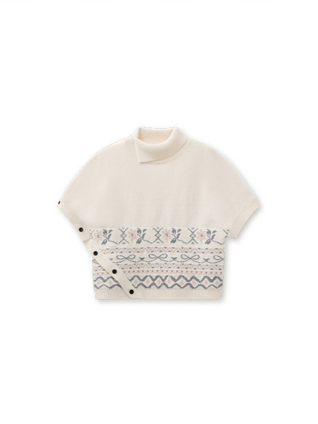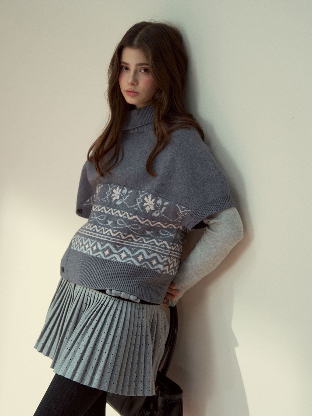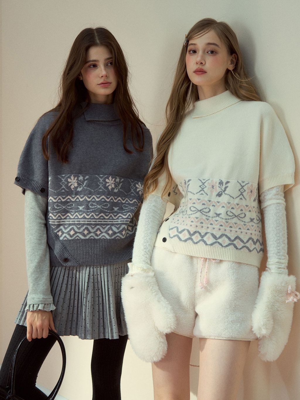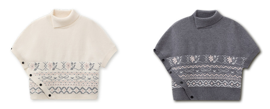 페어아일 패턴을 허리 밴드처럼 둘러, 레이어드만 해도 룩이 바로 ‘완성’되는 판초 니트예요. 옆 버튼 디테일이 실루엣을 정돈해줍니다.
