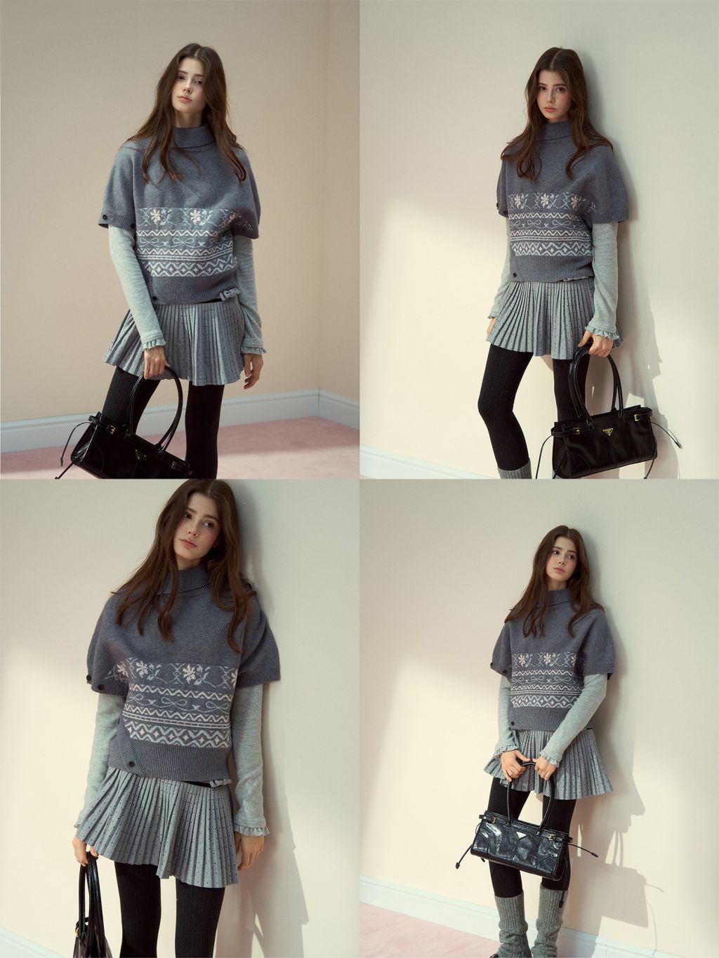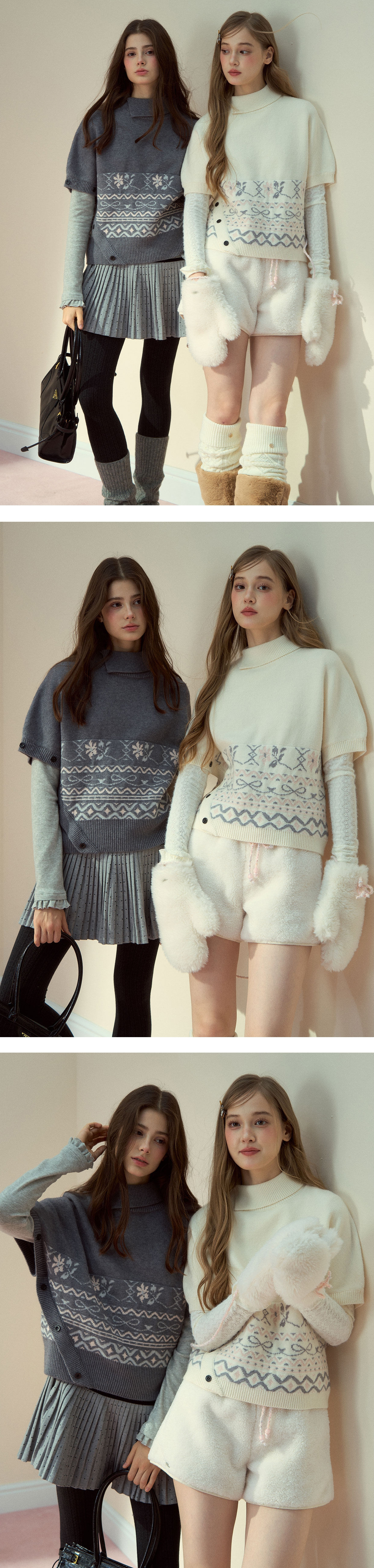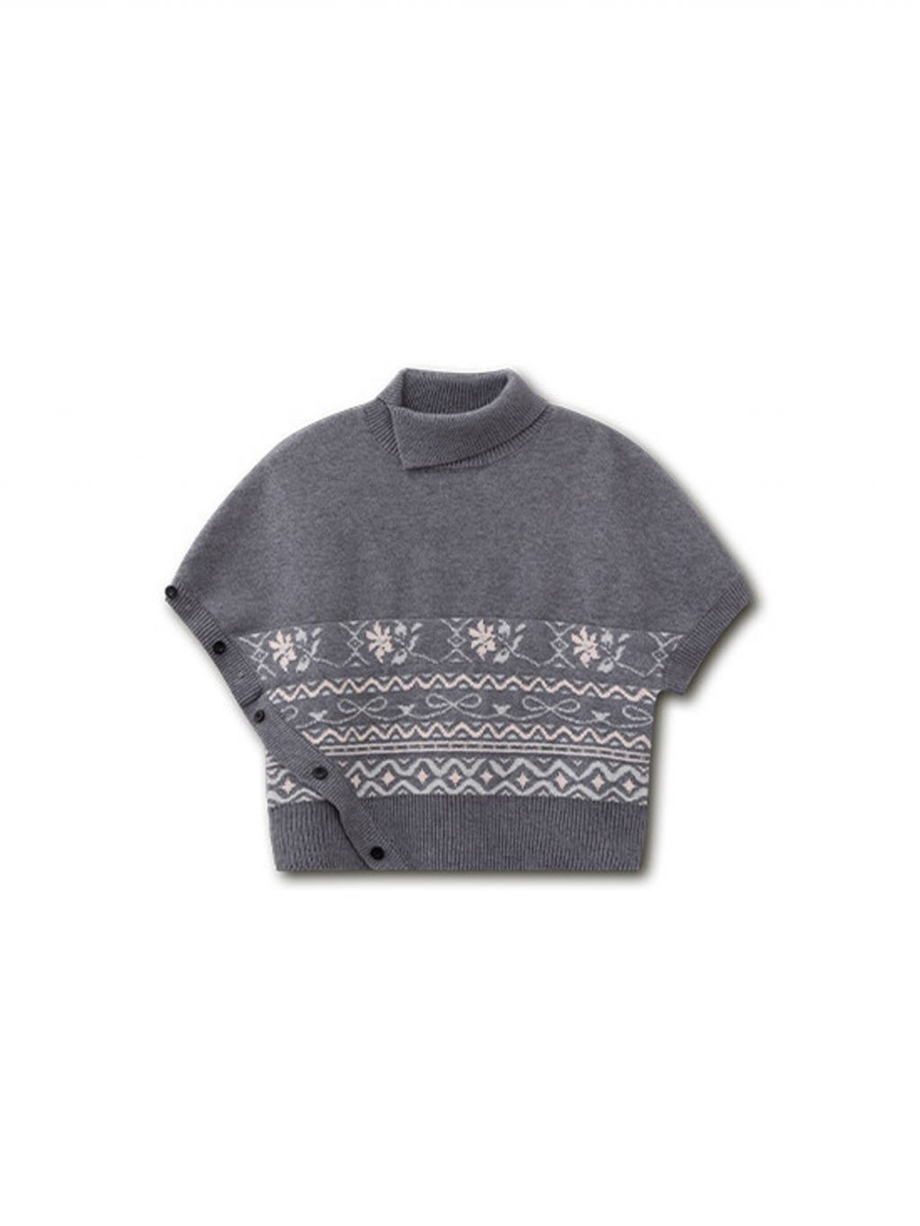 페어아일 패턴을 허리 밴드처럼 둘러, 레이어드만 해도 룩이 바로 ‘완성’되는 판초 니트예요. 옆 버튼 디테일이 실루엣을 정돈해줍니다.