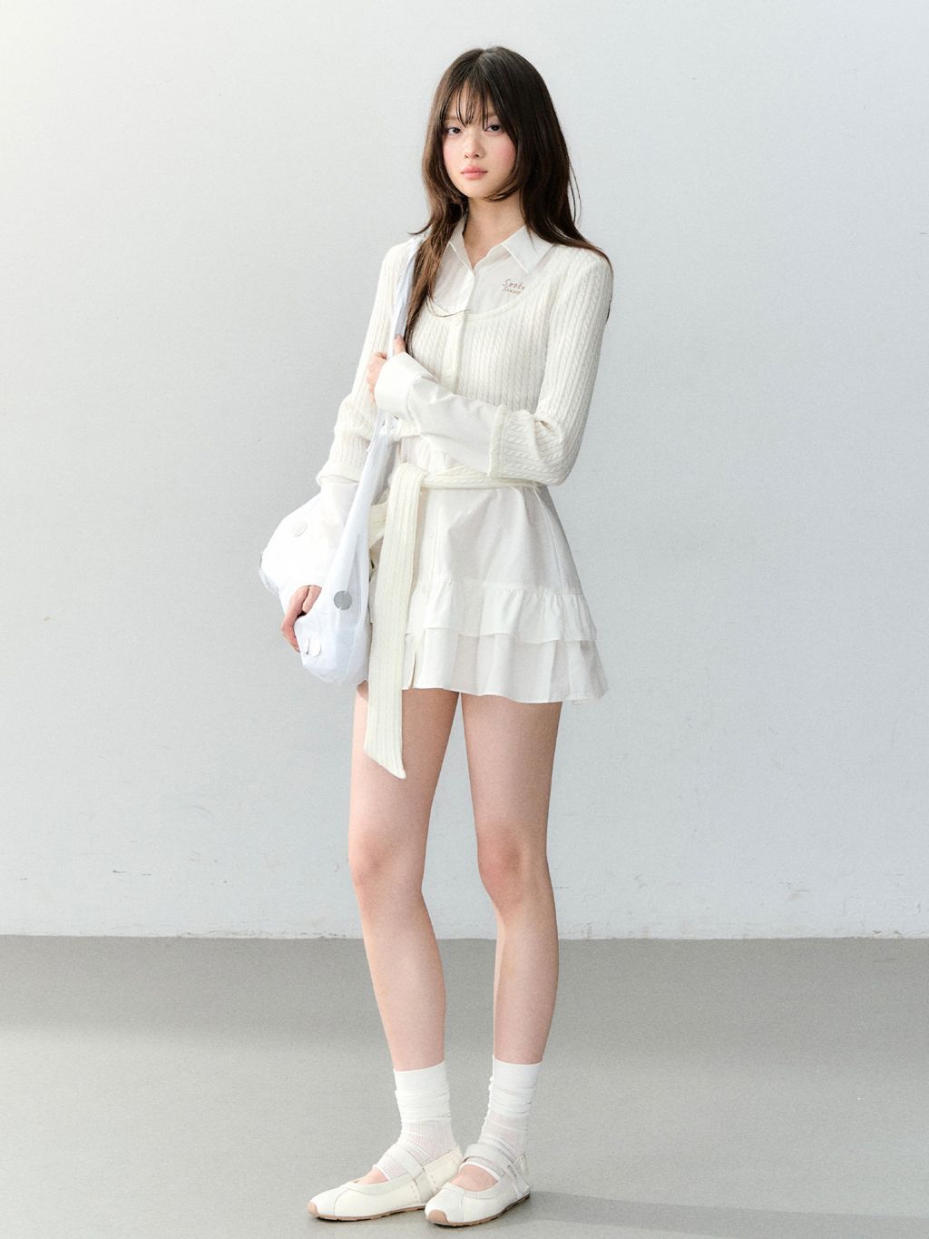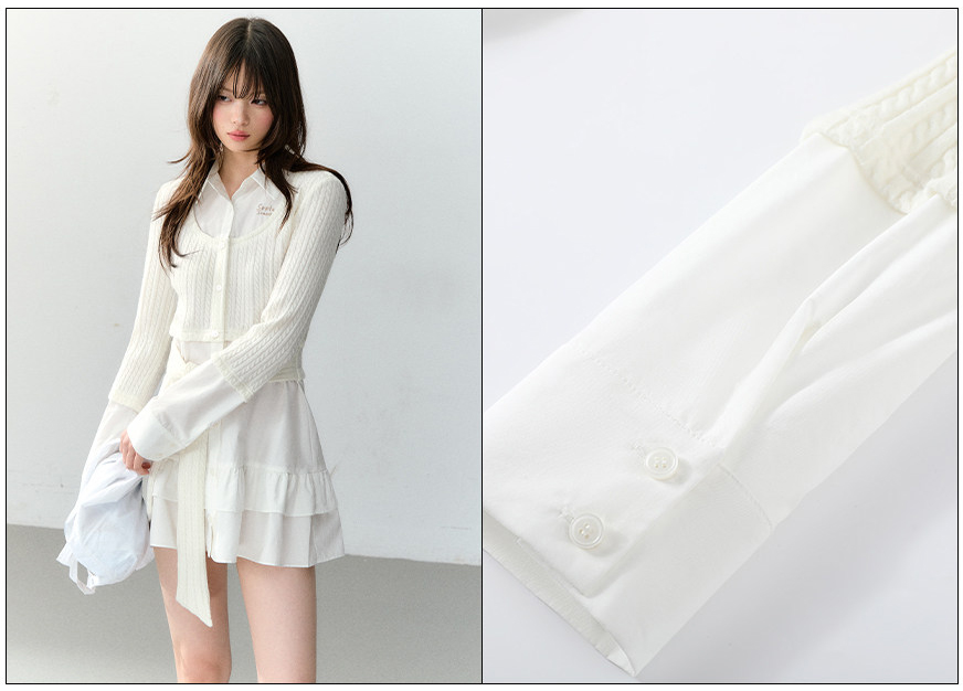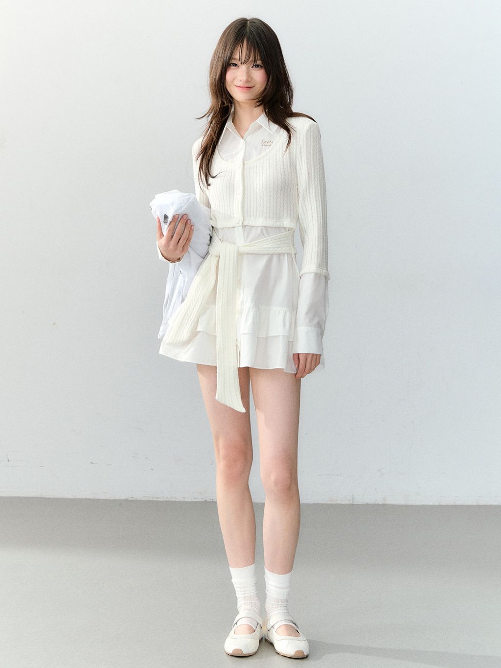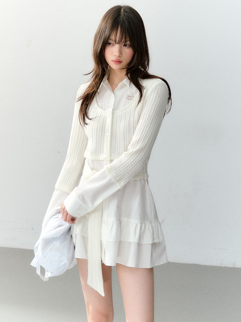 셔츠 드레스 위에 케이블 니트 크롭을 “붙여놓은 듯” 레이어드된, 한 벌로 코디가 끝나는 페이크 투피스 무드. 하이웨이스트 스트랩과 티어드 셔츠 스커트 라인이 비율을 길게 만들고, 움직일수록 가볍게 흔들립니다.