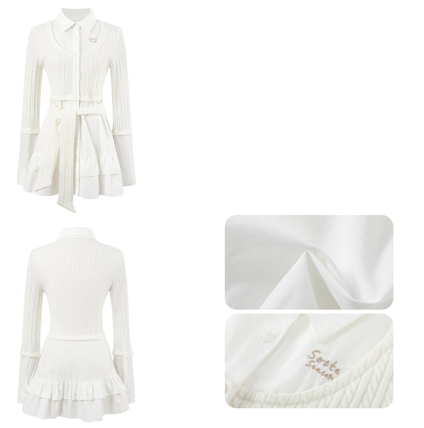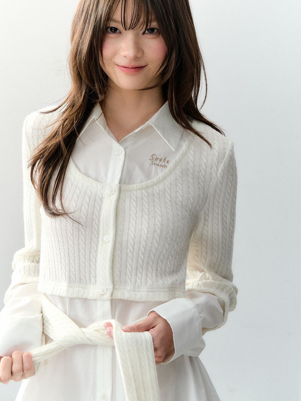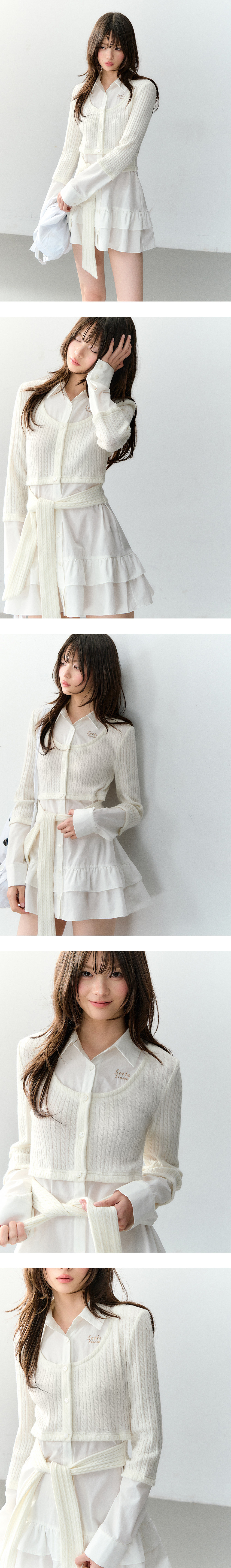 셔츠 드레스 위에 케이블 니트 크롭을 “붙여놓은 듯” 레이어드된, 한 벌로 코디가 끝나는 페이크 투피스 무드. 하이웨이스트 스트랩과 티어드 셔츠 스커트 라인이 비율을 길게 만들고, 움직일수록 가볍게 흔들립니다.