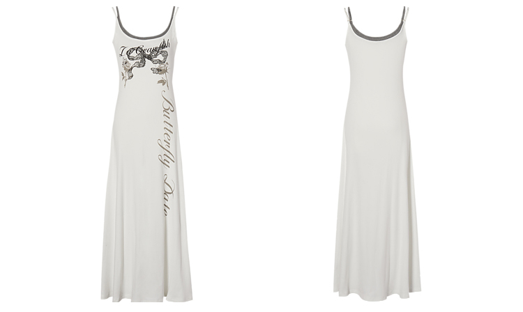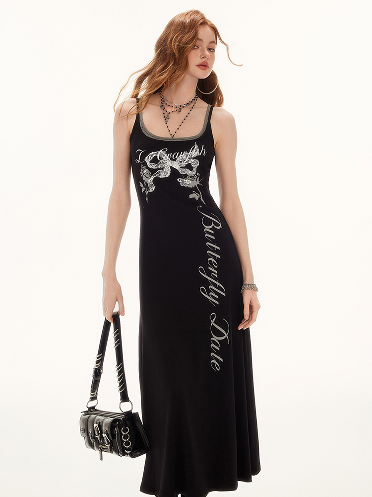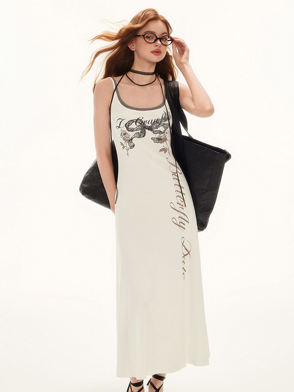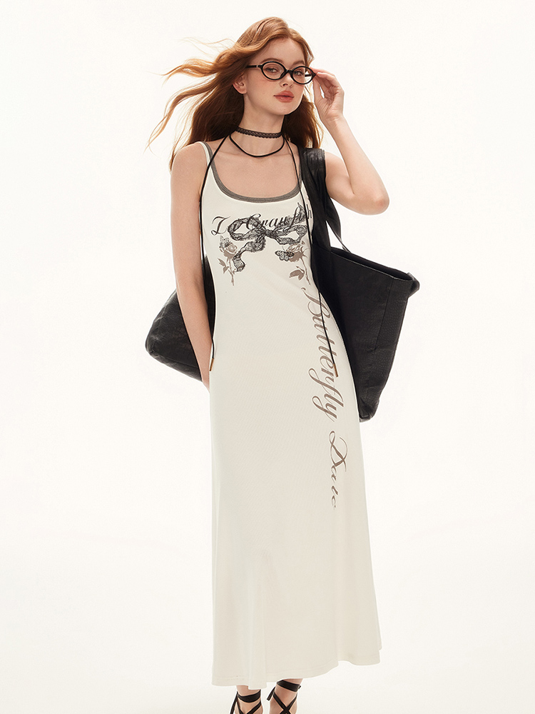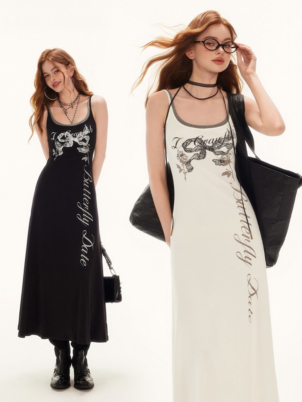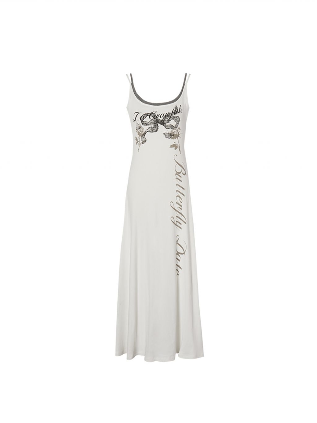 유려하게 떨어지는 슬림 롱 실루엣이 페미닌한 무드를 연출하며 레이스 리본 그래픽 프린트로 독특한 존재감을 더한 롱드레스입니다.