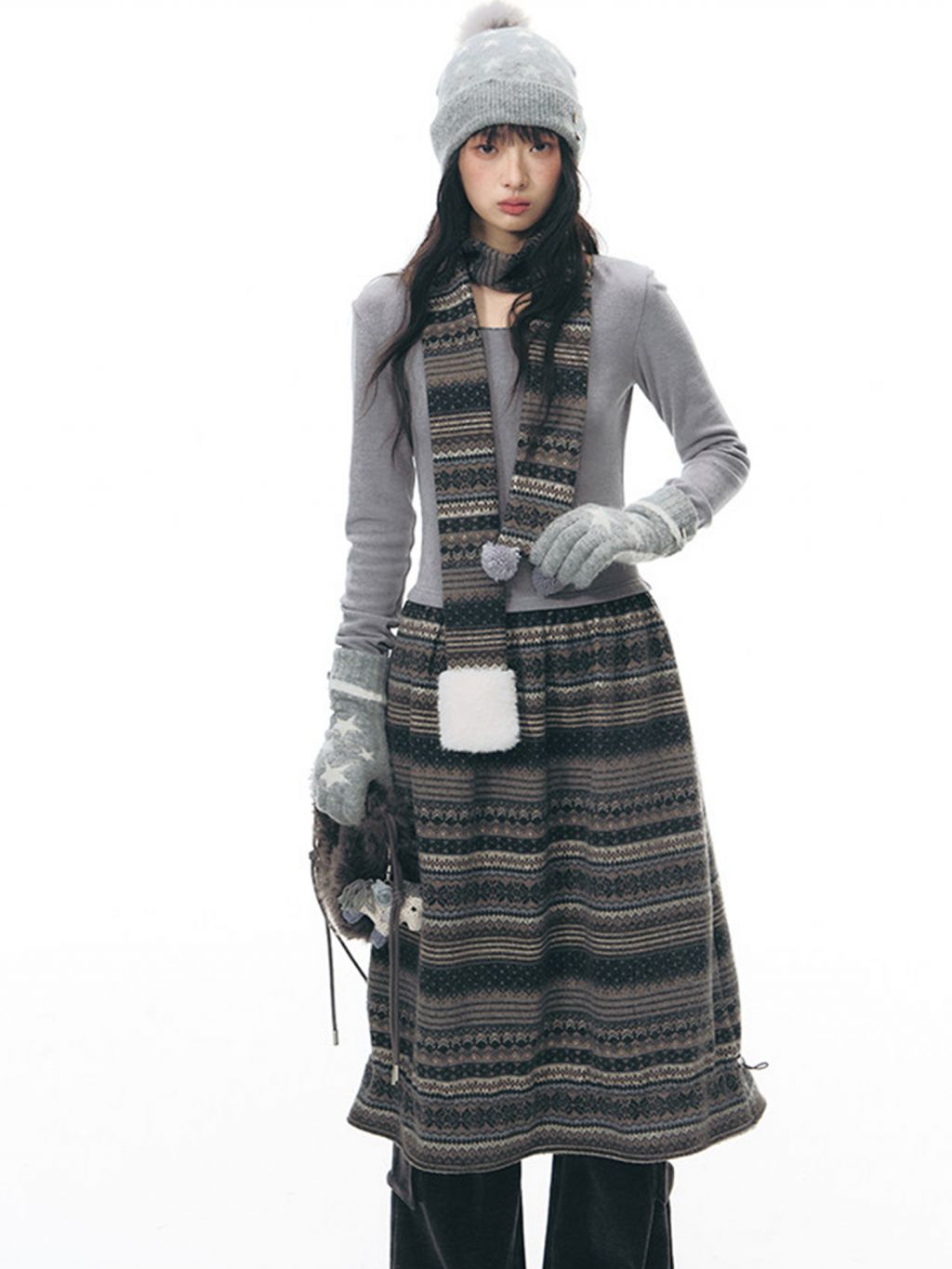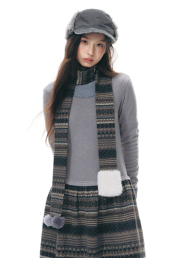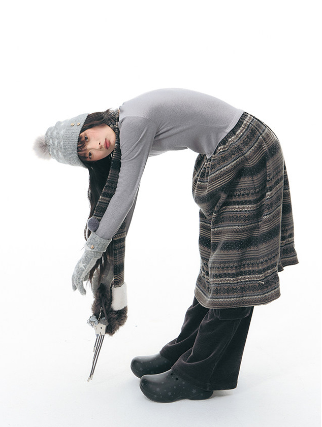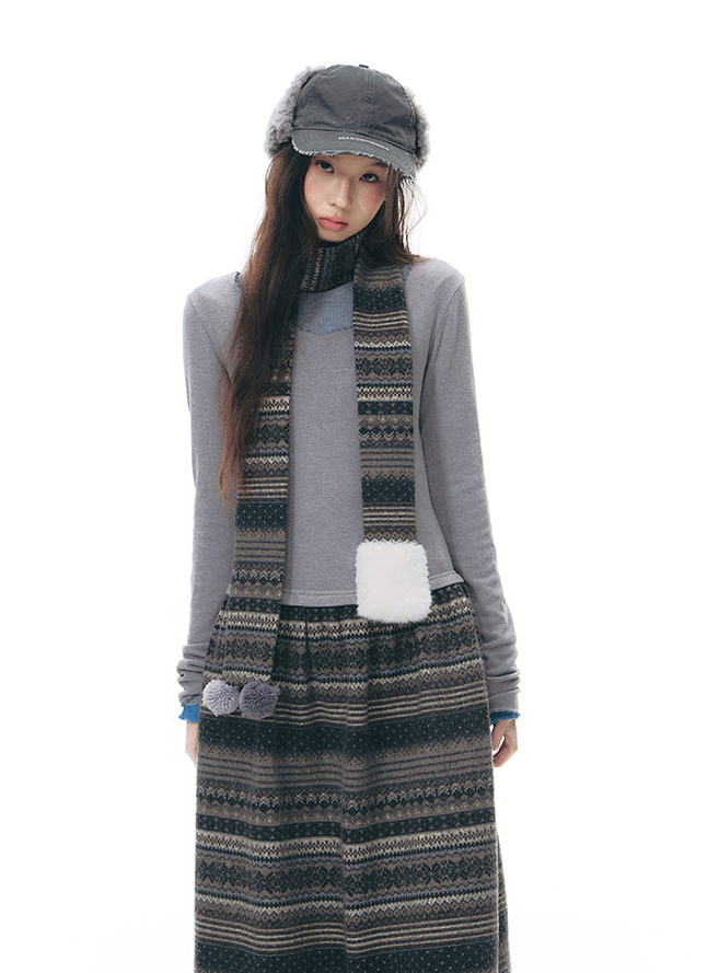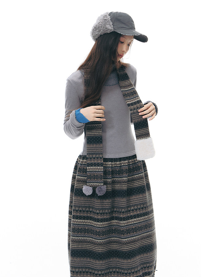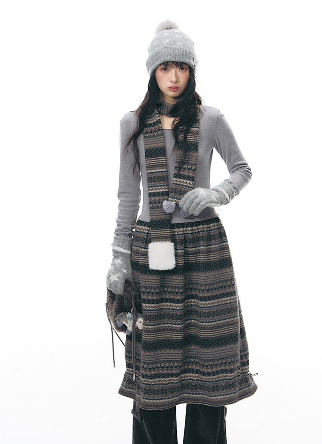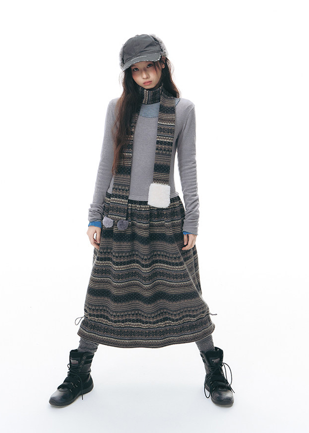 에스닉 패턴 니트 스커트와 미니멀한 상의 실루엣, 그리고 머플러가 조화를 이루는 겨울 무드의 니트 원피스 세트로 각각 단독으로도 활용할 수 있어 다양한 겨울 스타일링이 가능합니다.