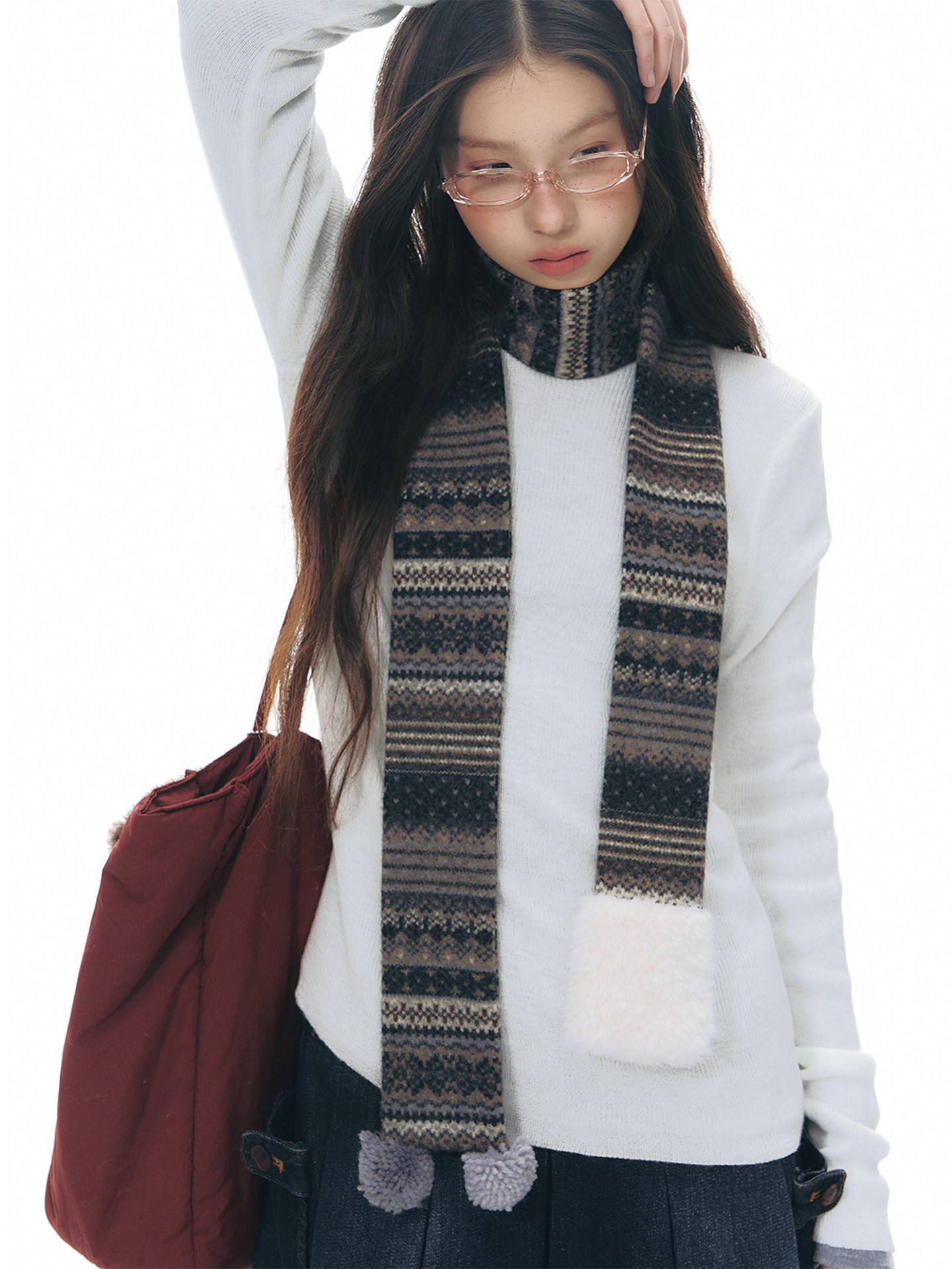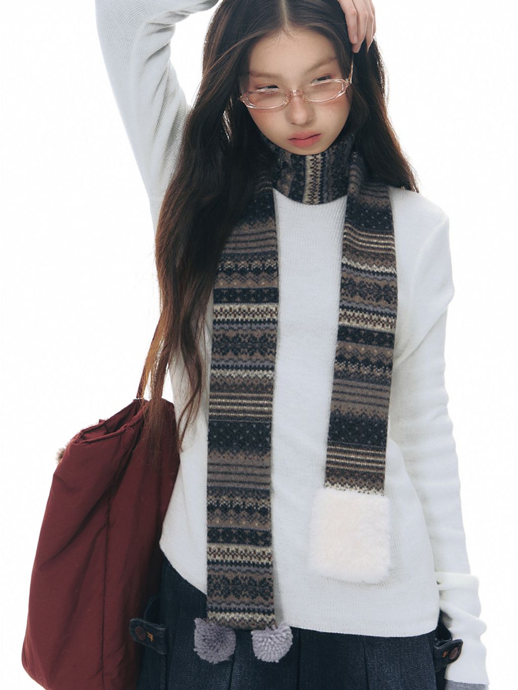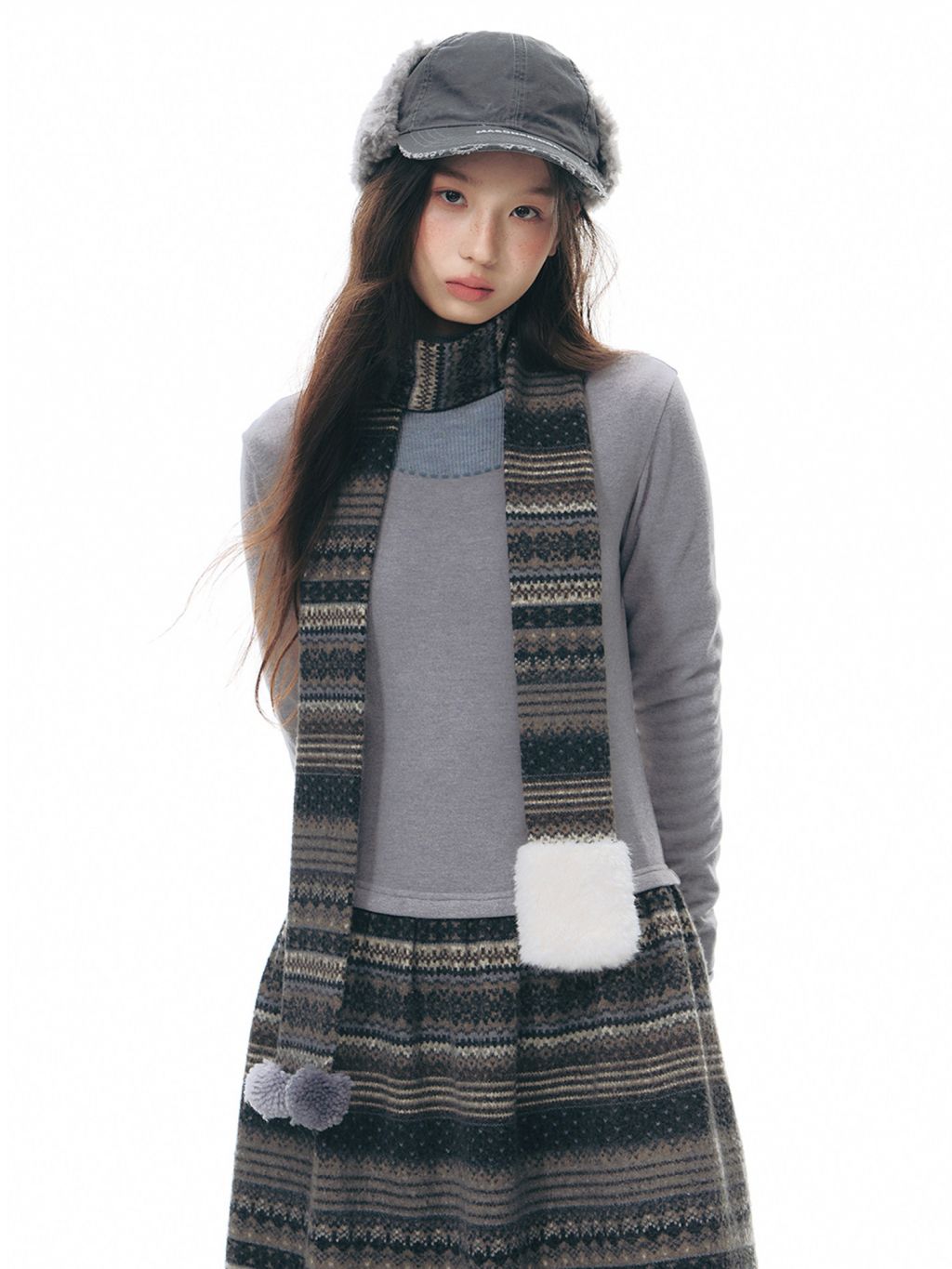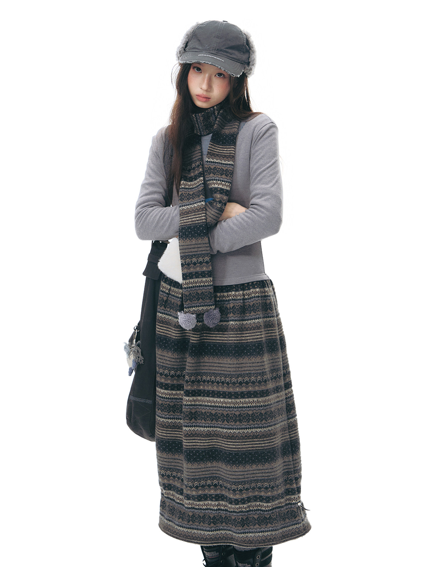 에스닉 패턴 니트 스커트와 미니멀한 상의 실루엣, 그리고 머플러가 조화를 이루는 겨울 무드의 니트 원피스 세트로 각각 단독으로도 활용할 수 있어 다양한 겨울 스타일링이 가능합니다.