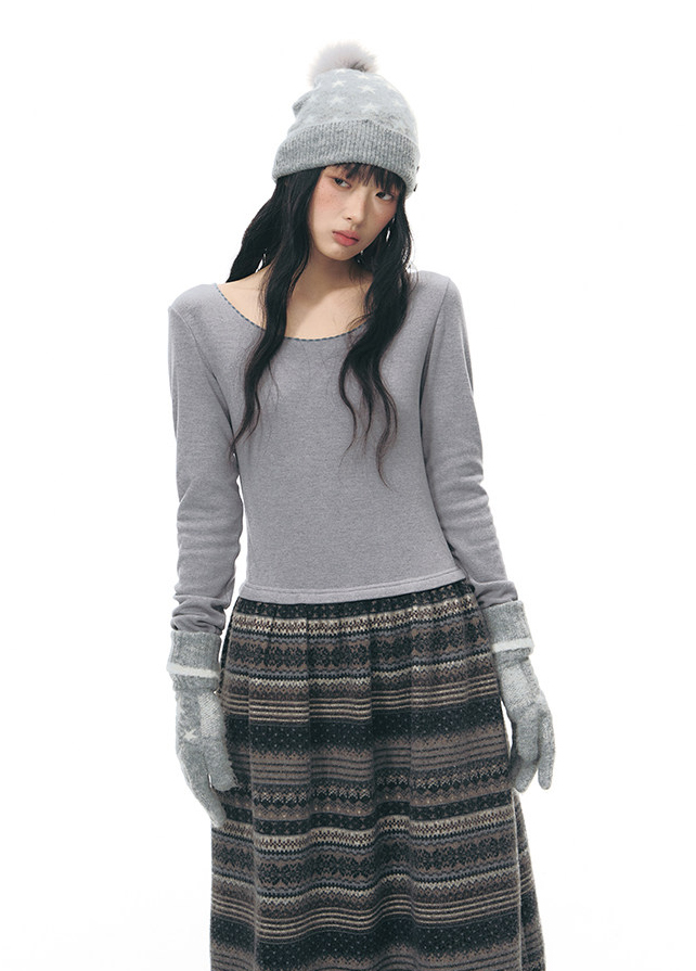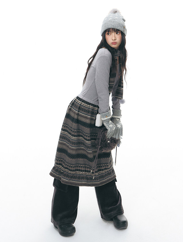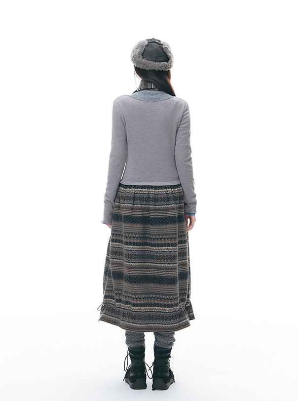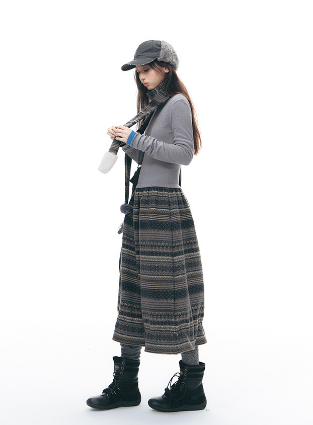 - 심플한 니트 상체와 에스닉 패턴 스커트가 조화를 이루는 원피스 디자인