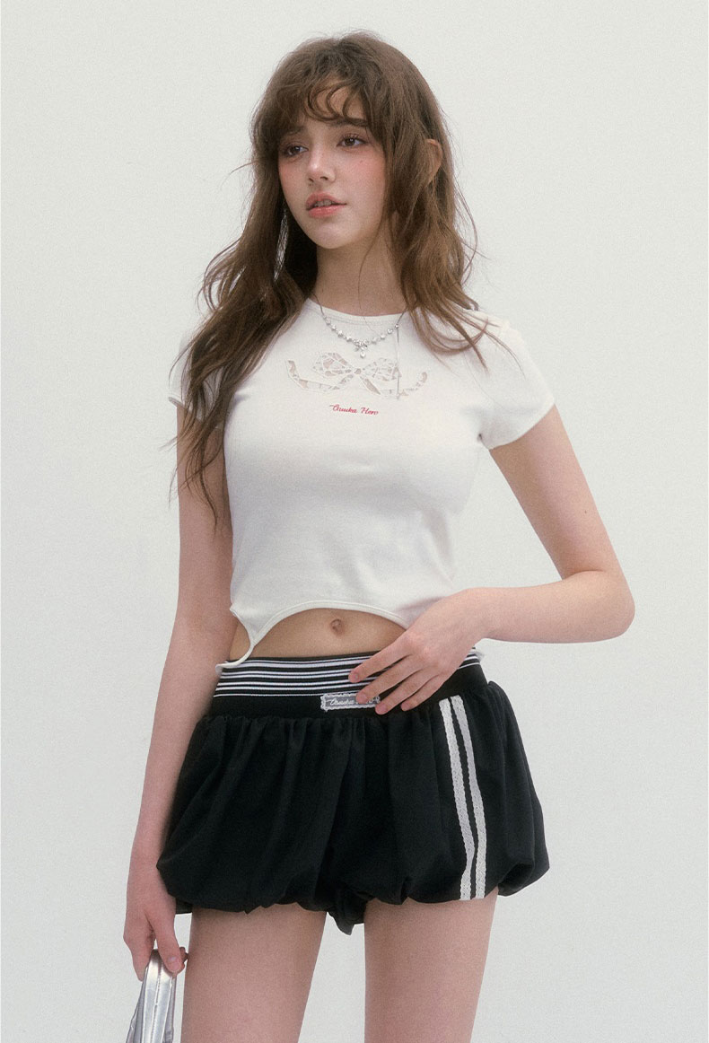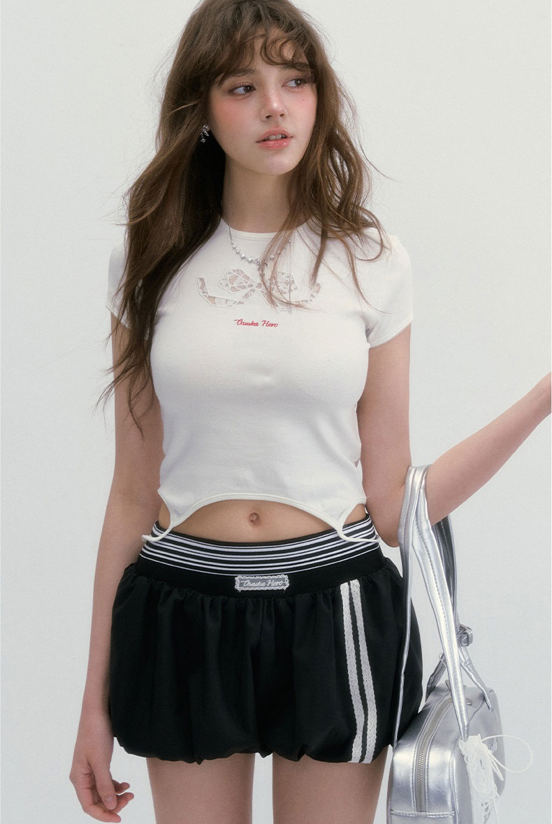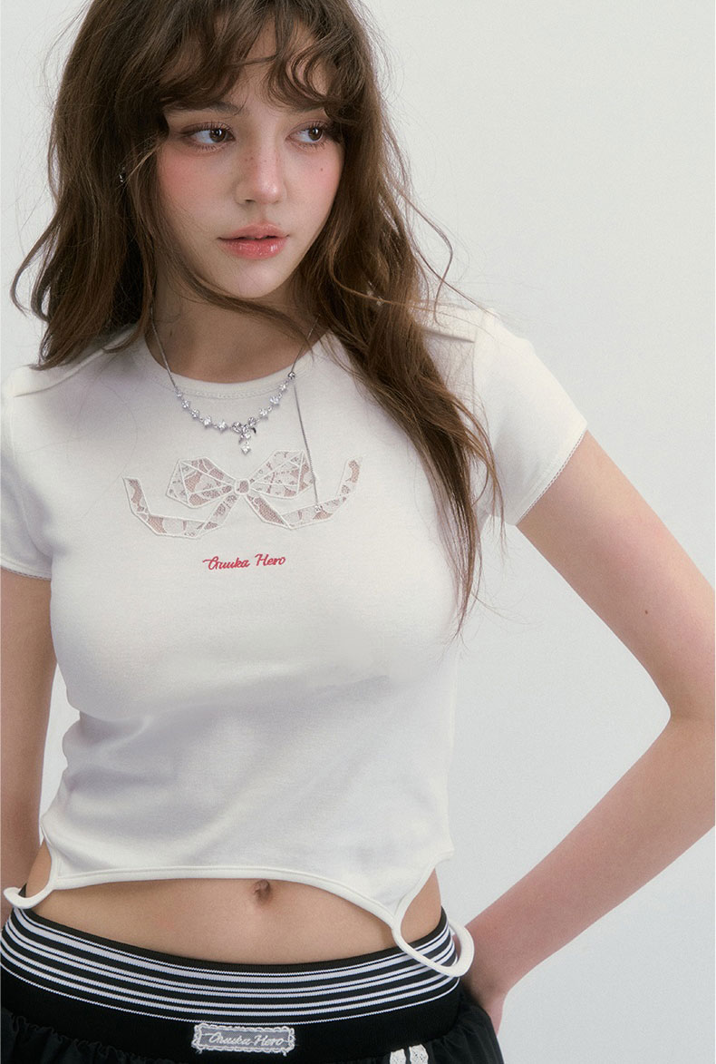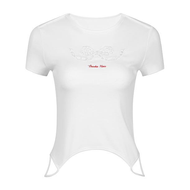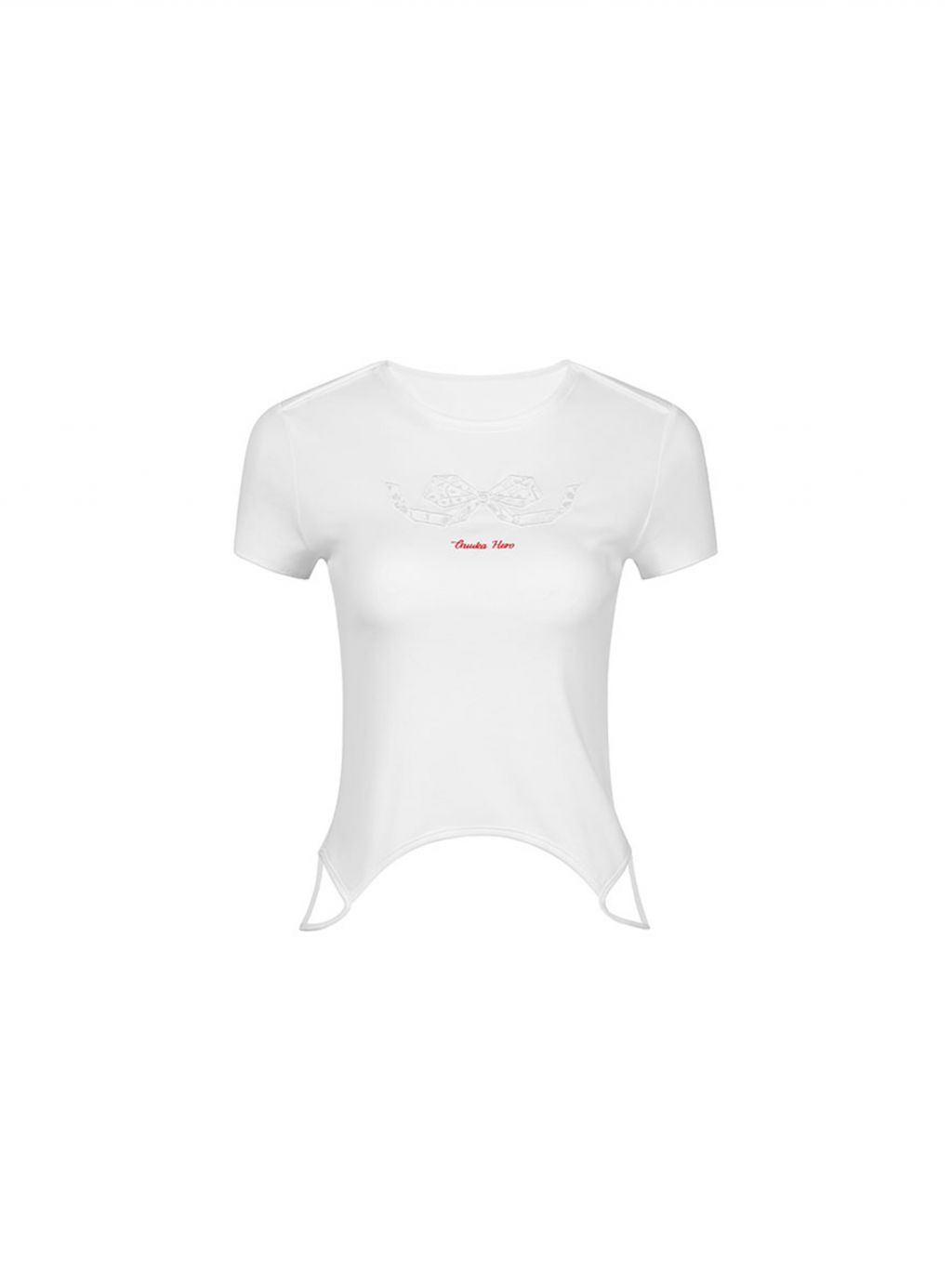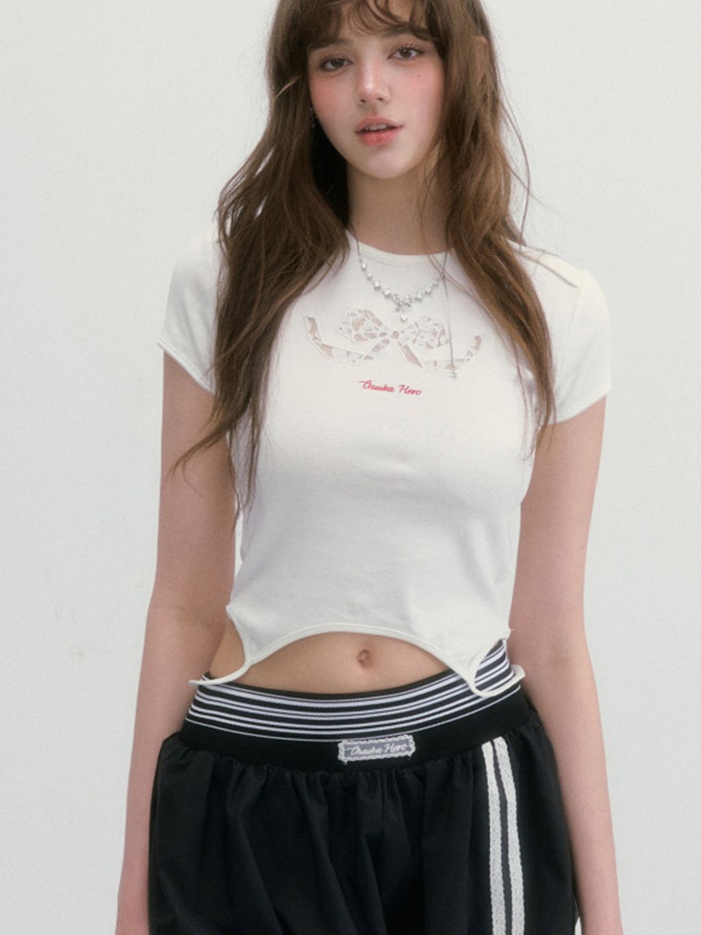 레이스 디테일의 리본 아트워크와 섬세한 레터링이 조화롭게 어우러진 디자인으로 허리 라인을 드러내는 비대칭 밑단 컷과 양옆 스트랩 포인트로 유니크한 무드를 연출해주며, 슬림한 실루엣으로 캐주얼하면서도 감각적인 스타일을 완성합니다.