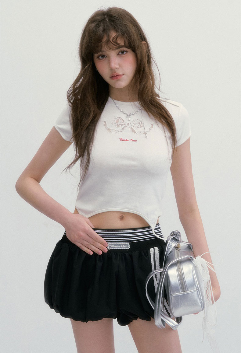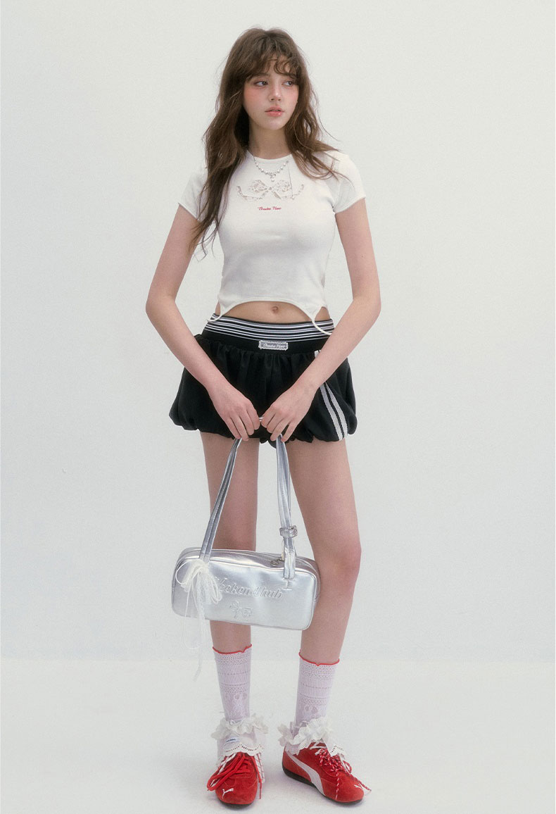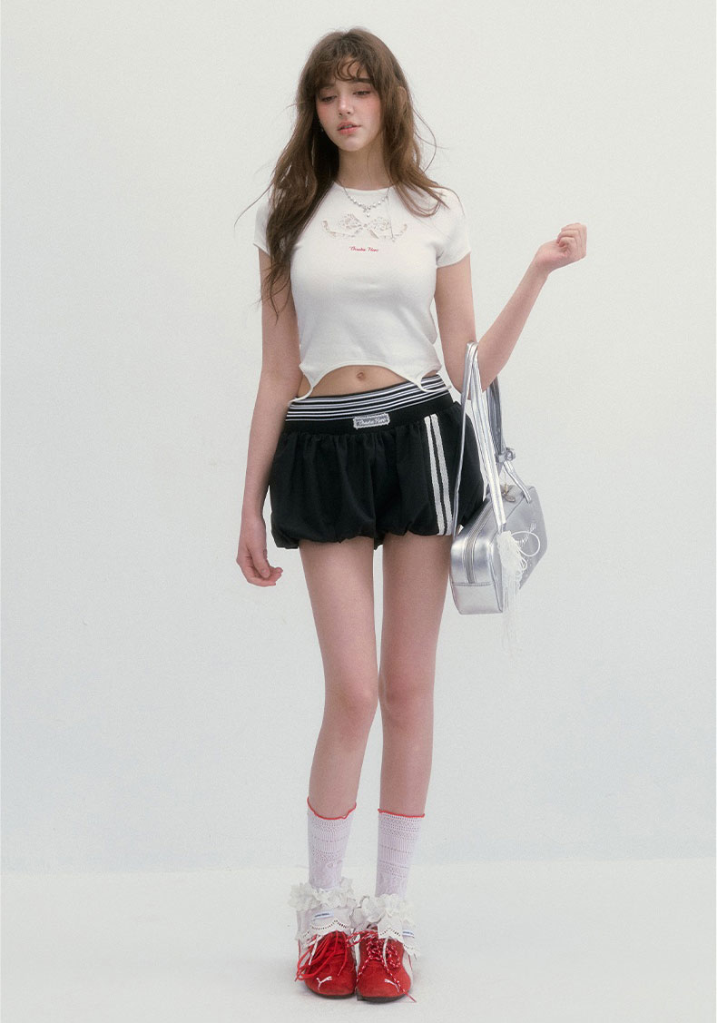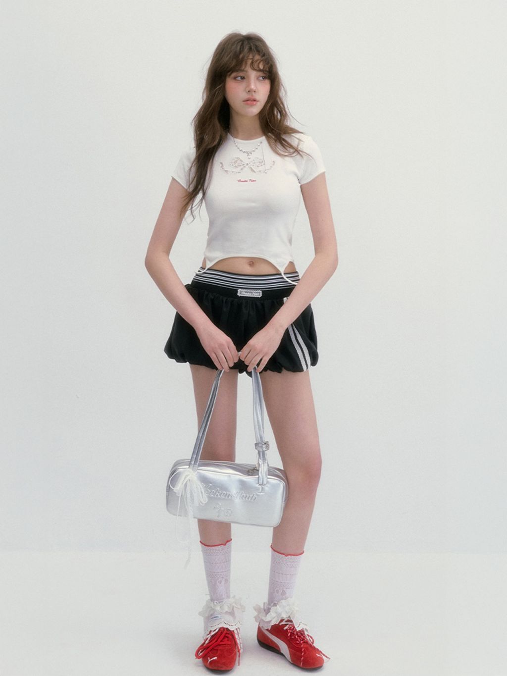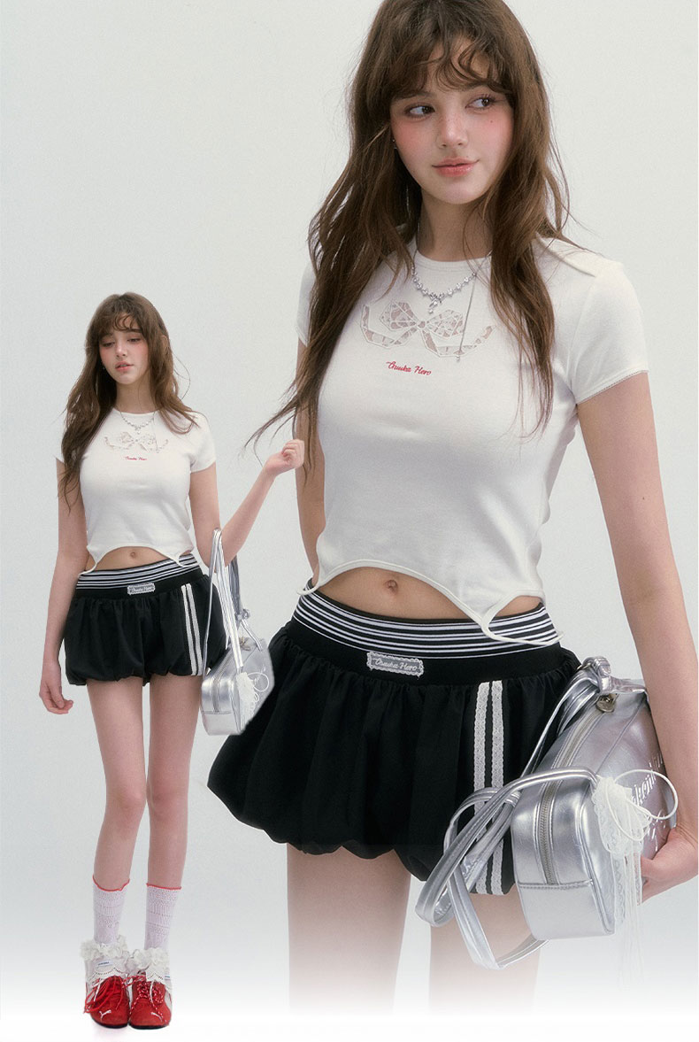 레이스 디테일의 리본 아트워크와 섬세한 레터링이 조화롭게 어우러진 디자인으로 허리 라인을 드러내는 비대칭 밑단 컷과 양옆 스트랩 포인트로 유니크한 무드를 연출해주며, 슬림한 실루엣으로 캐주얼하면서도 감각적인 스타일을 완성합니다.