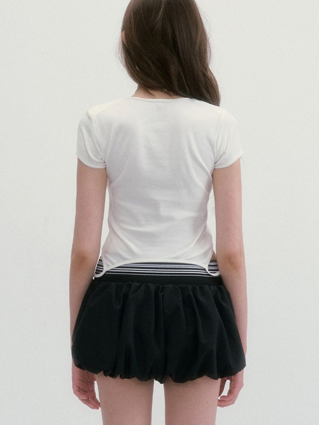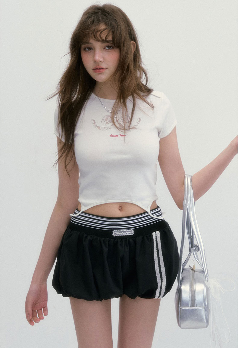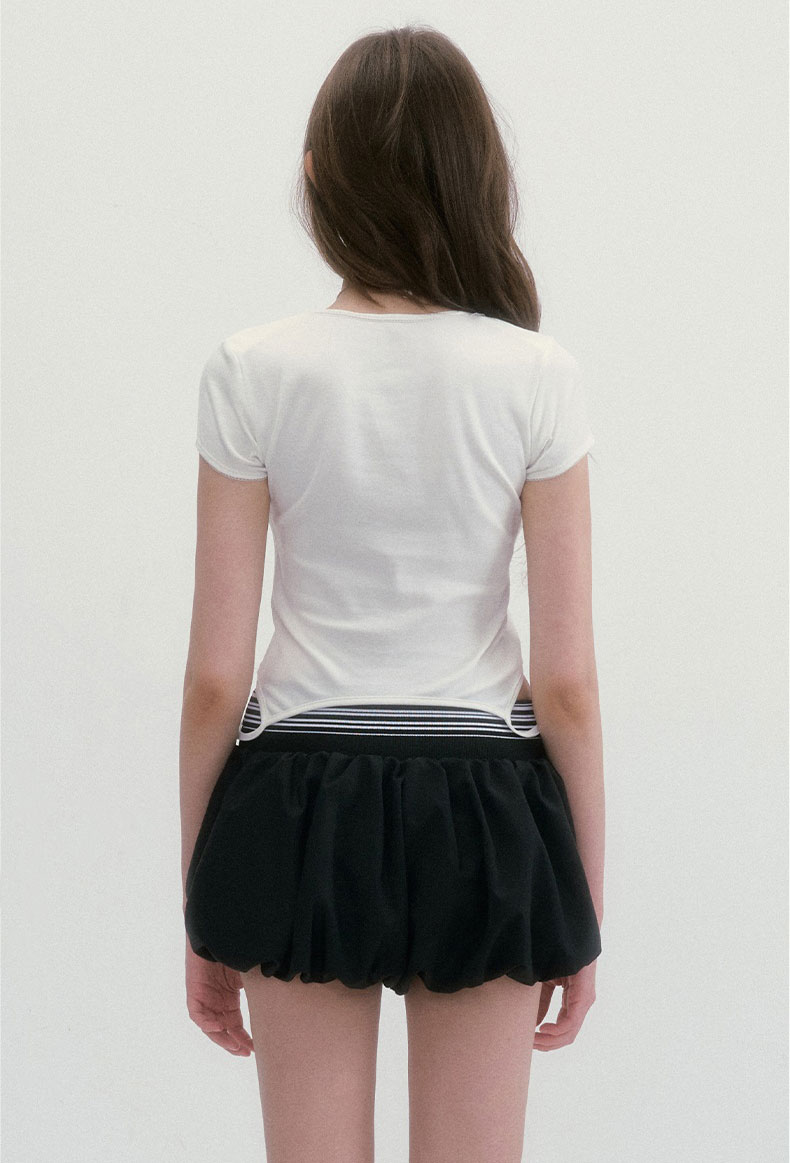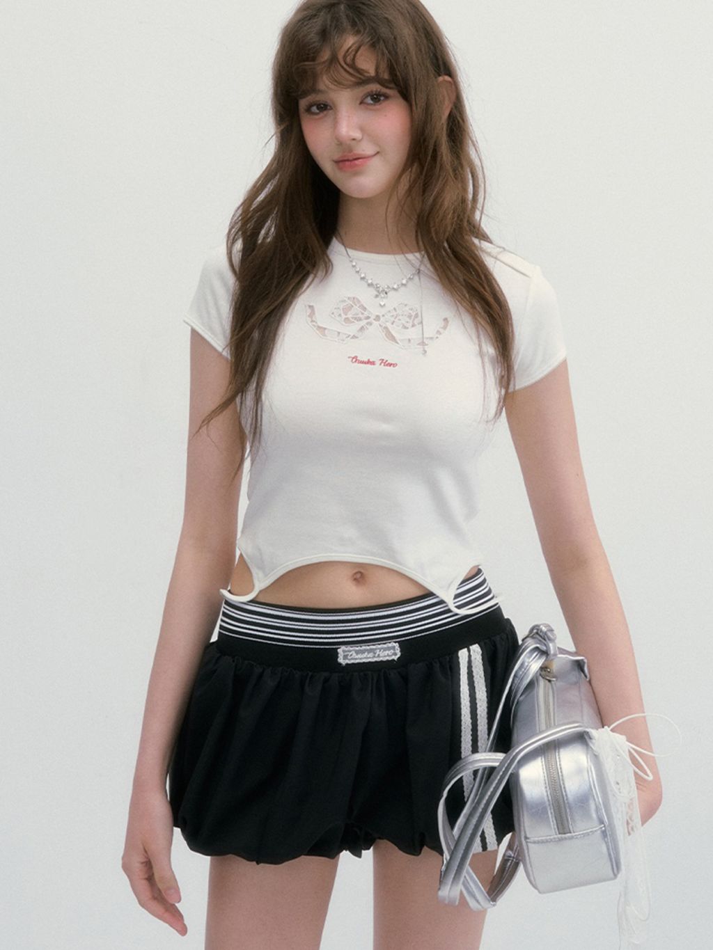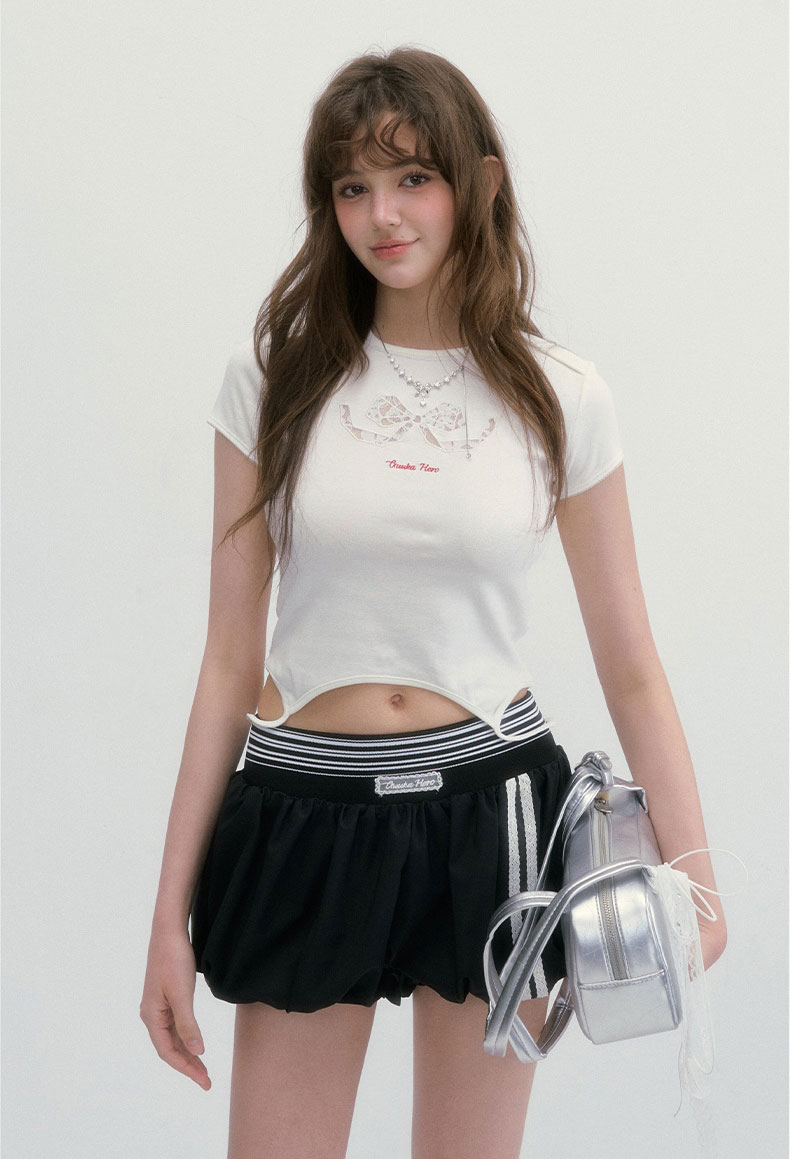 레이스 디테일의 리본 아트워크와 섬세한 레터링이 조화롭게 어우러진 디자인으로 허리 라인을 드러내는 비대칭 밑단 컷과 양옆 스트랩 포인트로 유니크한 무드를 연출해주며, 슬림한 실루엣으로 캐주얼하면서도 감각적인 스타일을 완성합니다.