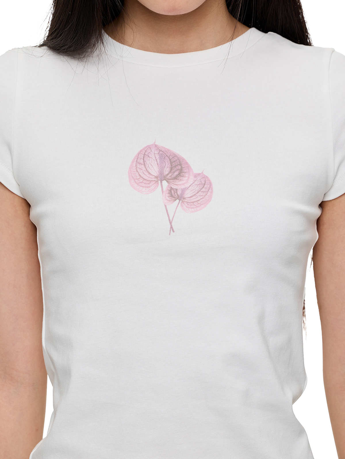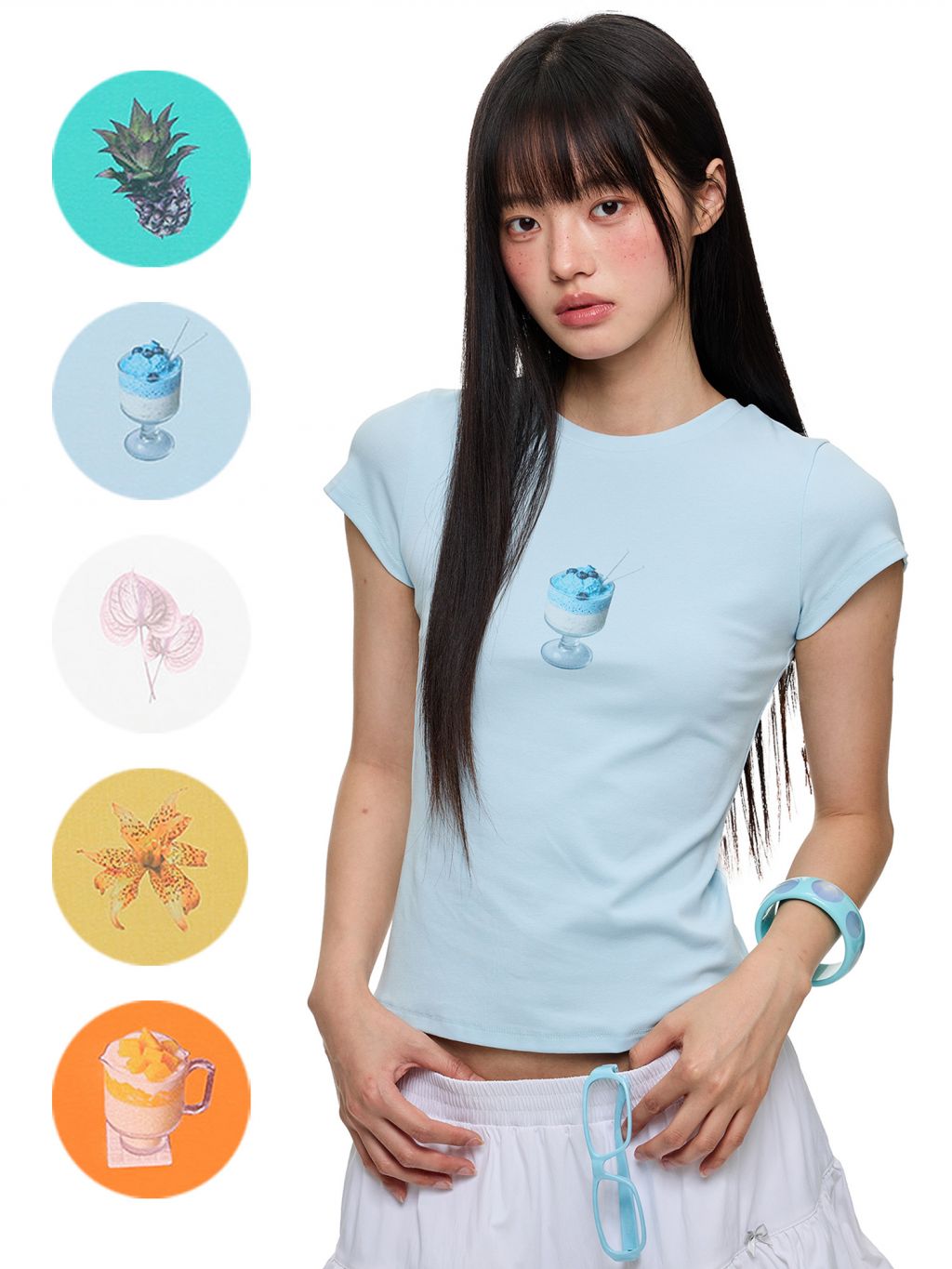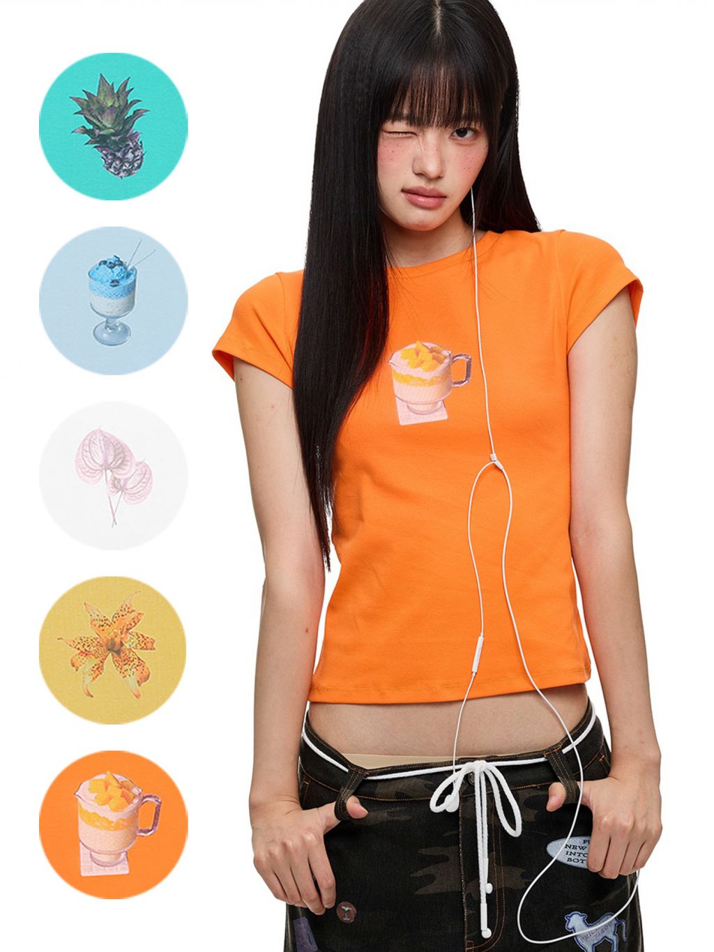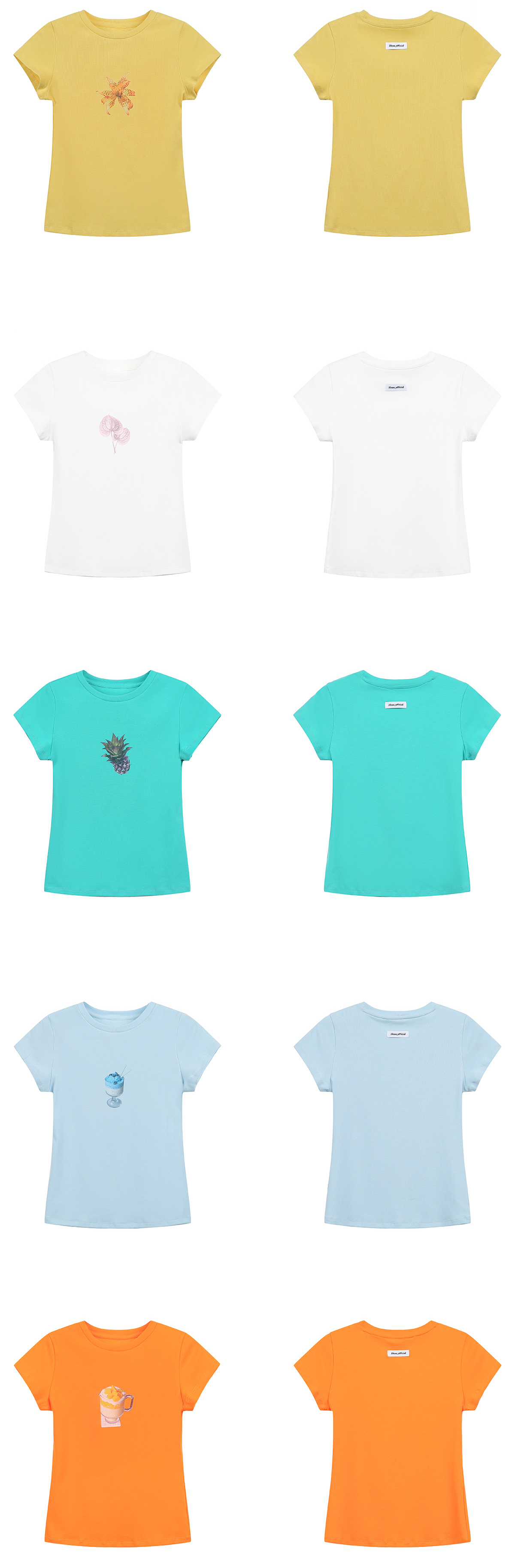 상큼한 프린팅과 컬러감이 돋보이는 여름 시즌 베이비핏 티셔츠로 쫀쫀한 코튼 원단과 슬림한 핏을 연출하며 아이스크림, 꽃, 과일 등 다섯 가지 키치한 프린트로 여름 무드를 가득 담았습니다.