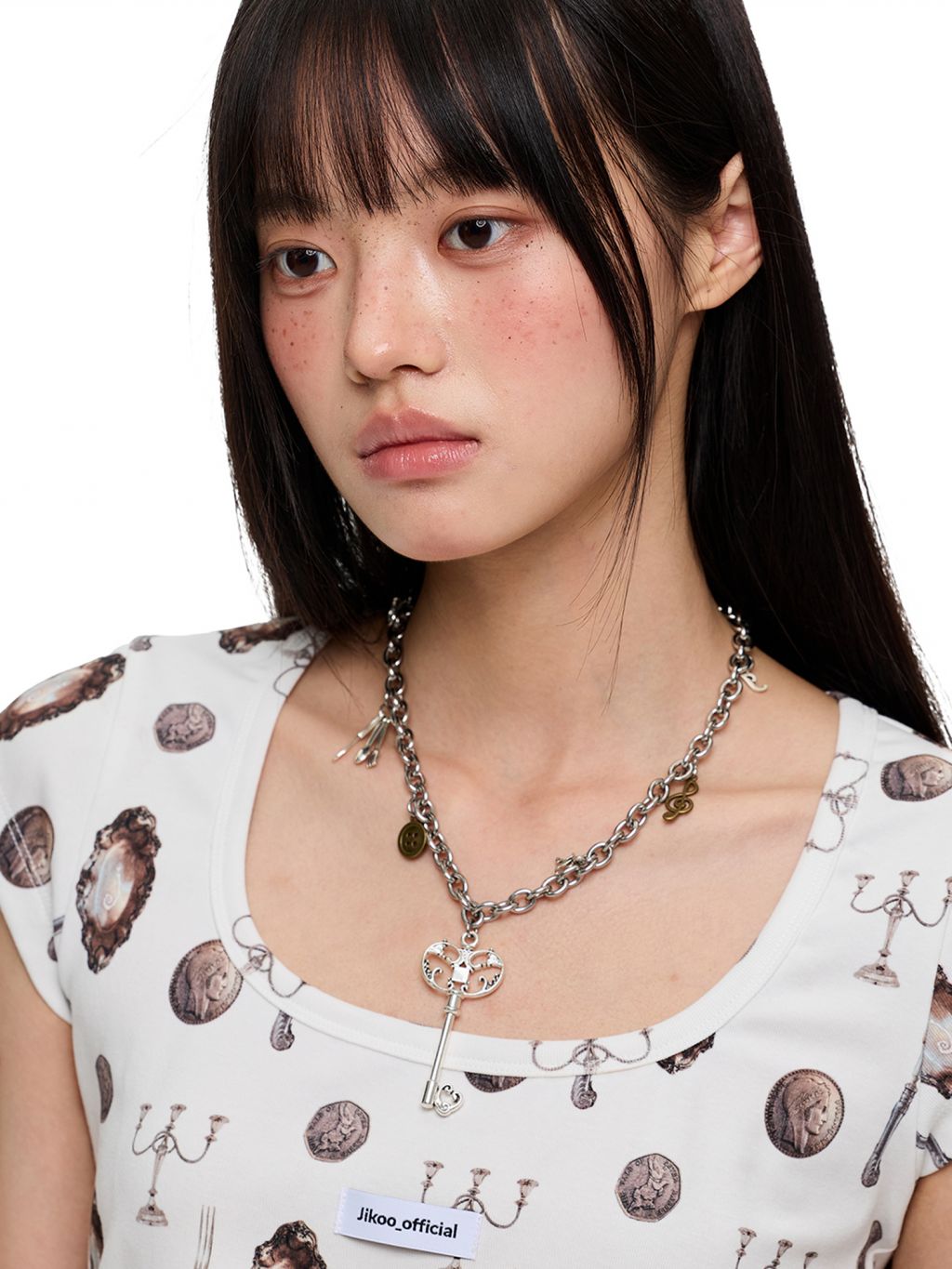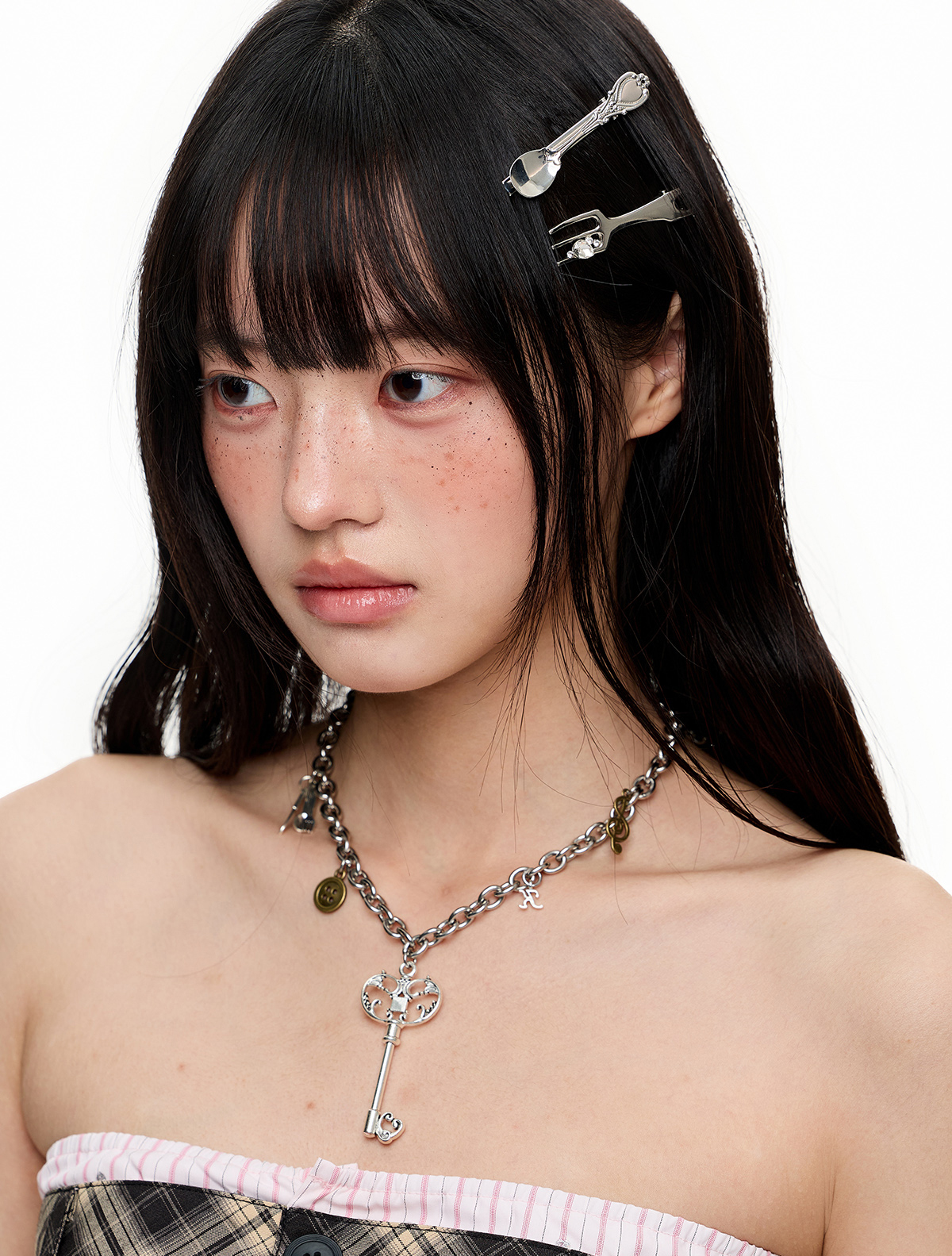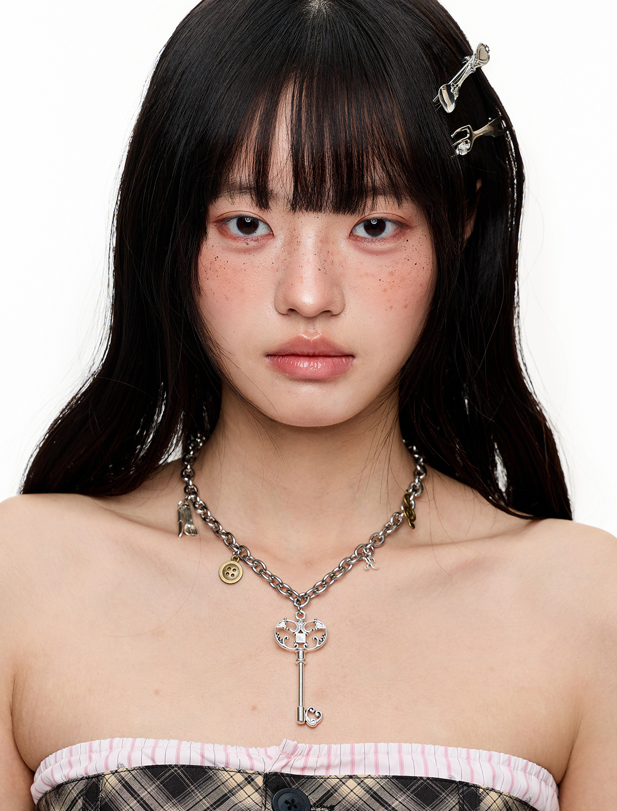 빈티지 키 모티브와 하트 자물쇠 포인트가 매력적인 키치 악세서리 시리즈로 볼드한 체인에 다양한 참 장식이 더해져 스타일에 개성을 더해주며 목걸이와 키링은 각각 단독으로 또는 셋트처럼 활용 가능합니다.