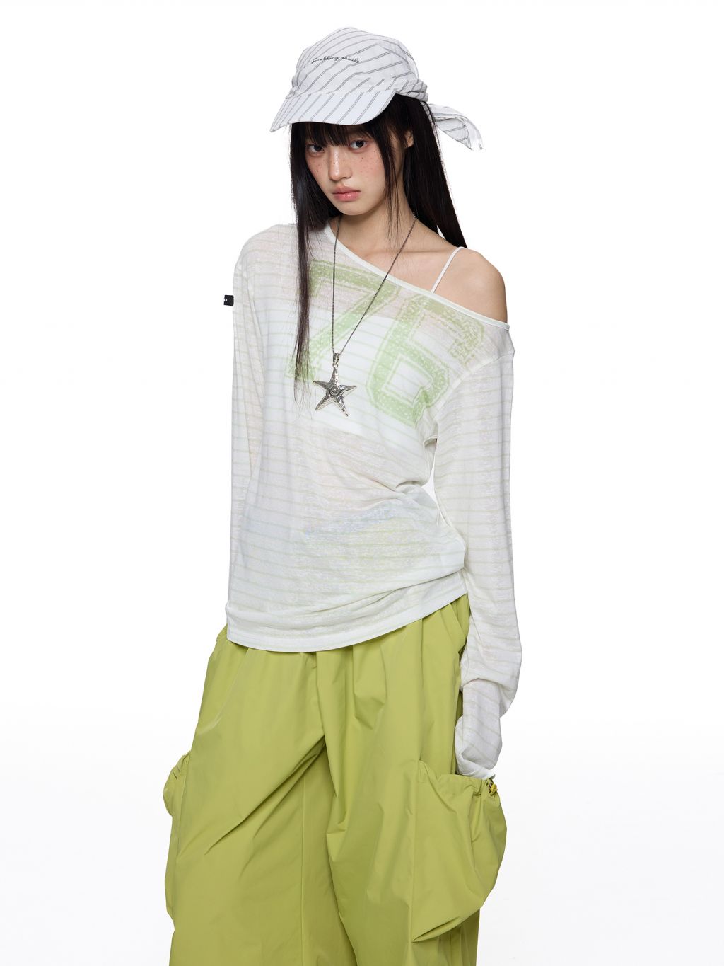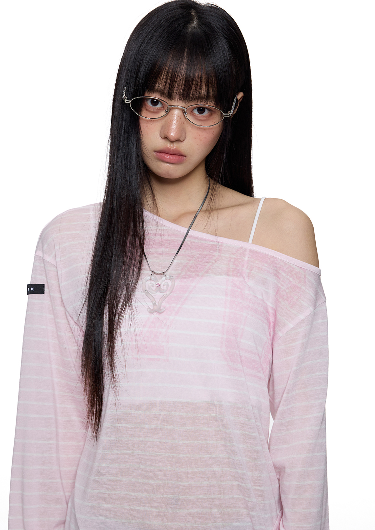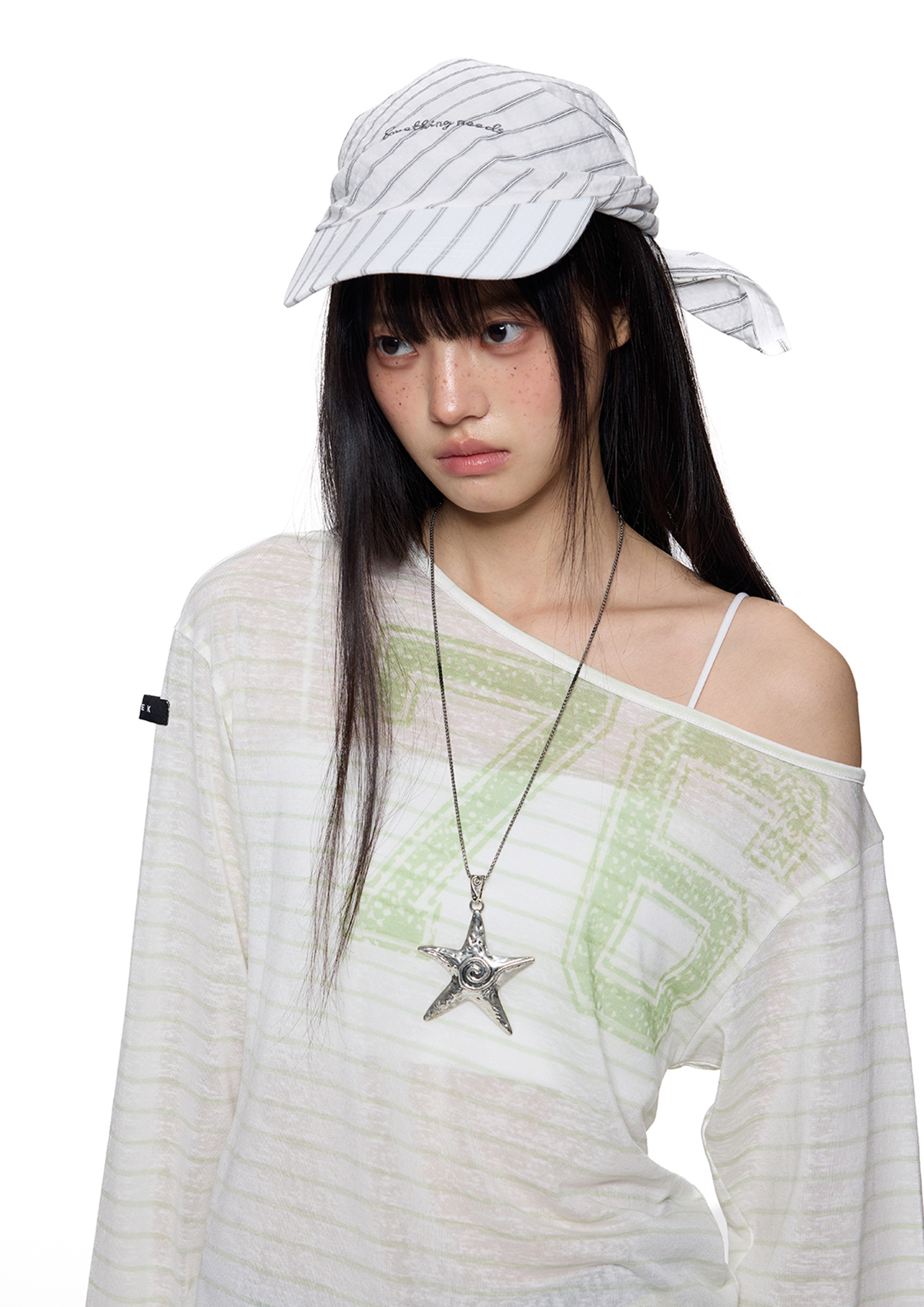 내추럴한 비침과 가벼운 터치감으로 완성한 썸머 무드 오프숄더로 루즈한 핏의 자연스러운 실루엣이 매력 포인트이며 스트라이프 패턴 위의 그래픽 포인트가 은은하게 시선을 끌어줍니다.