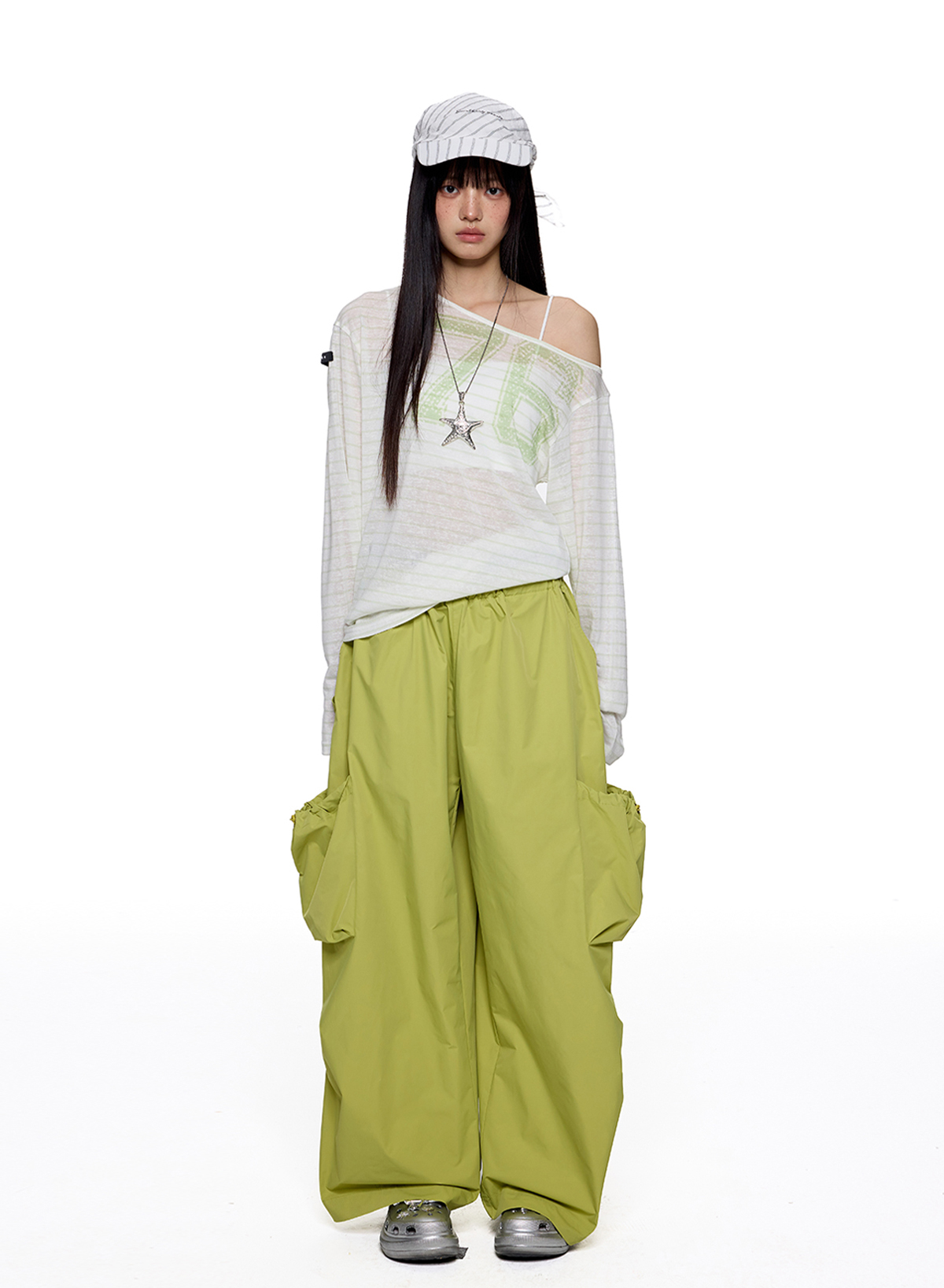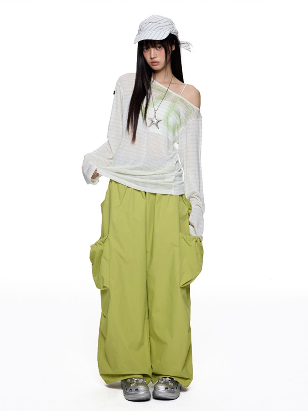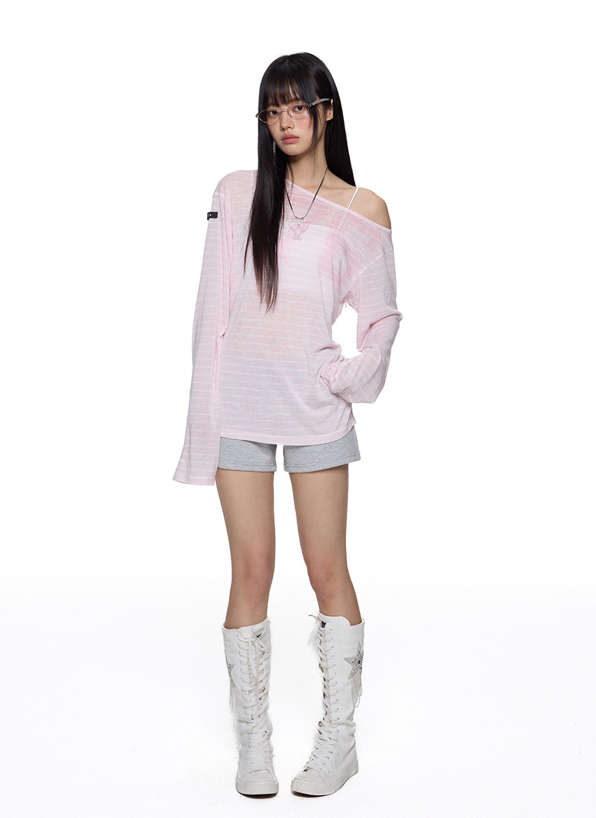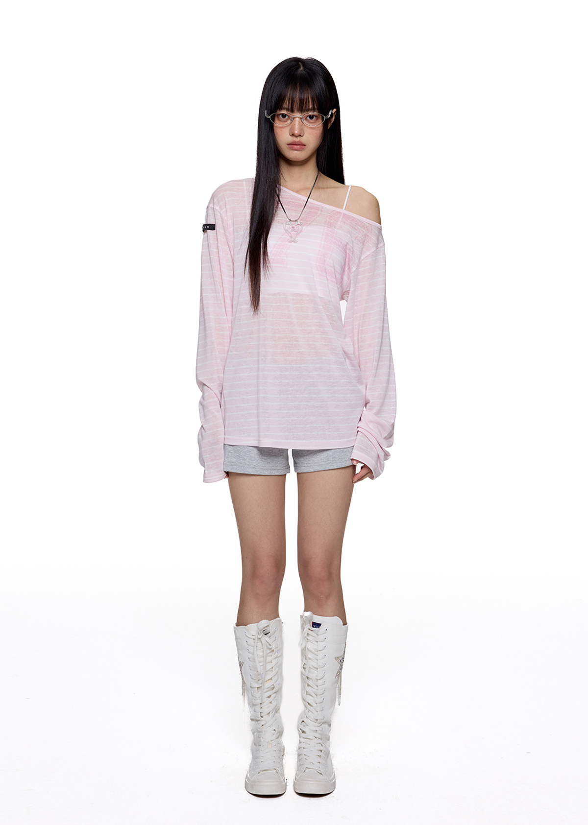 내추럴한 비침과 가벼운 터치감으로 완성한 썸머 무드 오프숄더로 루즈한 핏의 자연스러운 실루엣이 매력 포인트이며 스트라이프 패턴 위의 그래픽 포인트가 은은하게 시선을 끌어줍니다.
