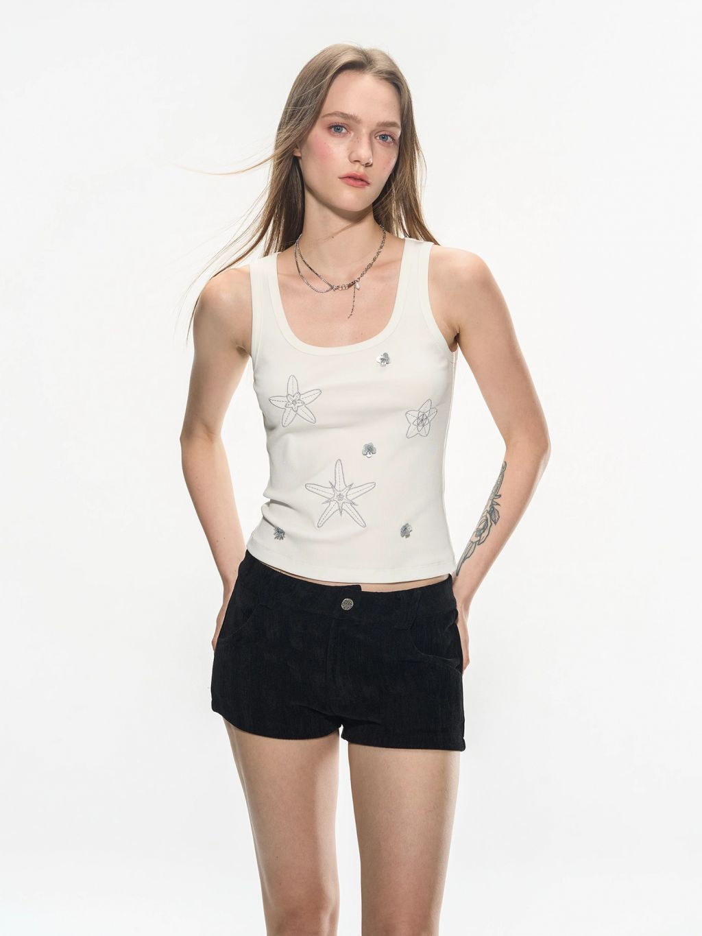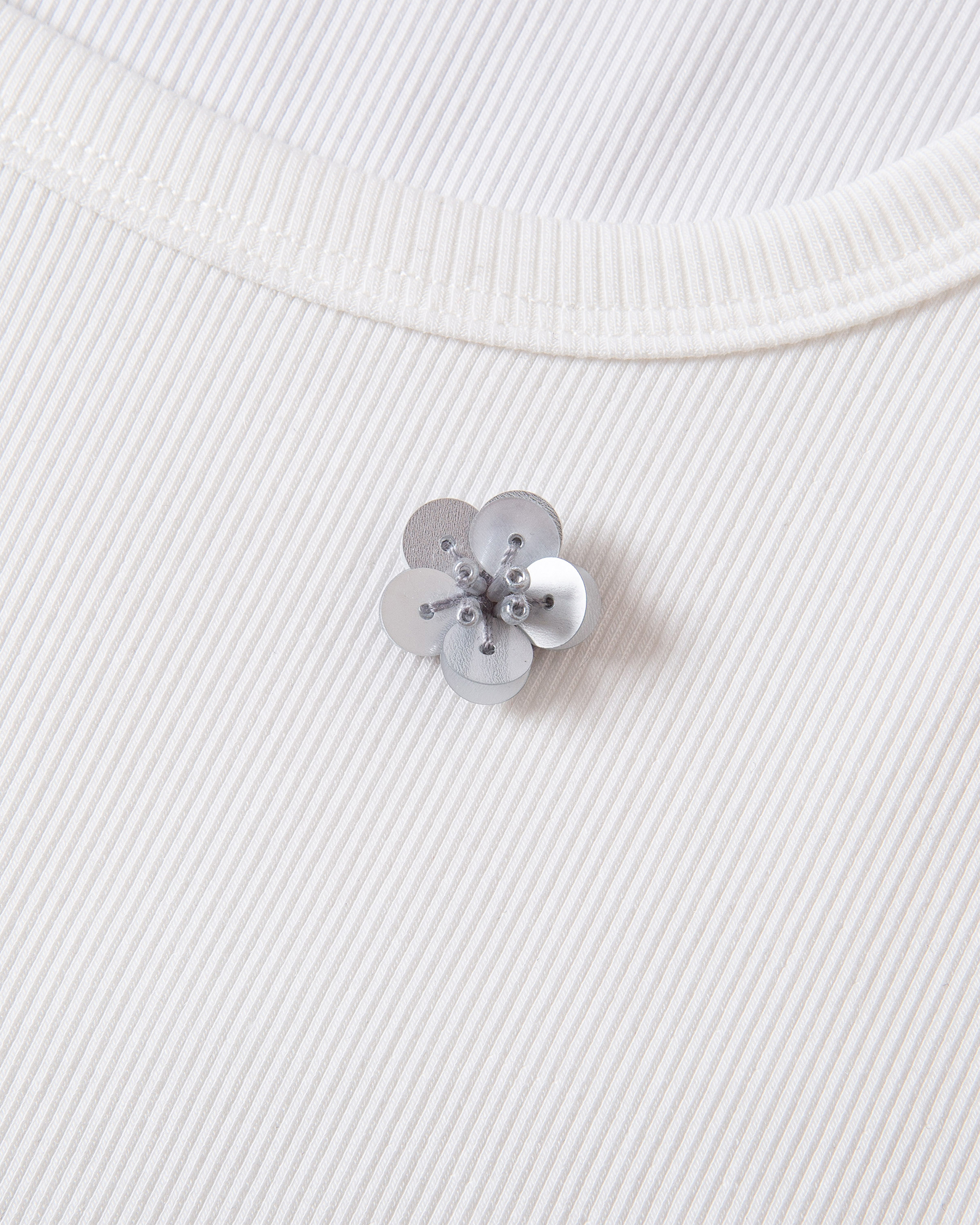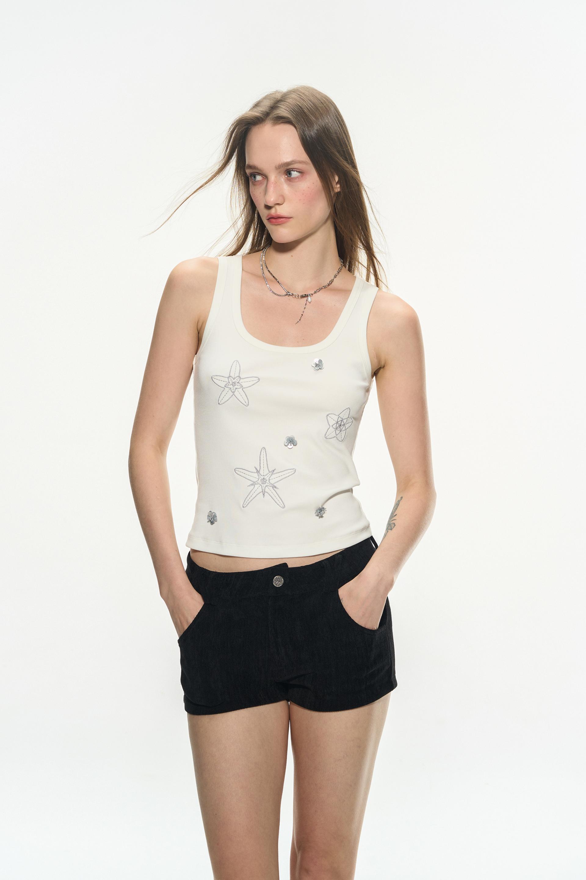 별모양 플라워 자수와 은은한 스팽글이 어우러진 썸머 탱크탑으로 넓은 어깨끈과 안정적인 암홀 라인은 상체 실루엣을 깔끔하게 정돈해주며 밑단으로 갈수록 살짝 퍼지는 곡선 라인이 허리를 잘록하게 강조해 줍니다. 쇄골 라인을 시원하게 드러내는 U넥 디자인까지 여리하면서도 단단한 실루엣이 돋보이는 아이템입니다.