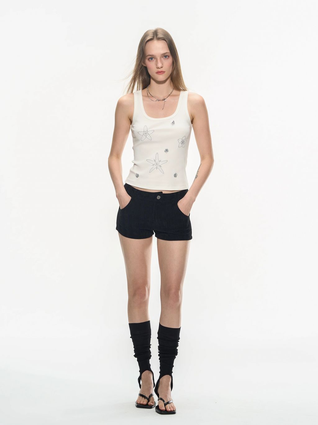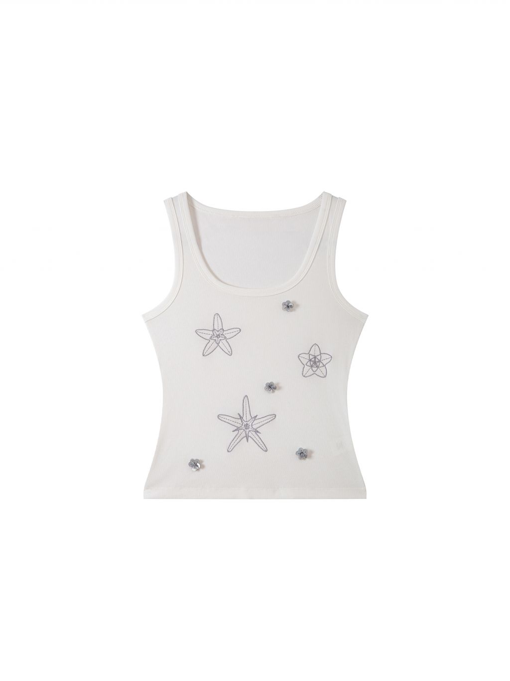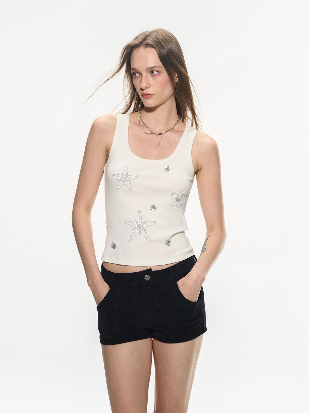 별모양 플라워 자수와 은은한 스팽글이 어우러진 썸머 탱크탑으로 넓은 어깨끈과 안정적인 암홀 라인은 상체 실루엣을 깔끔하게 정돈해주며 밑단으로 갈수록 살짝 퍼지는 곡선 라인이 허리를 잘록하게 강조해 줍니다. 쇄골 라인을 시원하게 드러내는 U넥 디자인까지 여리하면서도 단단한 실루엣이 돋보이는 아이템입니다.