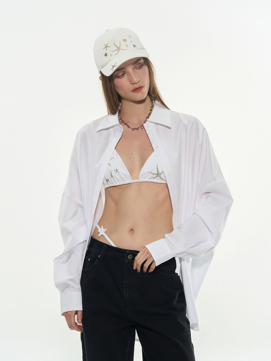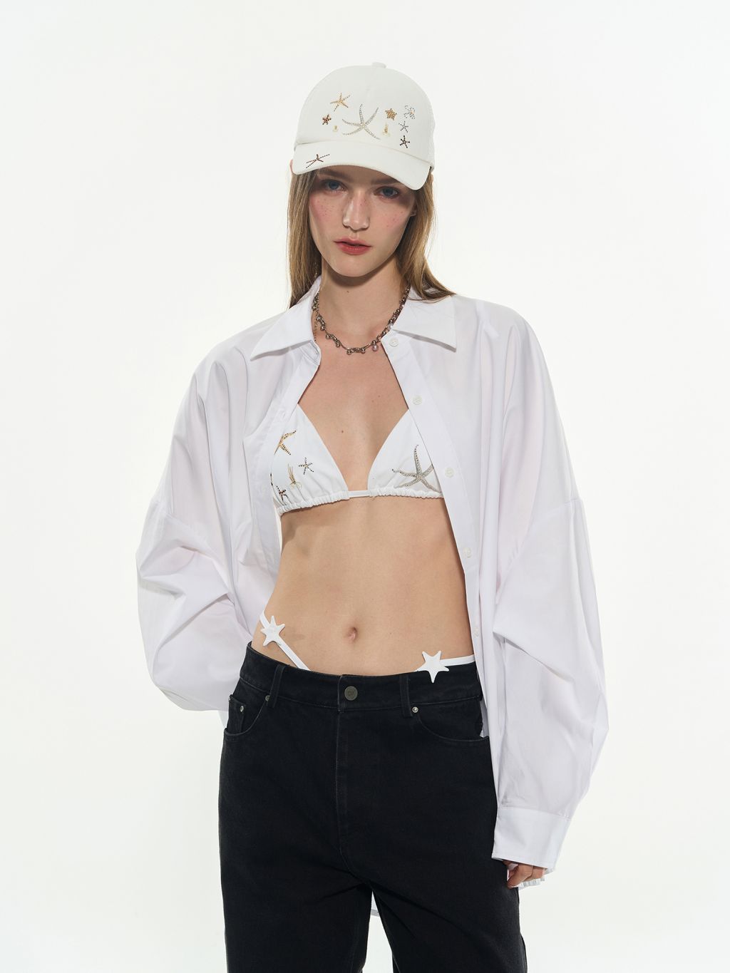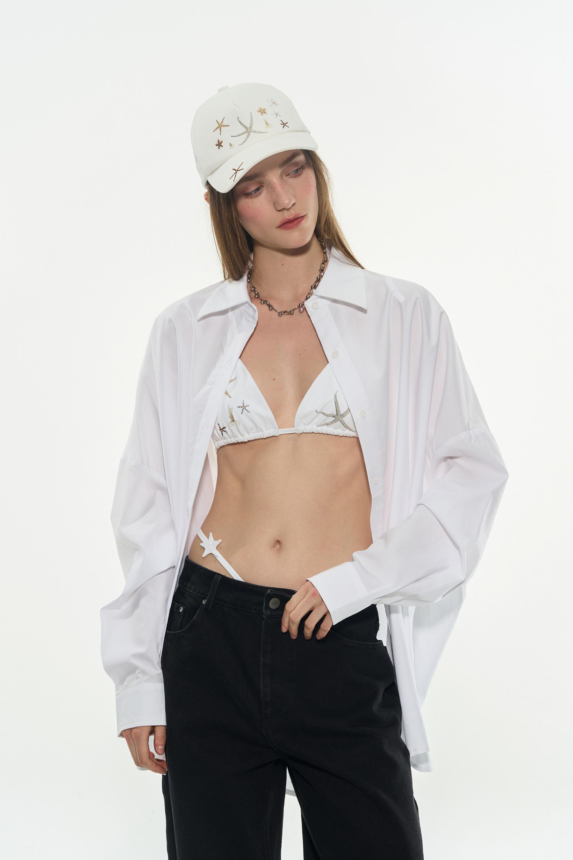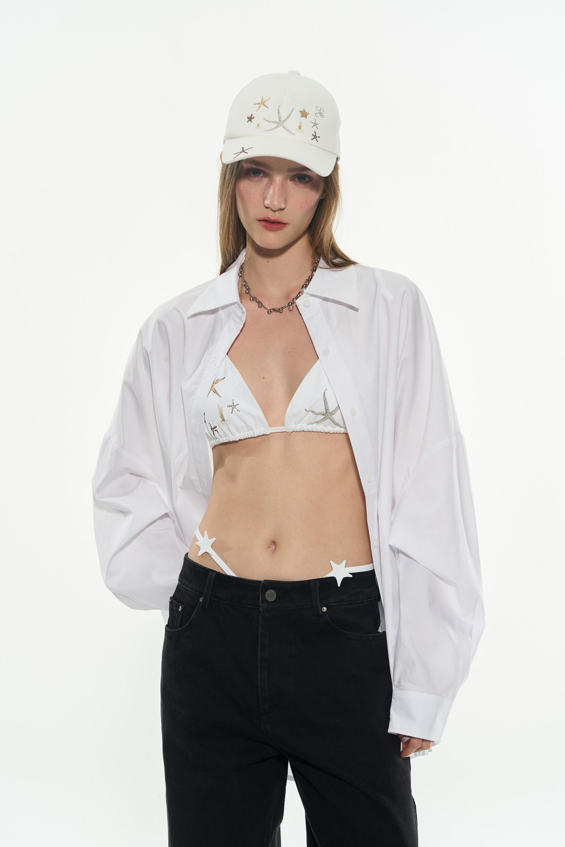 바다의 행운을 담은 듯한 스타피시 자수가 인상적인 비키니 세트로 별 모양 스트랩과 반짝이는 장식이 포인트가 되어 유니크한 여름 룩을 완성해주며 단독으로도, 셔츠나 시스루 아이템과 레이어드해도 감각적인 스타일링이 가능합니다.