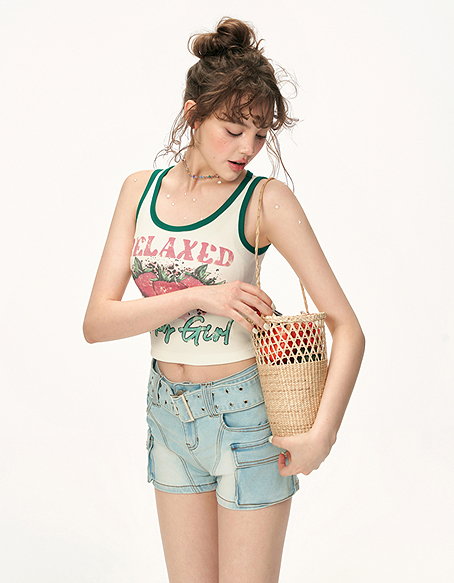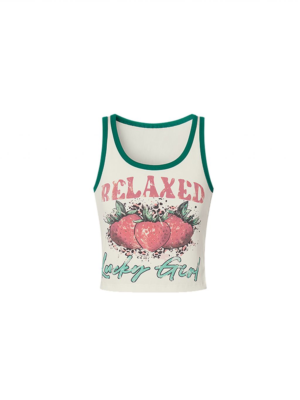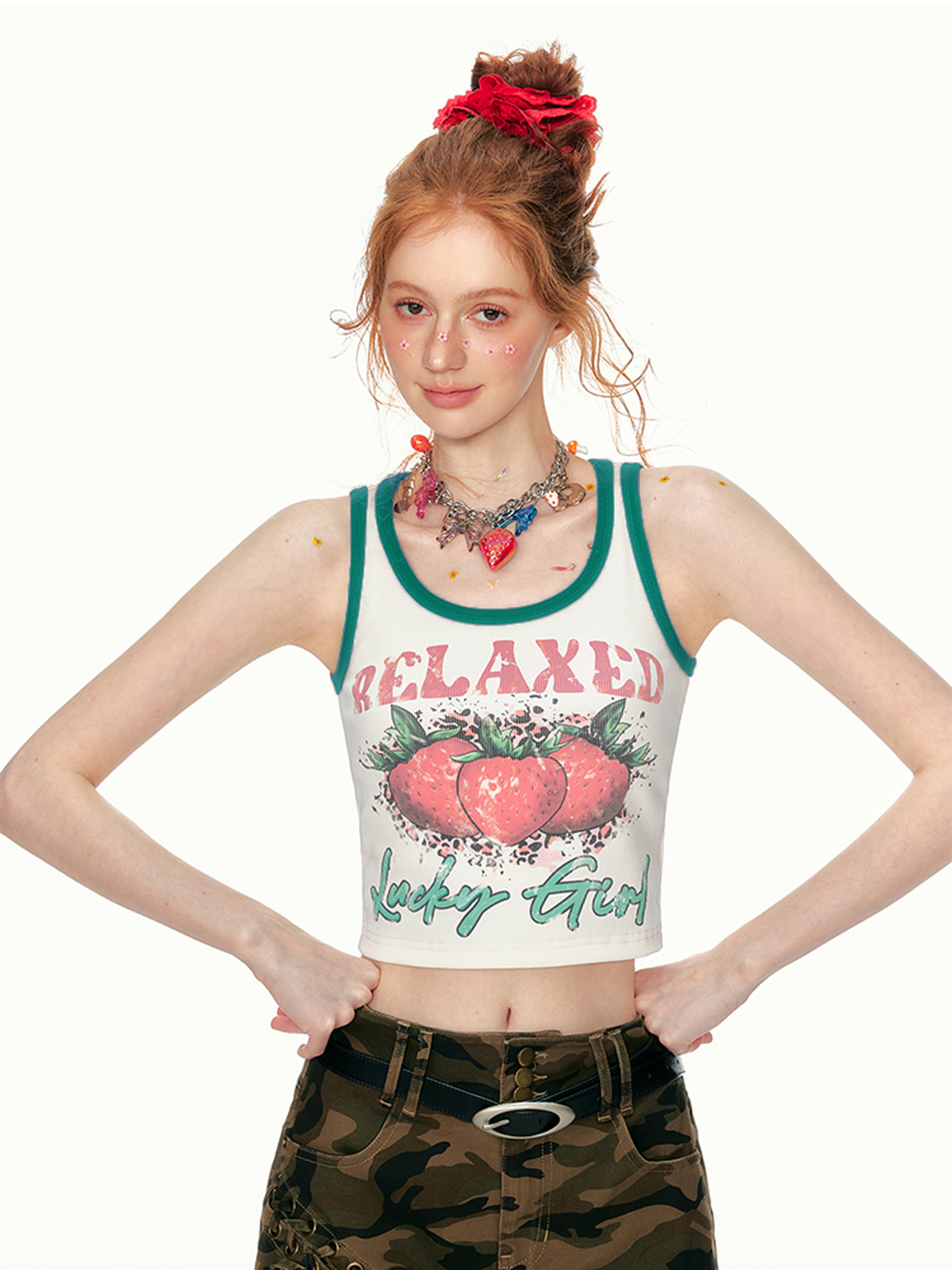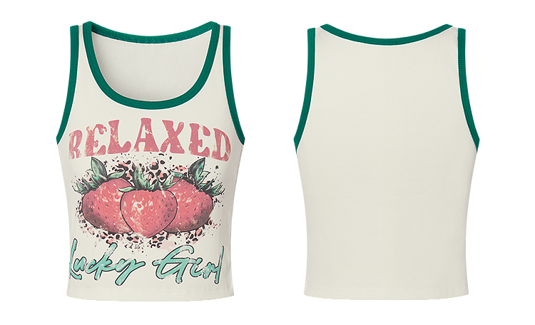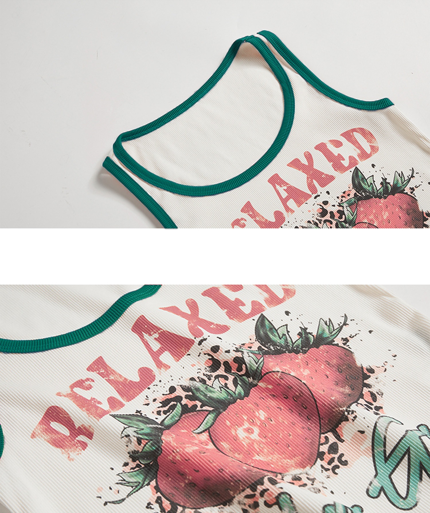 귀여운 딸기 프린트와 레터링으로 상큼함이 가득한 크롭 탱크탑으로 바인딩 컬러 포인트와 짧은 기장감은 러블리하면서도 Y2K 무드를 살려줍니다. 얇고 신축성 있는 골지 원단으로 가볍게 착용할 수 있으며 숏팬츠나 미니스커트와 함께 키치한 썸머룩을 완성합니다.