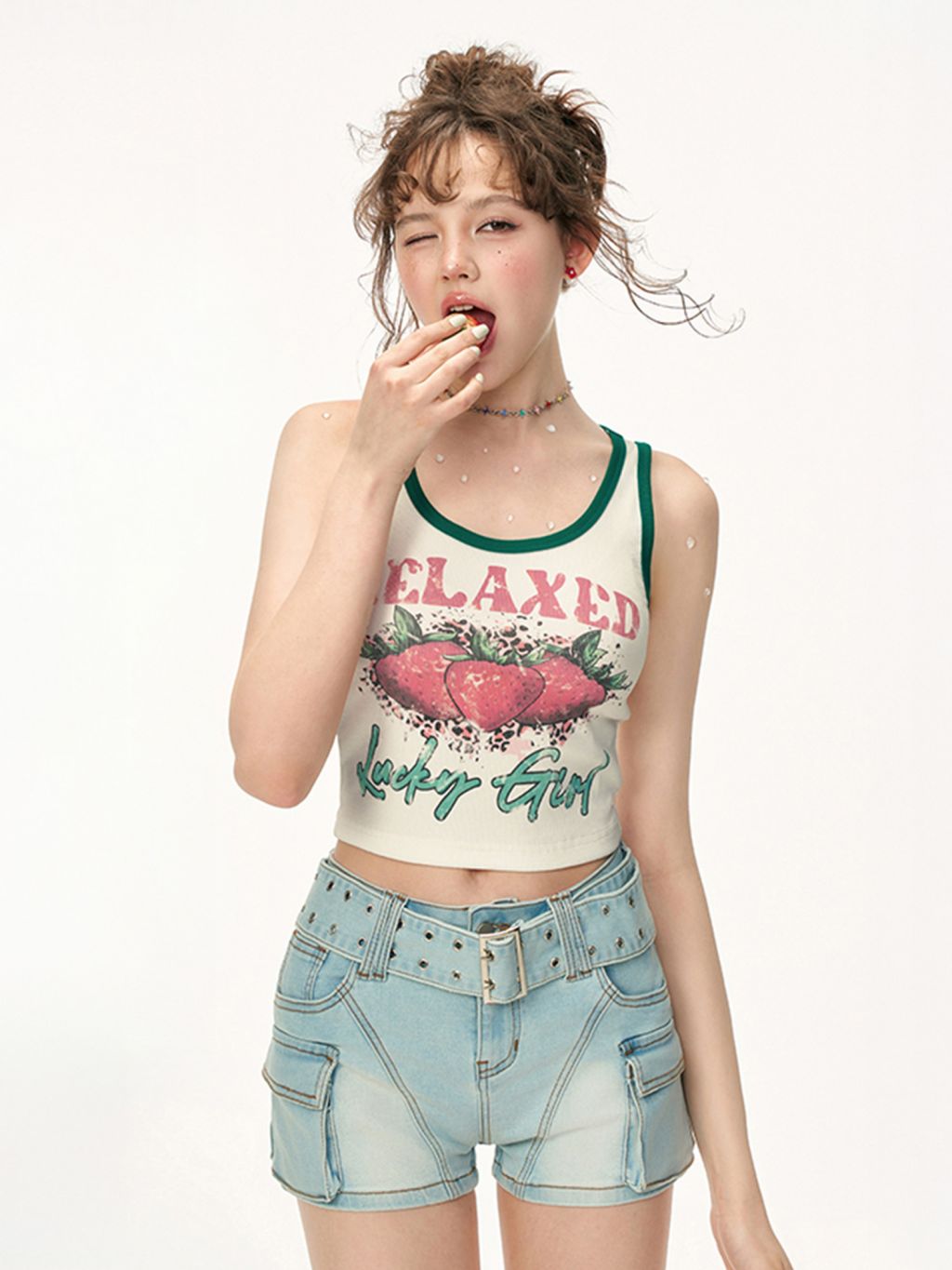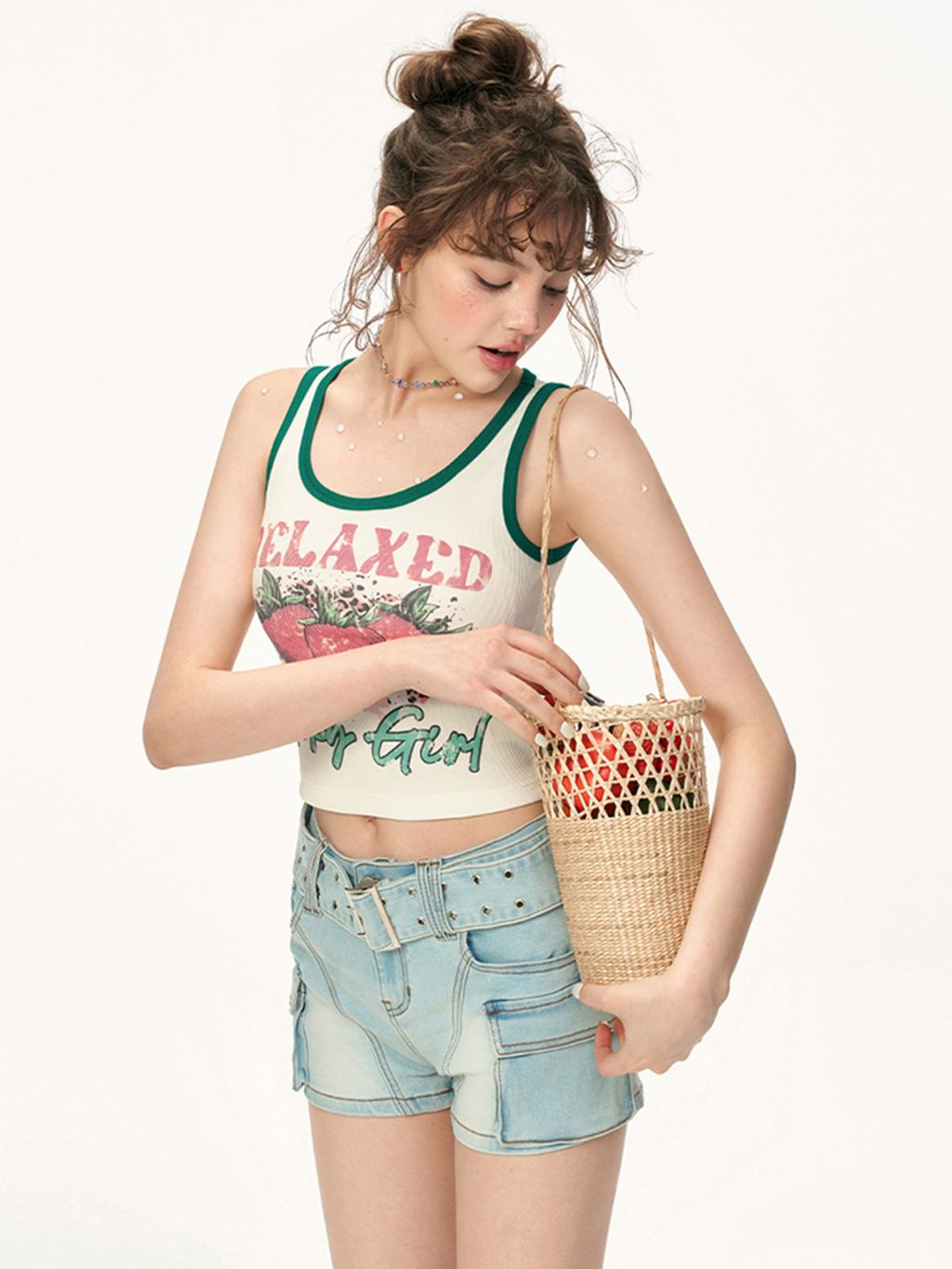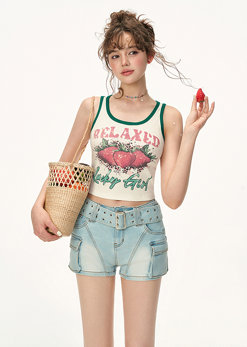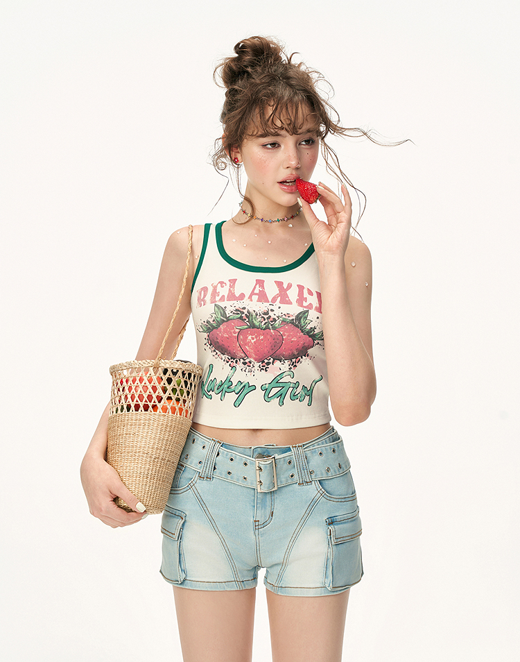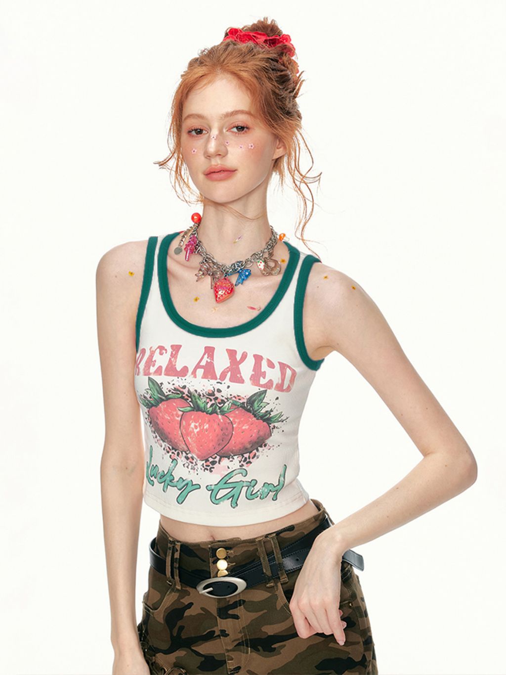 귀여운 딸기 프린트와 레터링으로 상큼함이 가득한 크롭 탱크탑으로 바인딩 컬러 포인트와 짧은 기장감은 러블리하면서도 Y2K 무드를 살려줍니다. 얇고 신축성 있는 골지 원단으로 가볍게 착용할 수 있으며 숏팬츠나 미니스커트와 함께 키치한 썸머룩을 완성합니다.