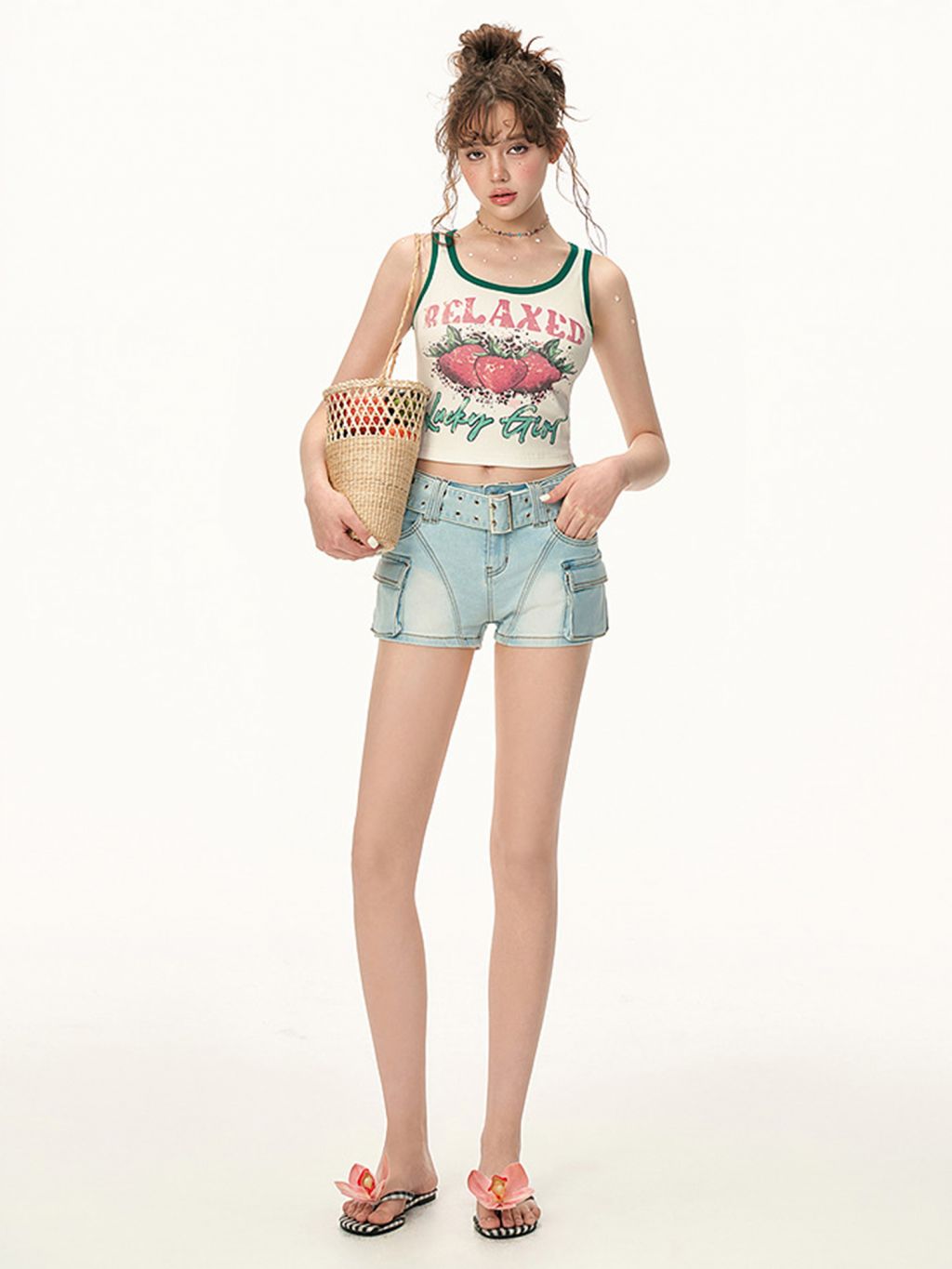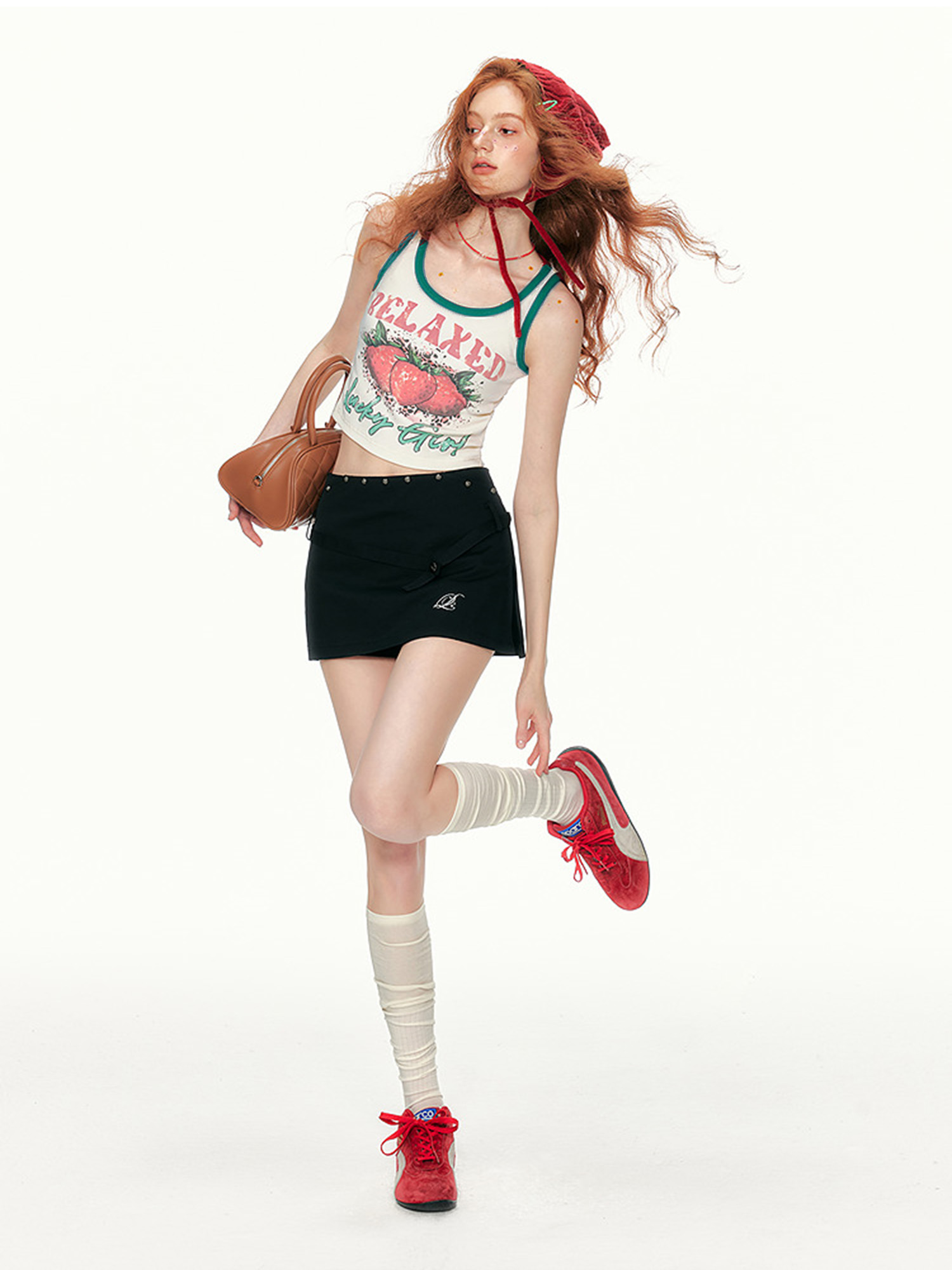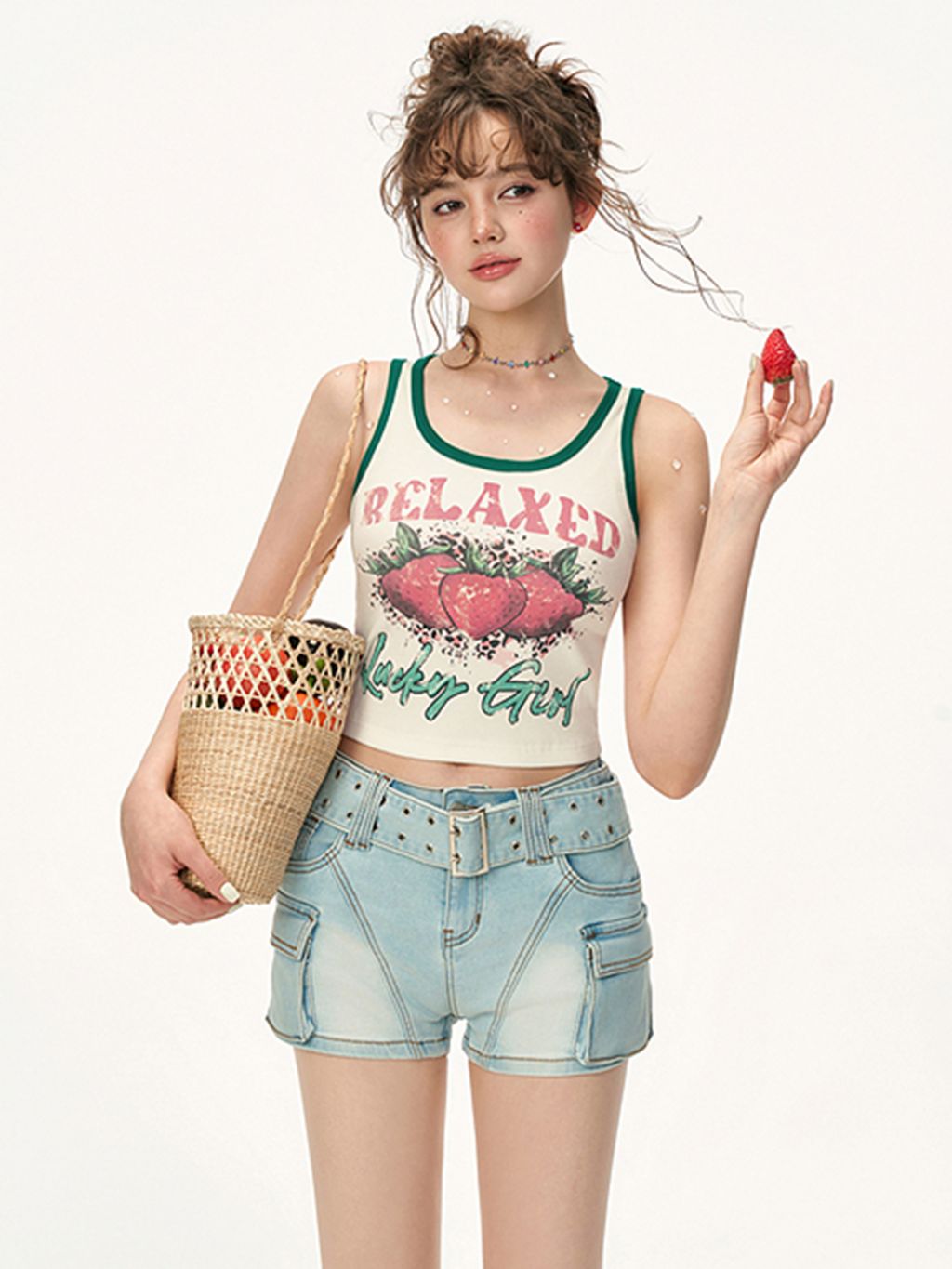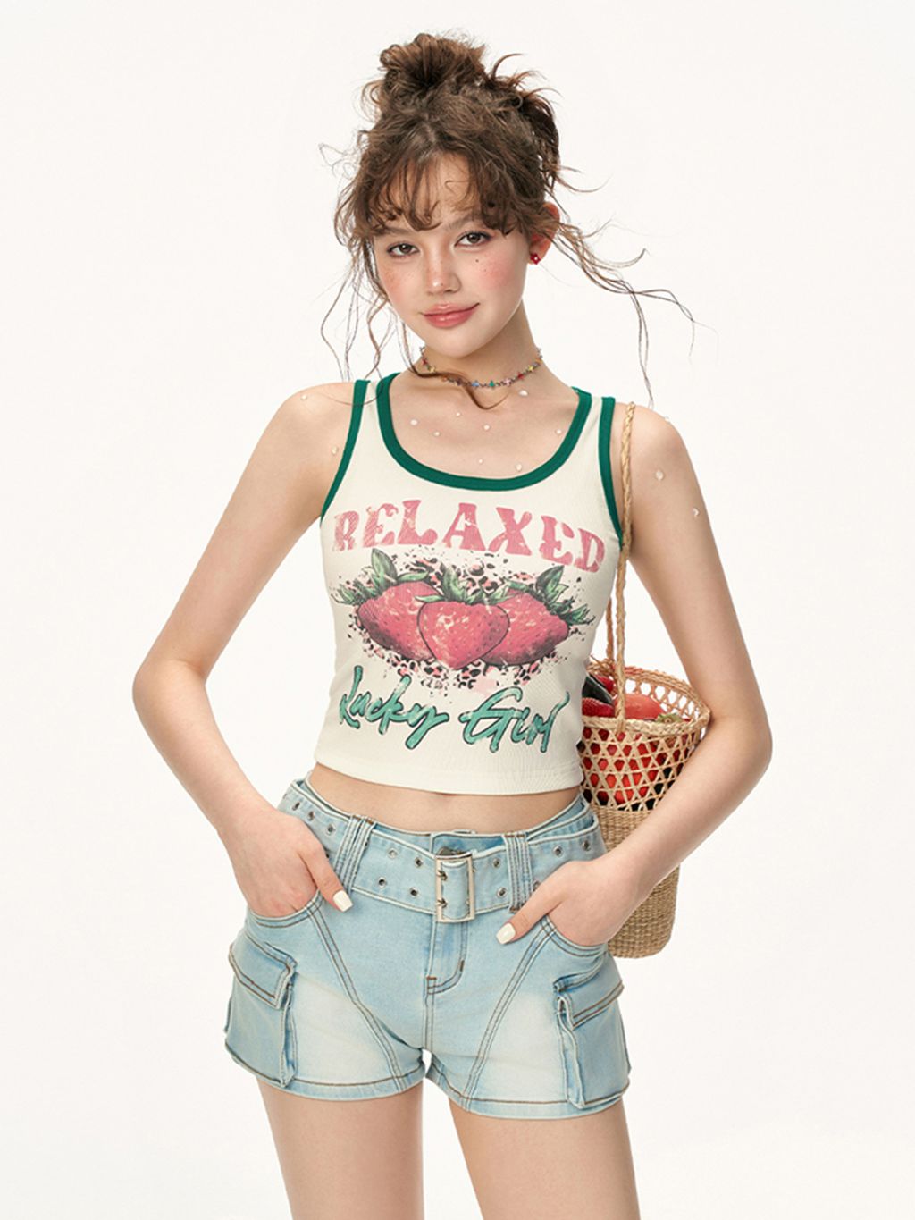 귀여운 딸기 프린트와 레터링으로 상큼함이 가득한 크롭 탱크탑으로 바인딩 컬러 포인트와 짧은 기장감은 러블리하면서도 Y2K 무드를 살려줍니다. 얇고 신축성 있는 골지 원단으로 가볍게 착용할 수 있으며 숏팬츠나 미니스커트와 함께 키치한 썸머룩을 완성합니다.