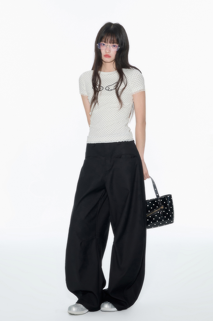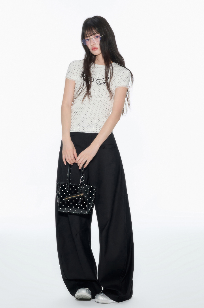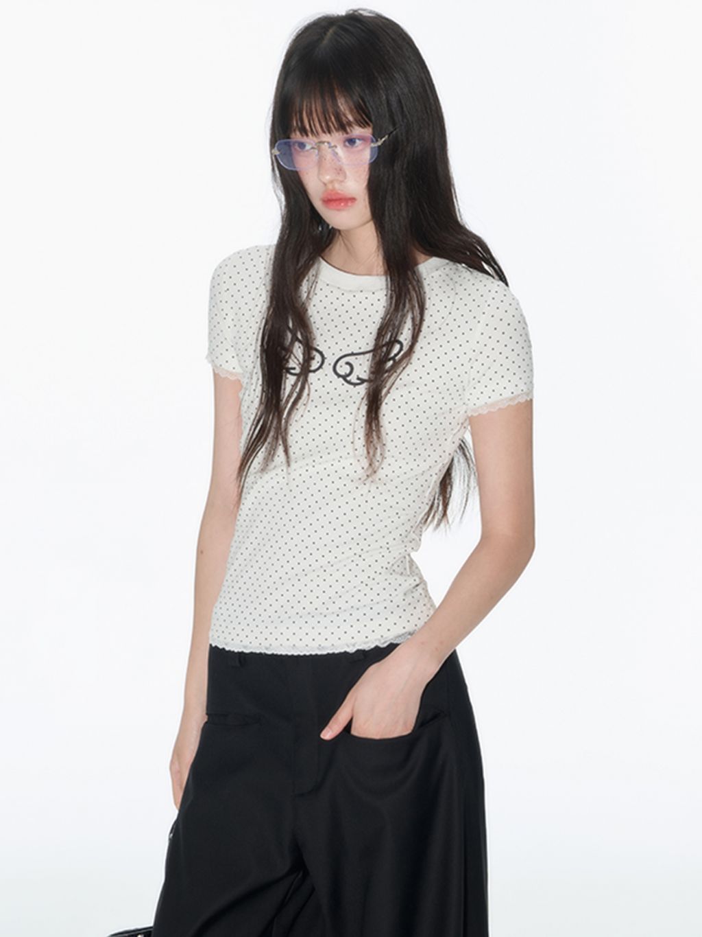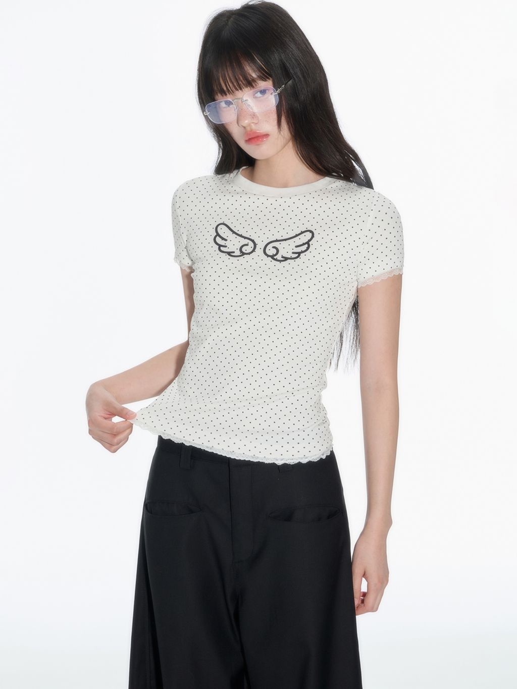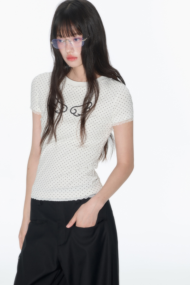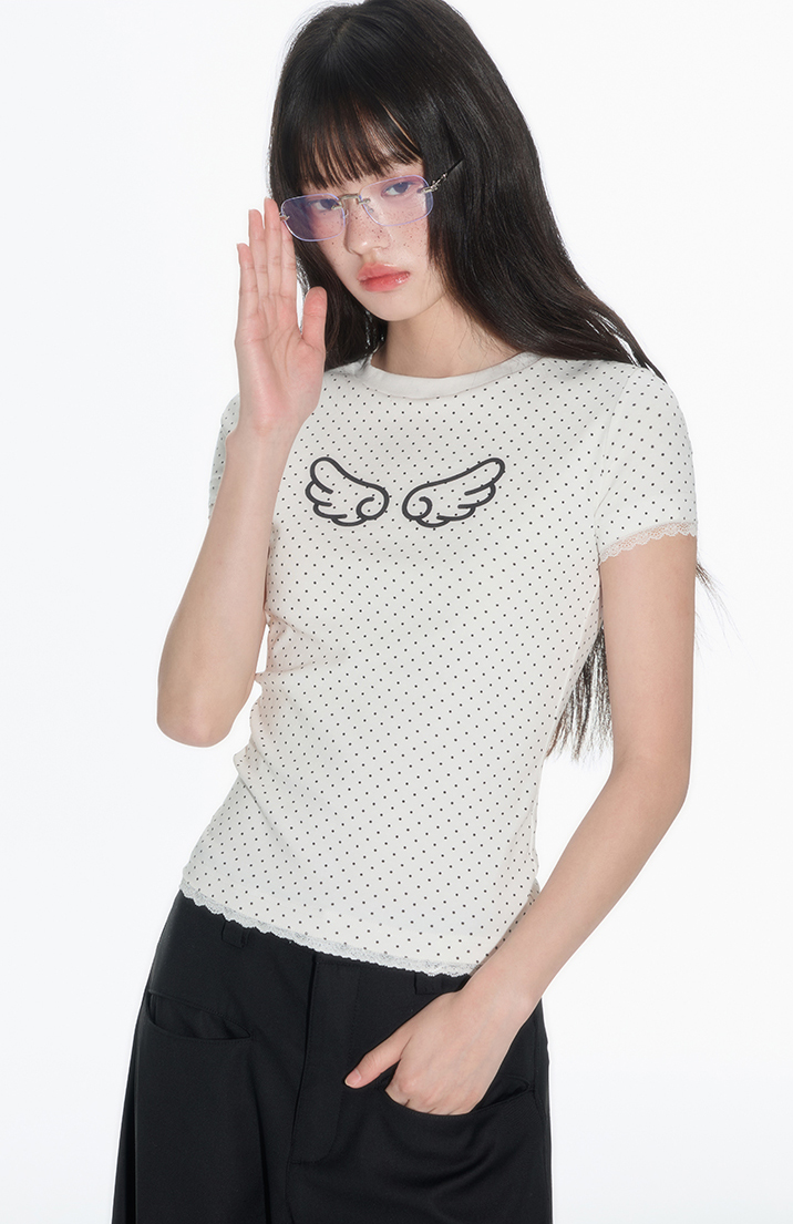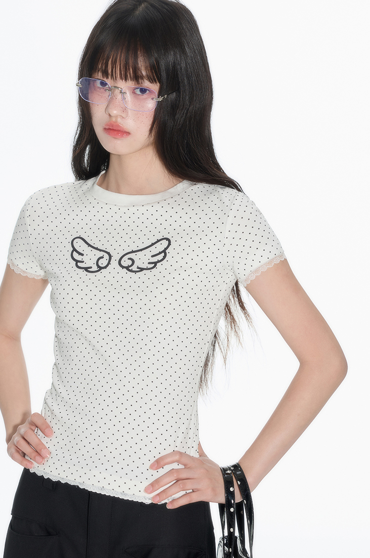 러블리한 도트 패턴 위에 날개 프린트로 포인트를 더한 피티드 티셔츠로 신축성 있는 소재와 바디에 밀착되는 실루엣이 슬림하고 유니크한 분위기를 연출하며 소매와 밑단의 미니 레이스 마감으로 키치하면서도 소녀스러운 무드를 담았습니다.