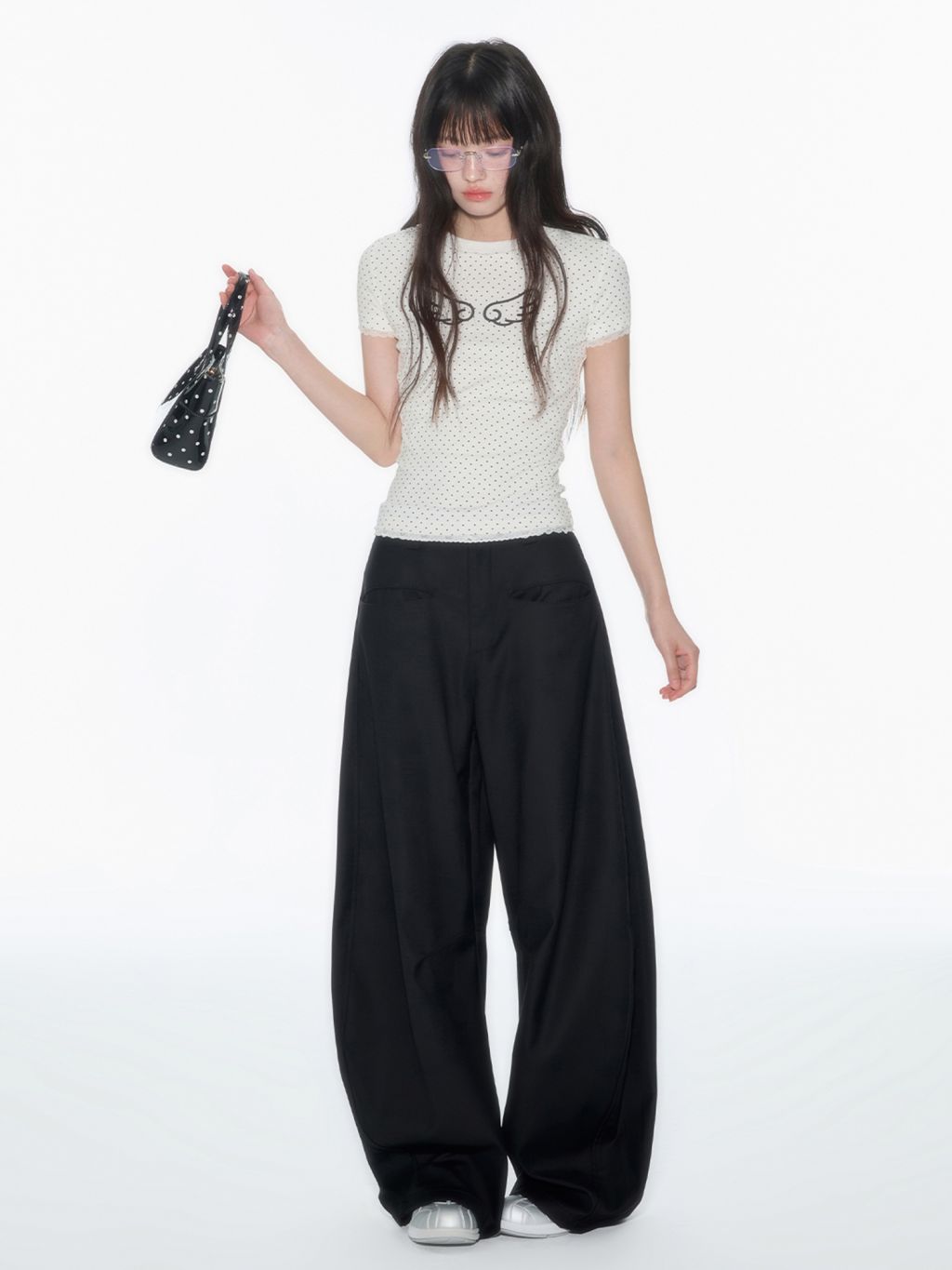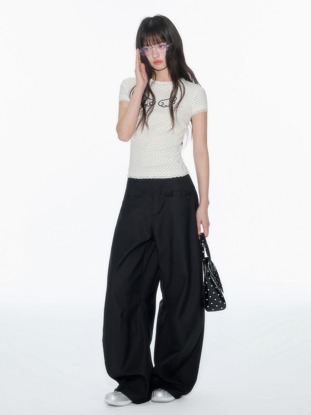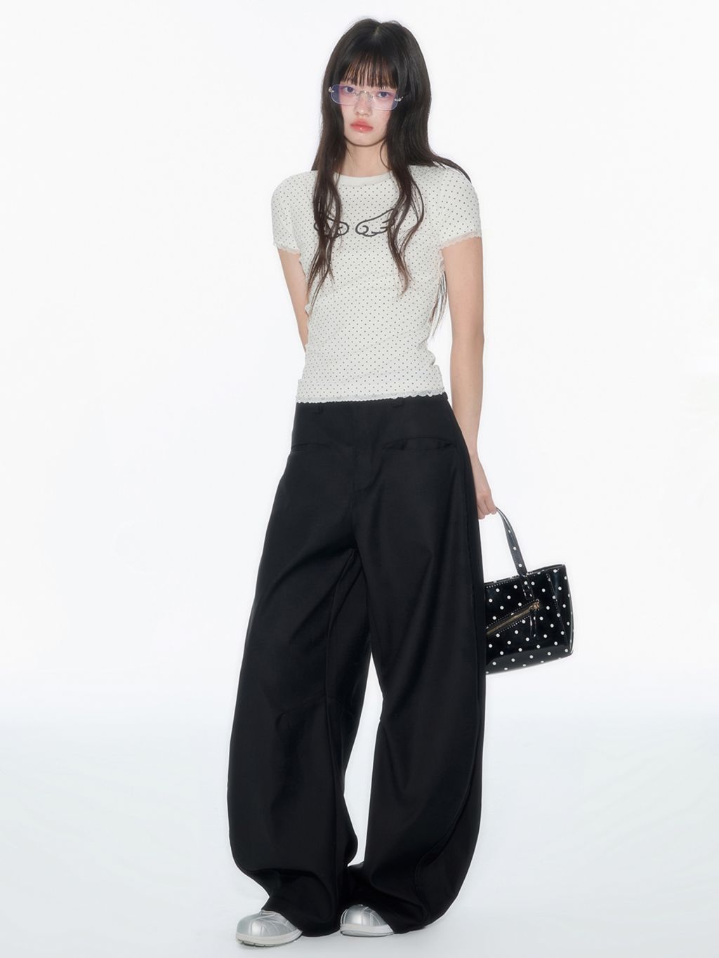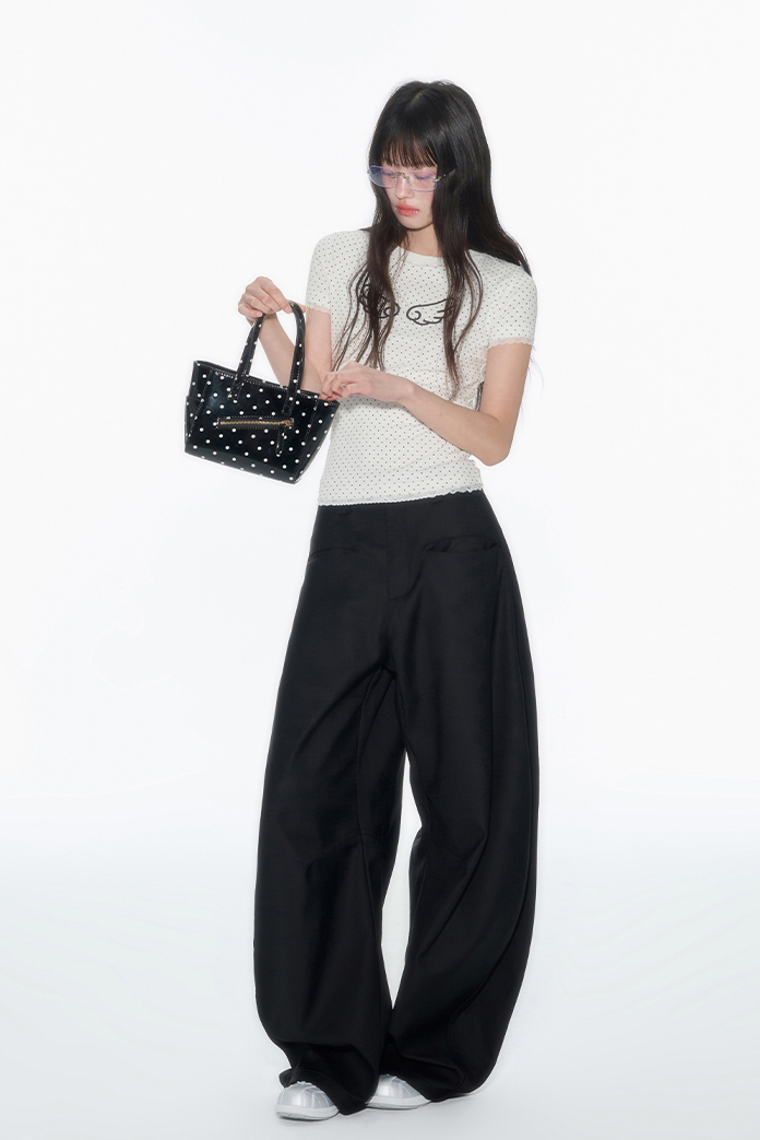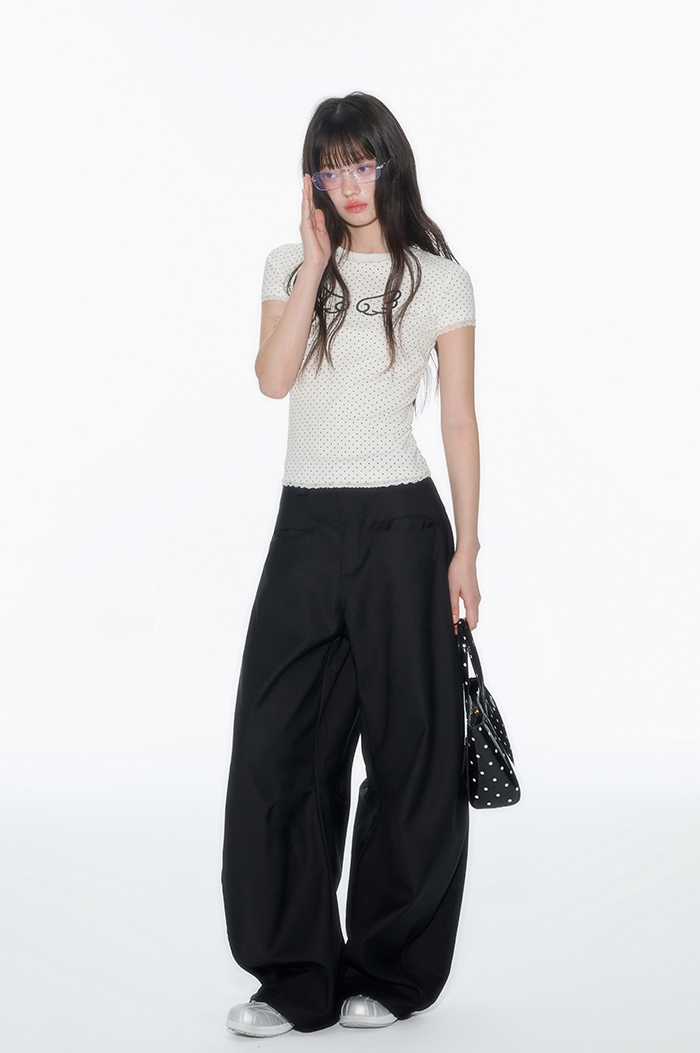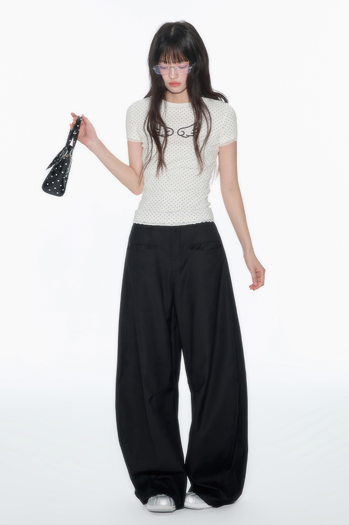 러블리한 도트 패턴 위에 날개 프린트로 포인트를 더한 피티드 티셔츠로 신축성 있는 소재와 바디에 밀착되는 실루엣이 슬림하고 유니크한 분위기를 연출하며 소매와 밑단의 미니 레이스 마감으로 키치하면서도 소녀스러운 무드를 담았습니다.