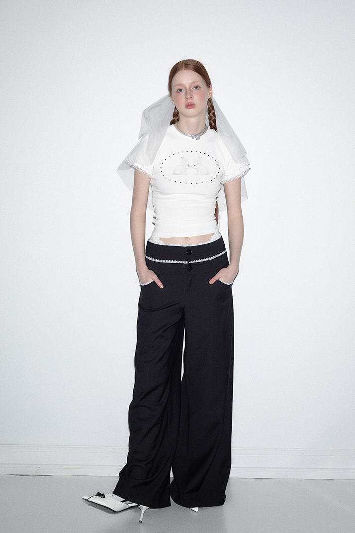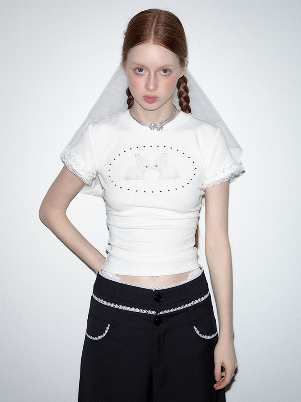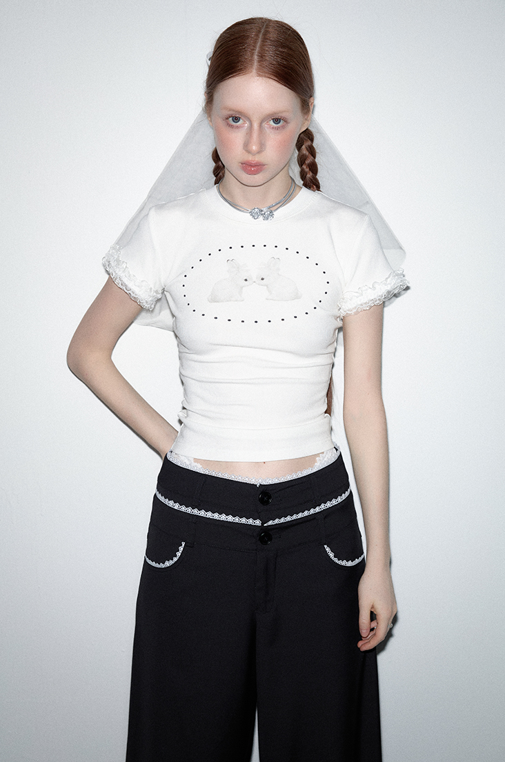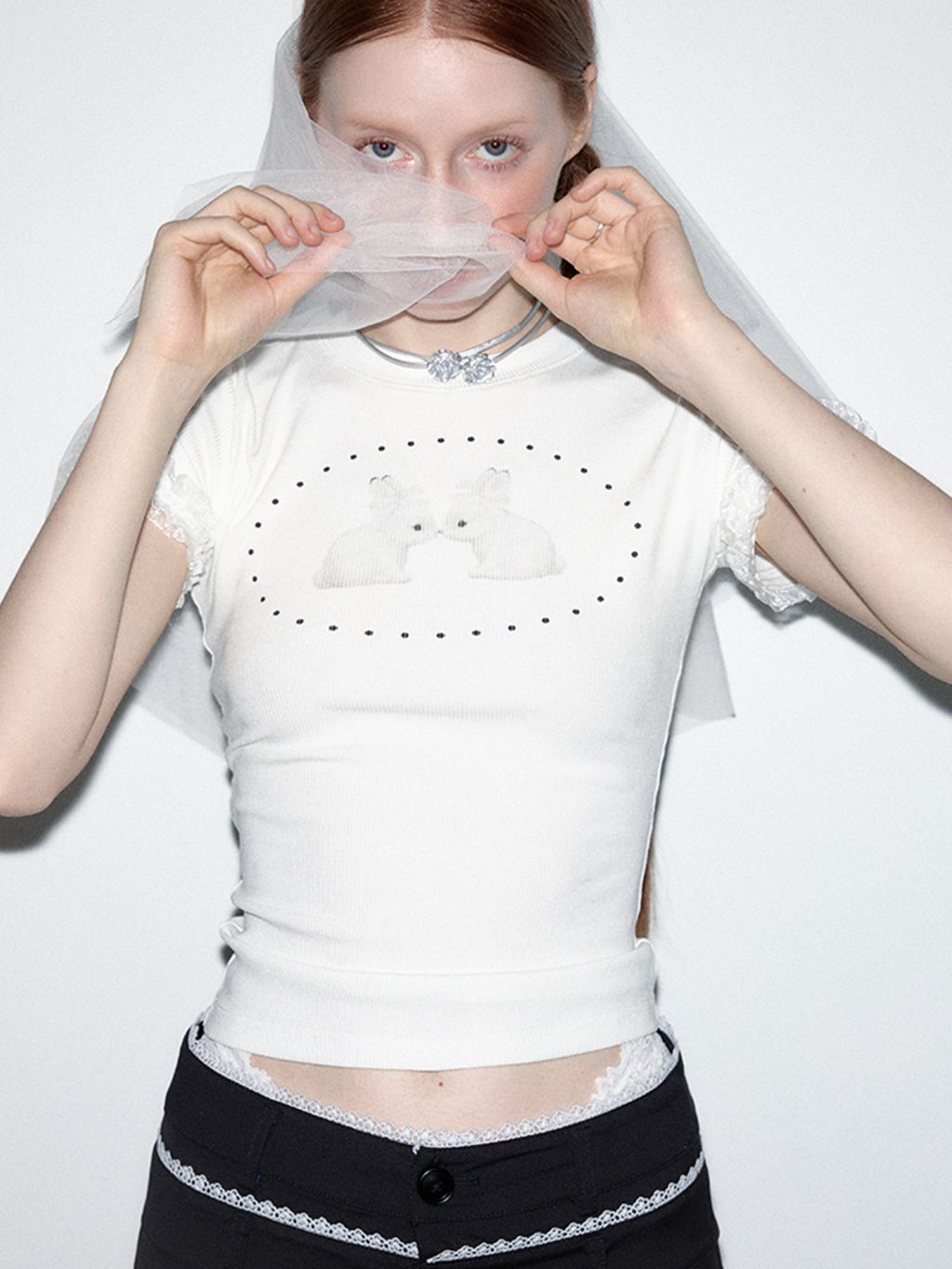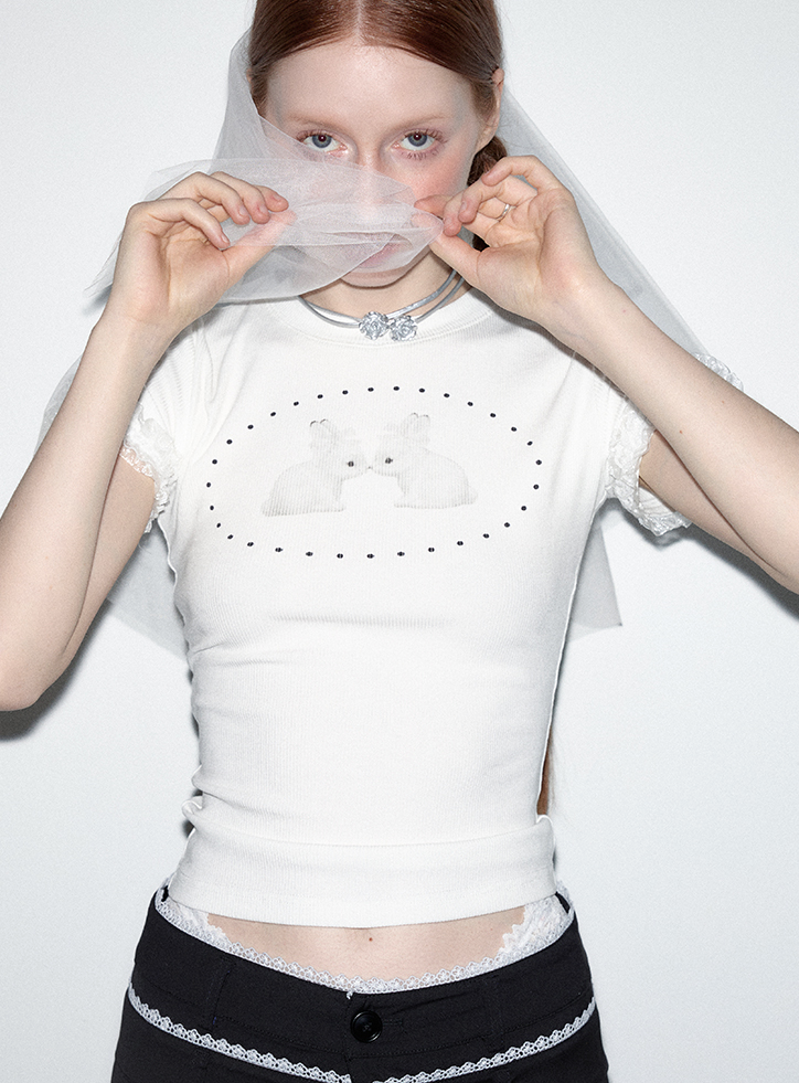 사랑스러운 토끼 자수와 도트 자수가 어우러진 크롭핏 티셔츠로 소매 끝단과 밑단에 레이스 트리밍을 더해 러블리한 무드를 강조했으며 부드러운 신축성으로 편안한 착용감까지 겸비한 아이템입니다.