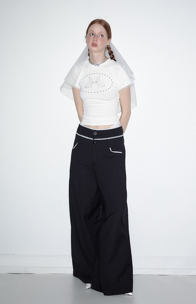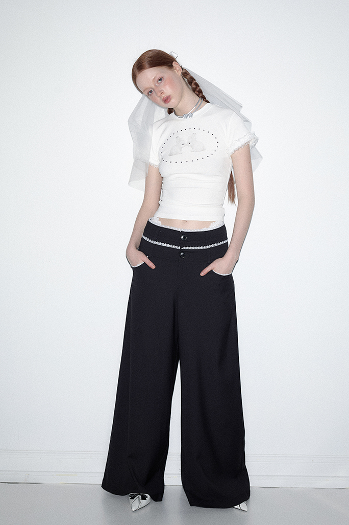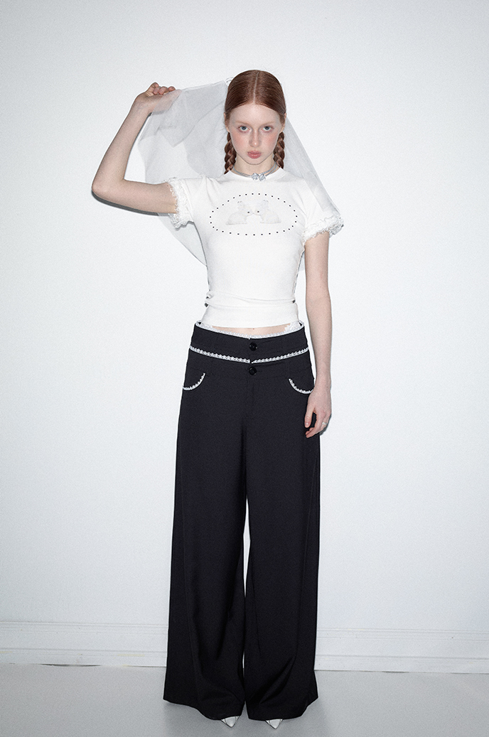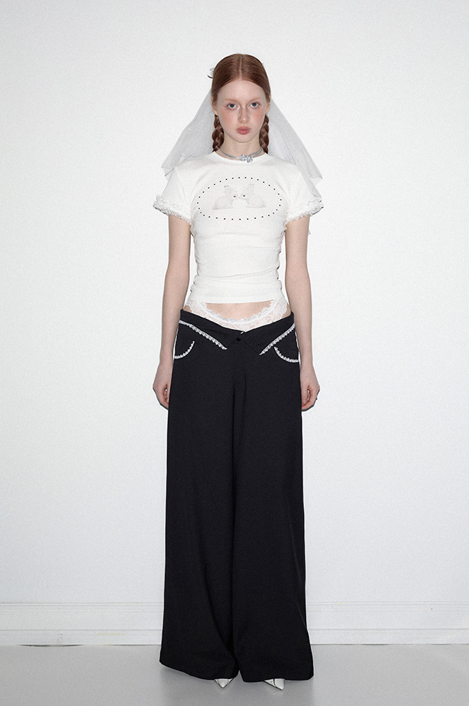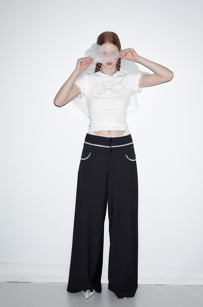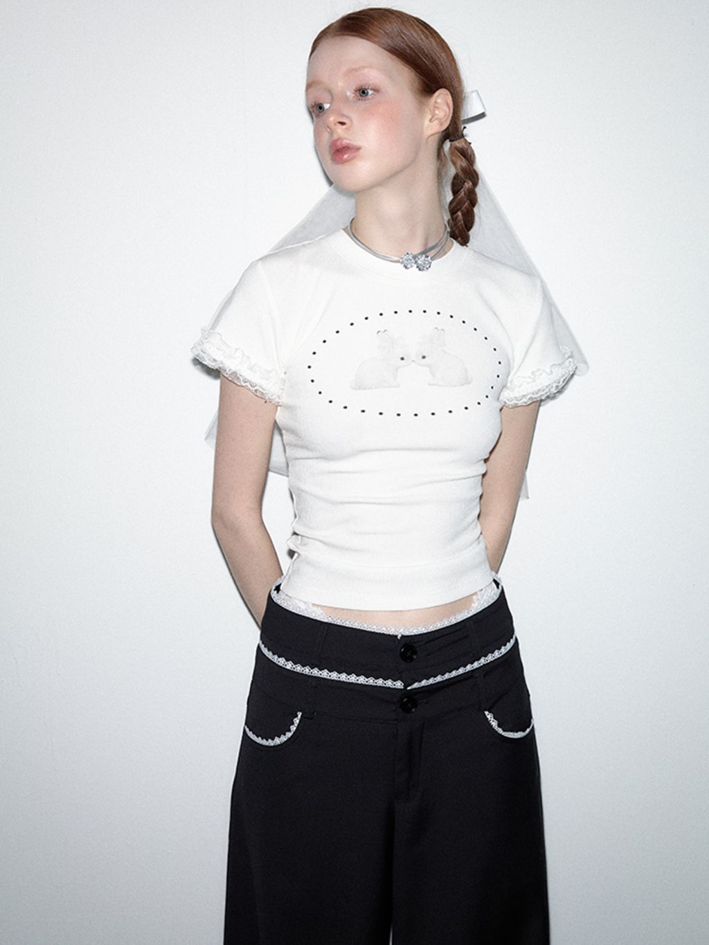 사랑스러운 토끼 자수와 도트 자수가 어우러진 크롭핏 티셔츠로 소매 끝단과 밑단에 레이스 트리밍을 더해 러블리한 무드를 강조했으며 부드러운 신축성으로 편안한 착용감까지 겸비한 아이템입니다.