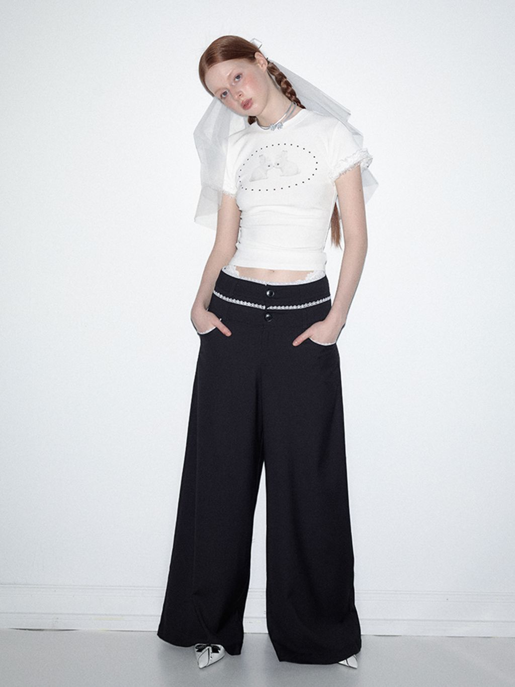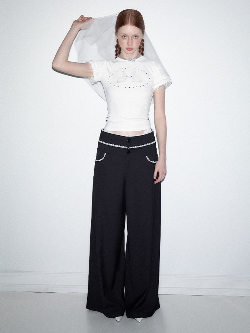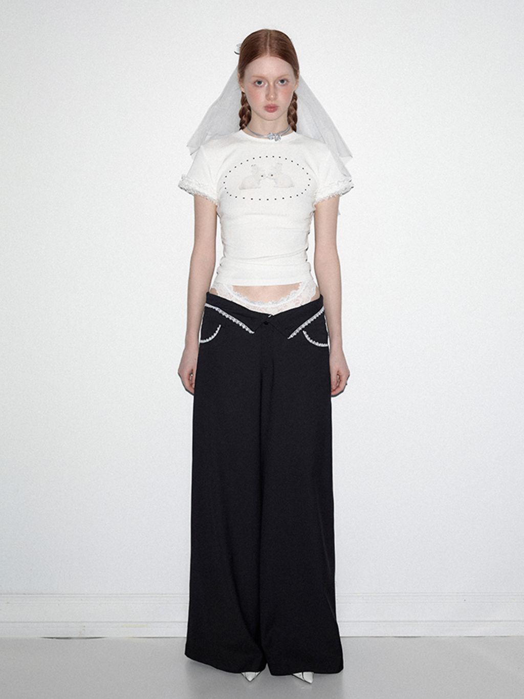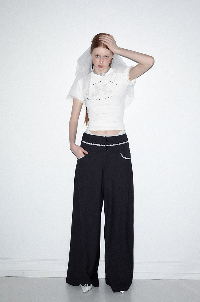 사랑스러운 토끼 자수와 도트 자수가 어우러진 크롭핏 티셔츠로 소매 끝단과 밑단에 레이스 트리밍을 더해 러블리한 무드를 강조했으며 부드러운 신축성으로 편안한 착용감까지 겸비한 아이템입니다.