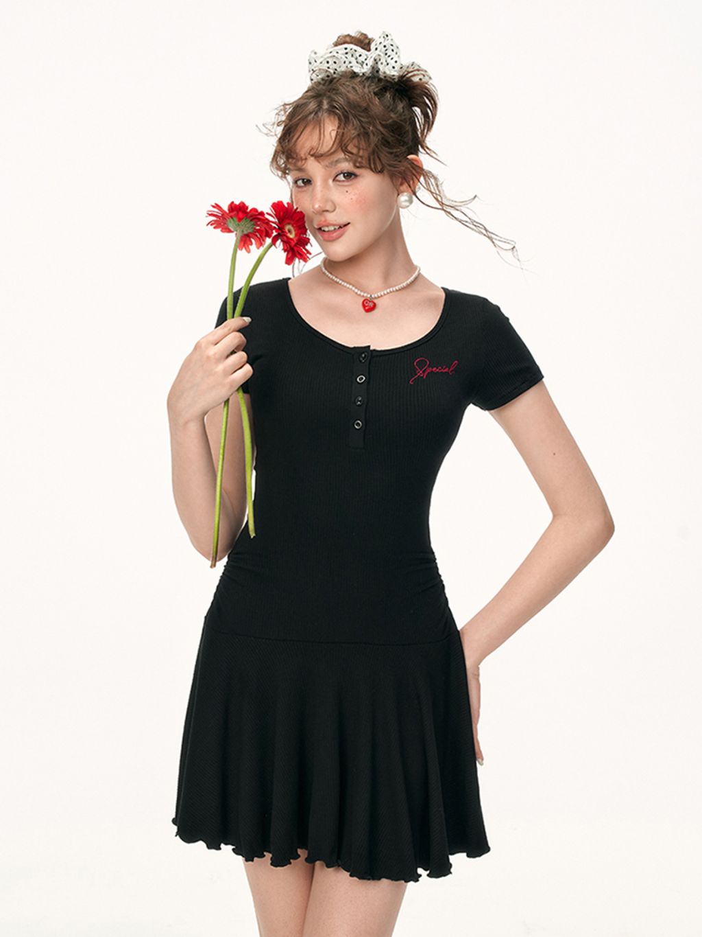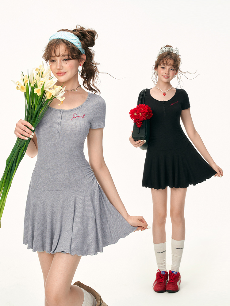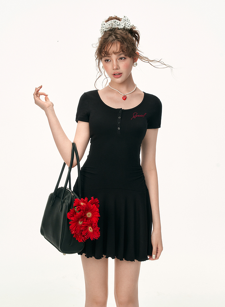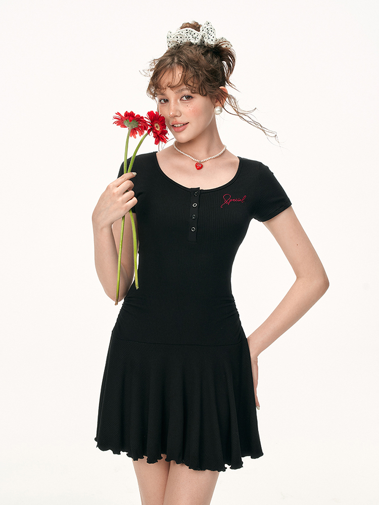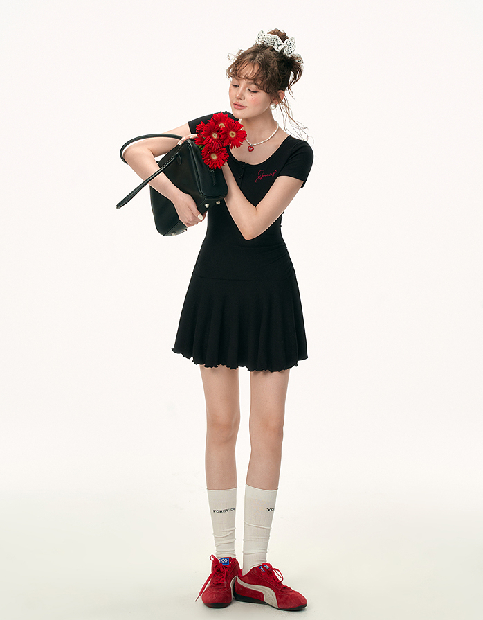 허리 셔링과 플레어 스커트로 자연스럽게 라인을 강조하며 ‘special’ 자수 포인트로 귀여운 감성을 더한 사랑스러운 곡선 실루엣과 달콤한 무드를 담은 리브 원피스입니다.