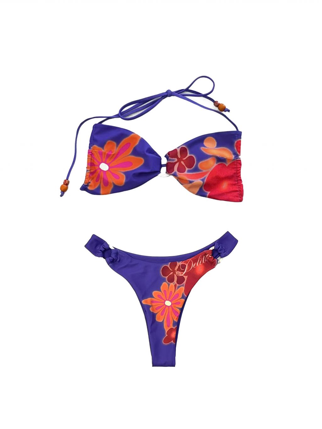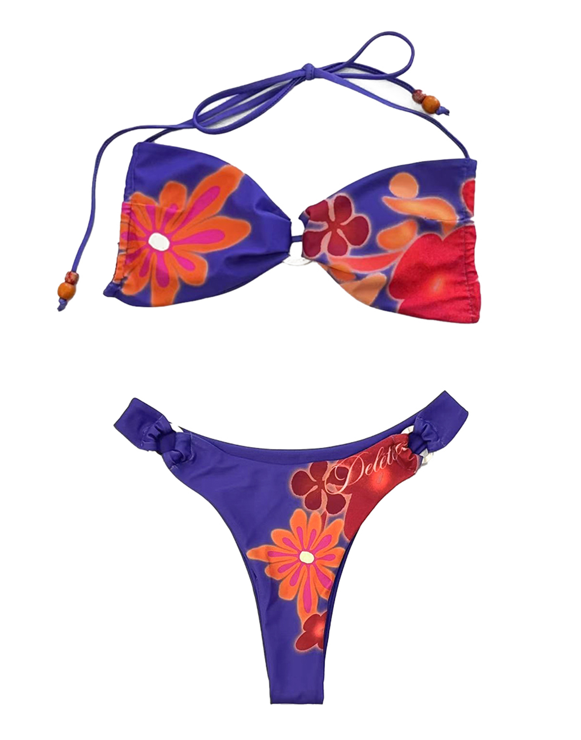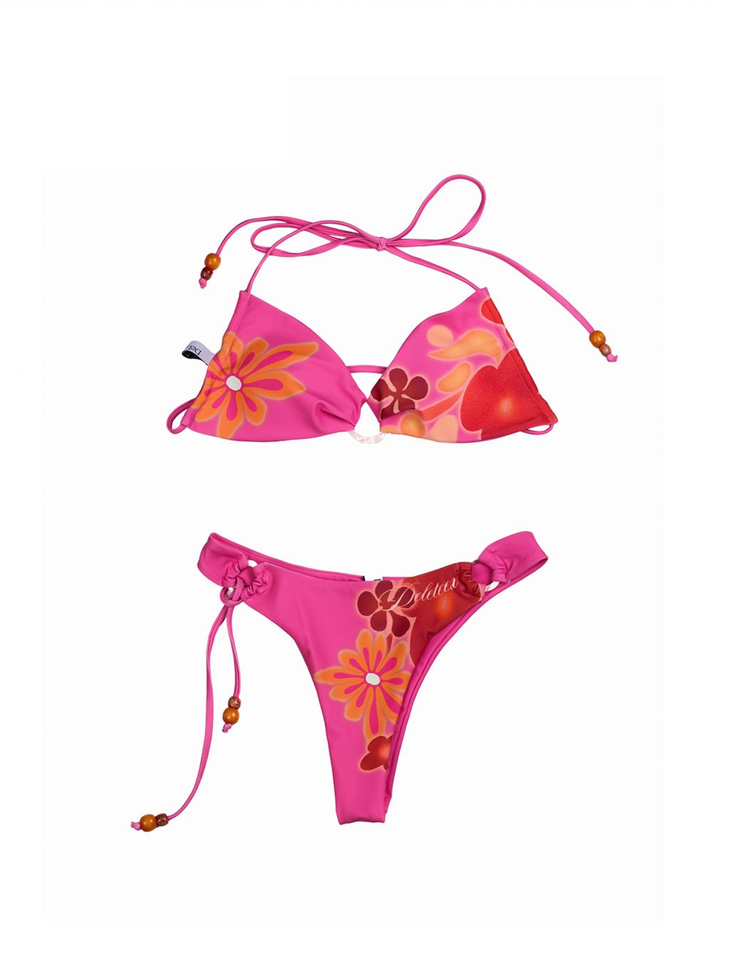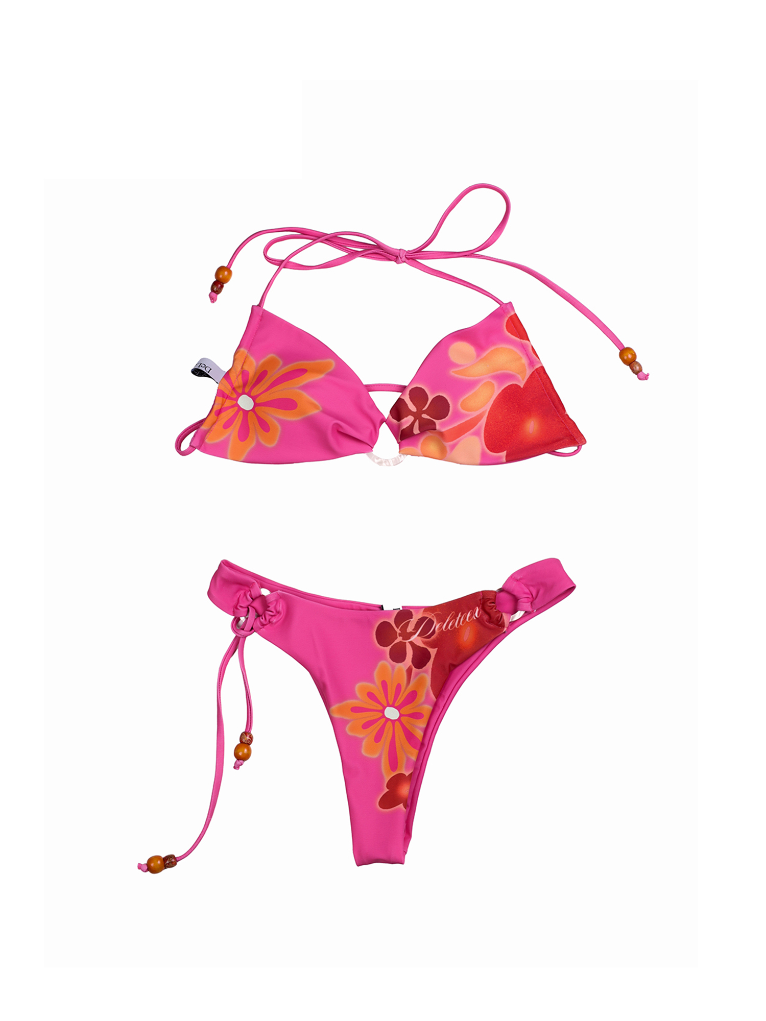트로피컬 선셋을 닮은 플라워 프린트가 돋보이는 비키니 세트로 링 디테일과 우드 비즈 스트랩으로 포인트로 감각적인 스타일을 연출하며, 신축성 있는 원단으로 편안한 착용감을 제공합니다.