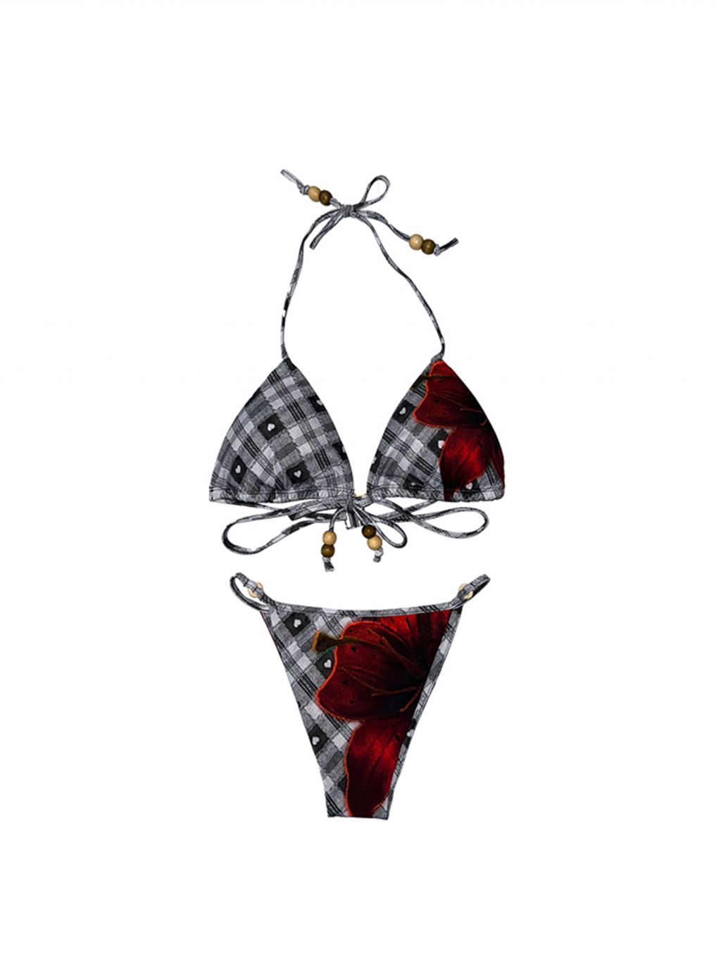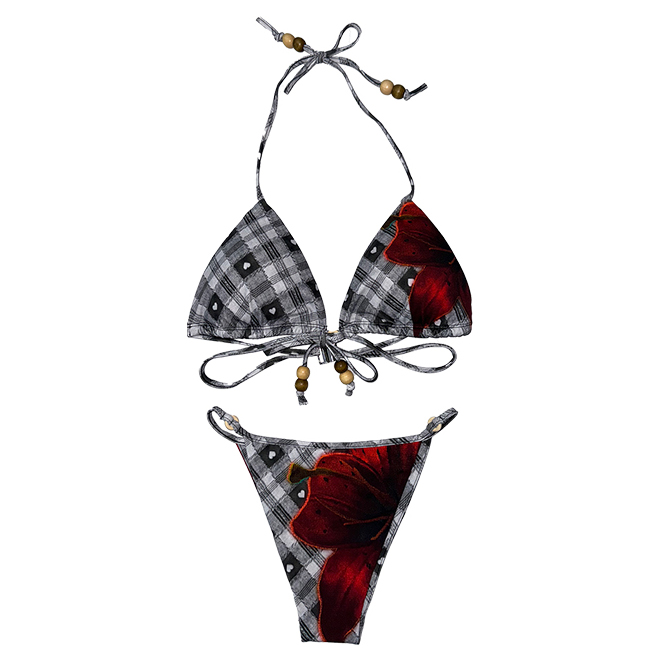 - 체크 패턴과 레드 플라워 포인트가 돋보이는 비키니 세트