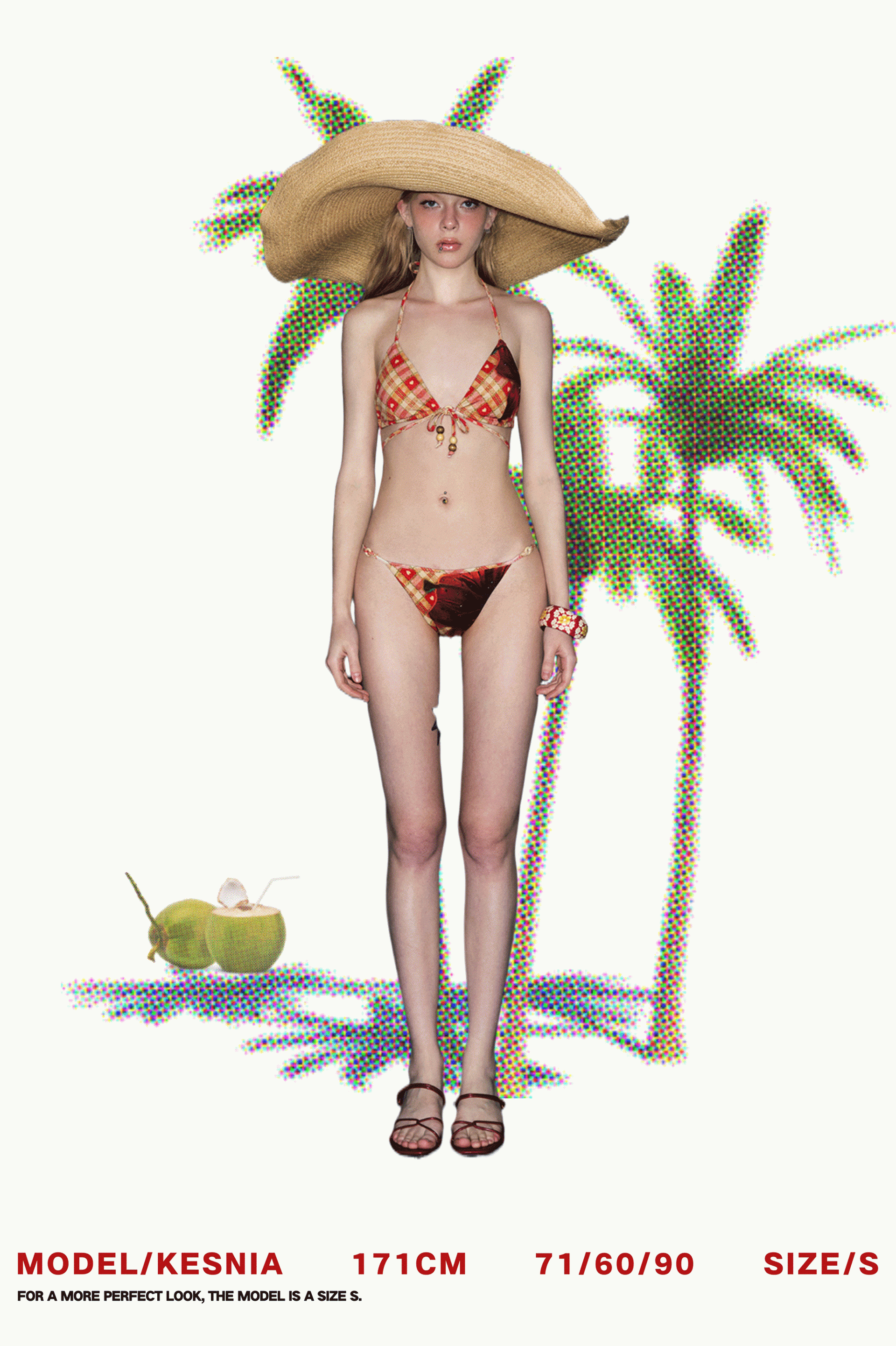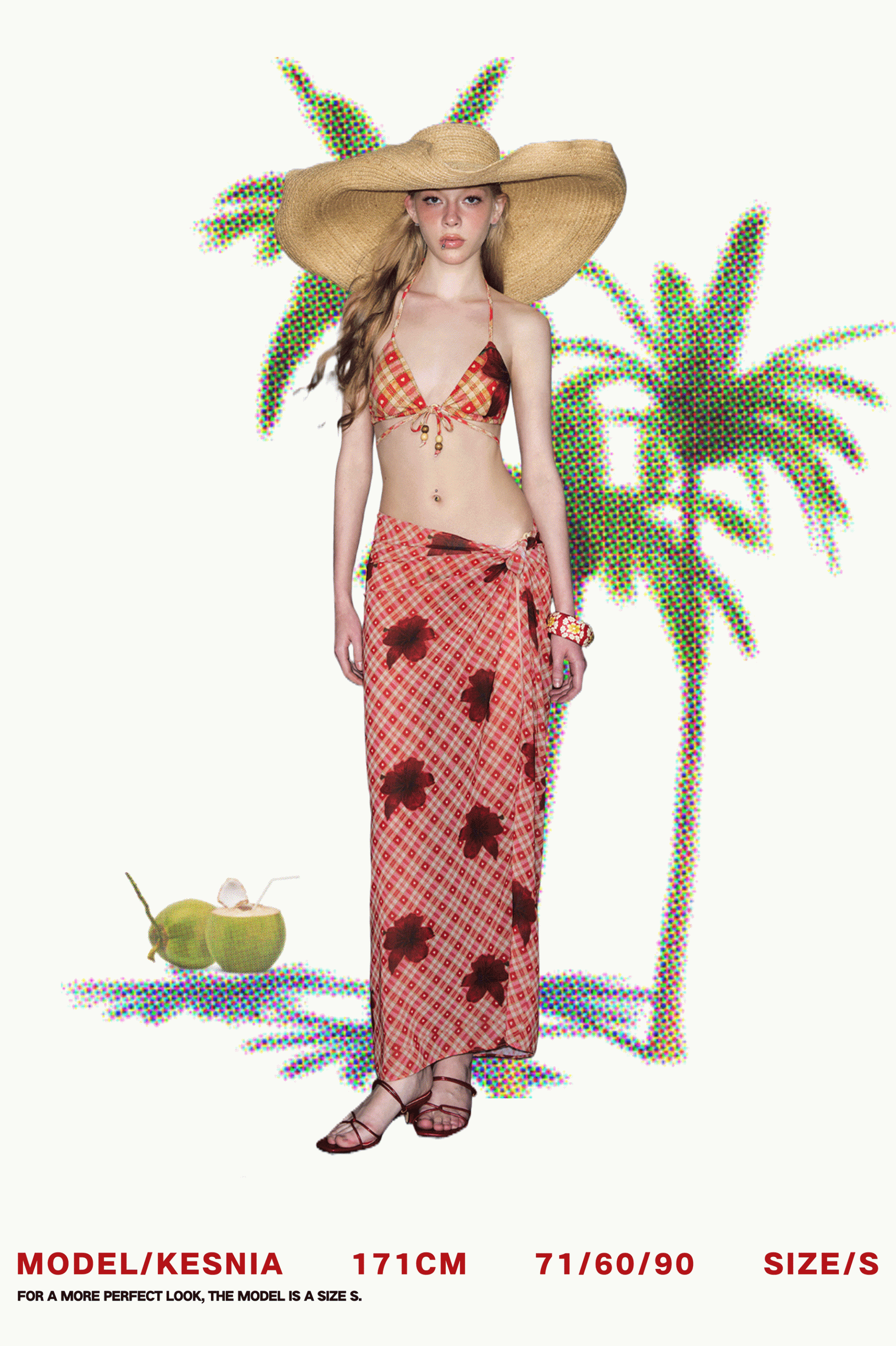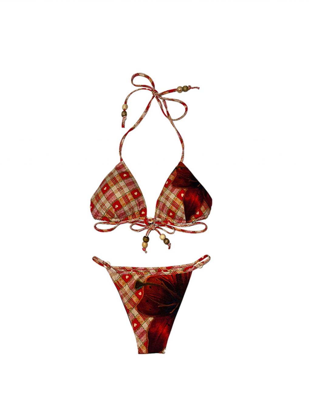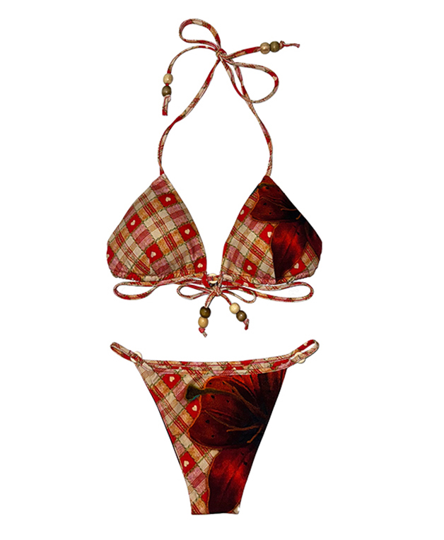 빈티지 무드의 체크 패턴과 레드 플라워 프린트가 믹스된 감각적인 비키니 세트로 우드 비즈 디테일이 더해져 휴양지와 비치에서 이국적인 분위기를 완성합니다.