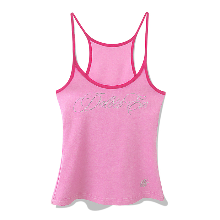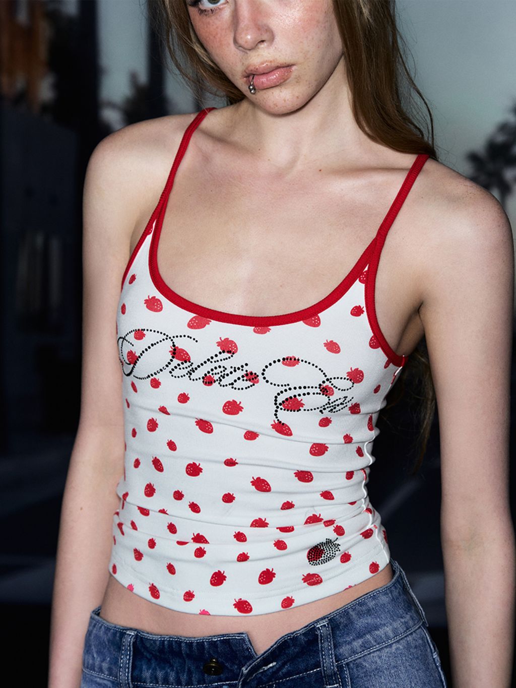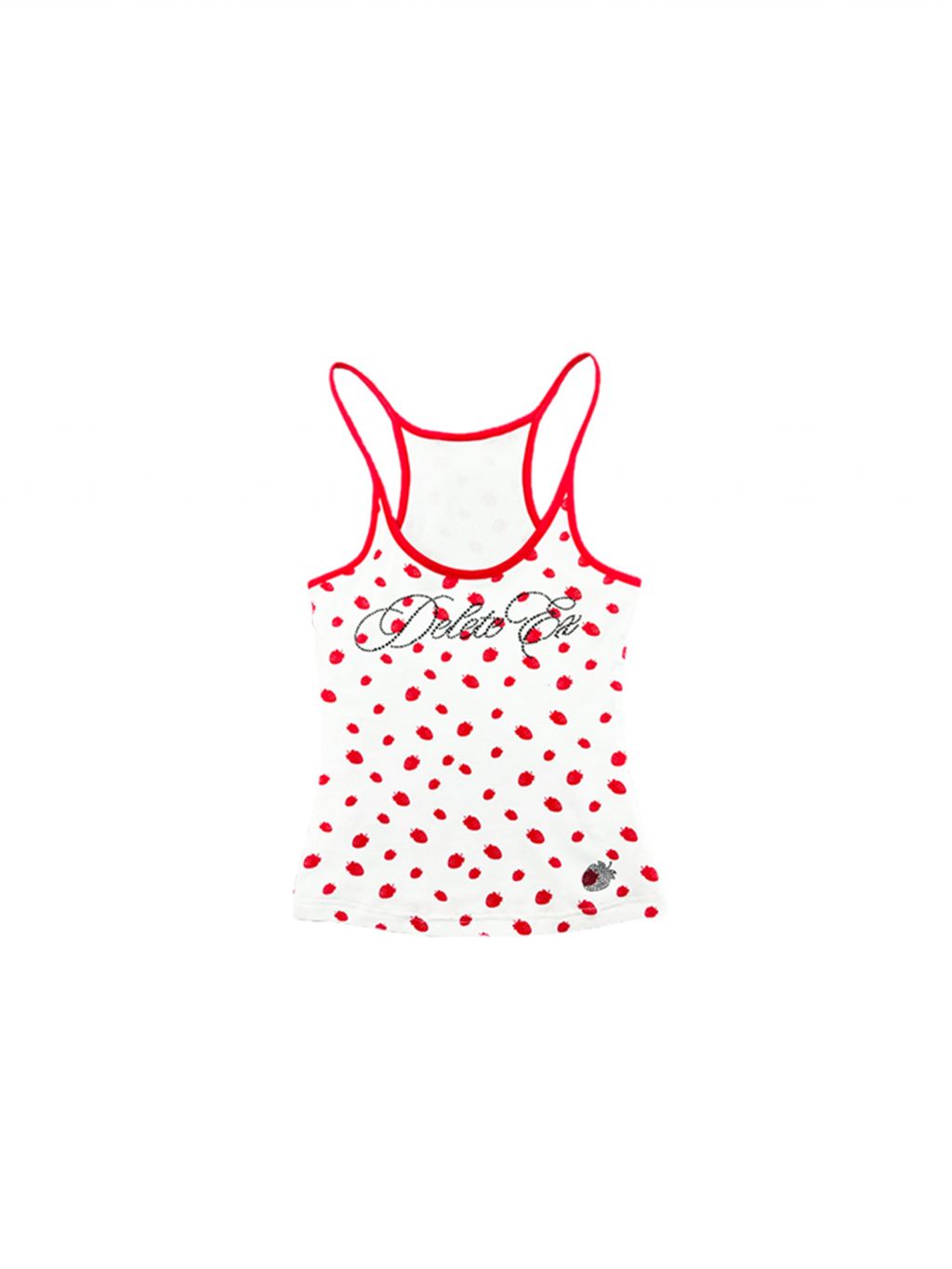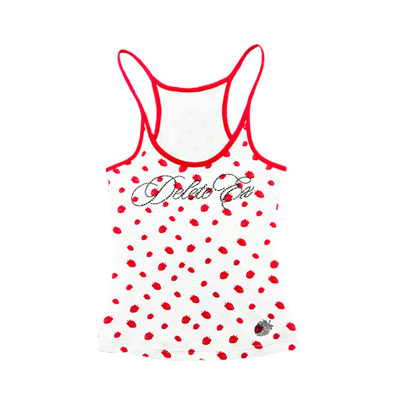 상큼한 딸기 패턴과 블링 크리스탈 로고가 포인트인 캐미탑으로 러블리한 무드와 Y2K 감성을 동시에 담아냈으며 얇고 부드러운 소재로 여름 시즌 단독 착용이나 이너로 활용하기 좋습니다.