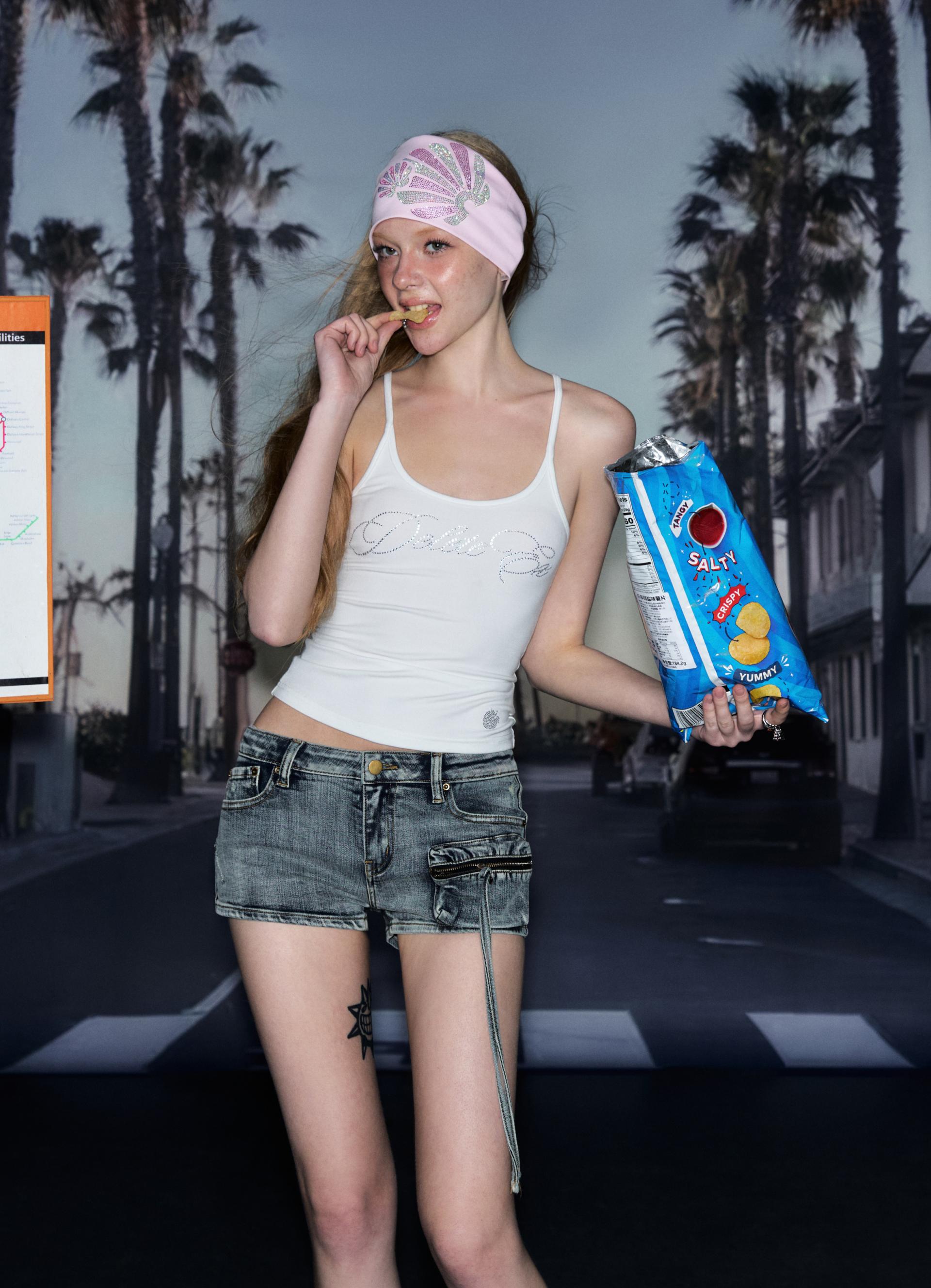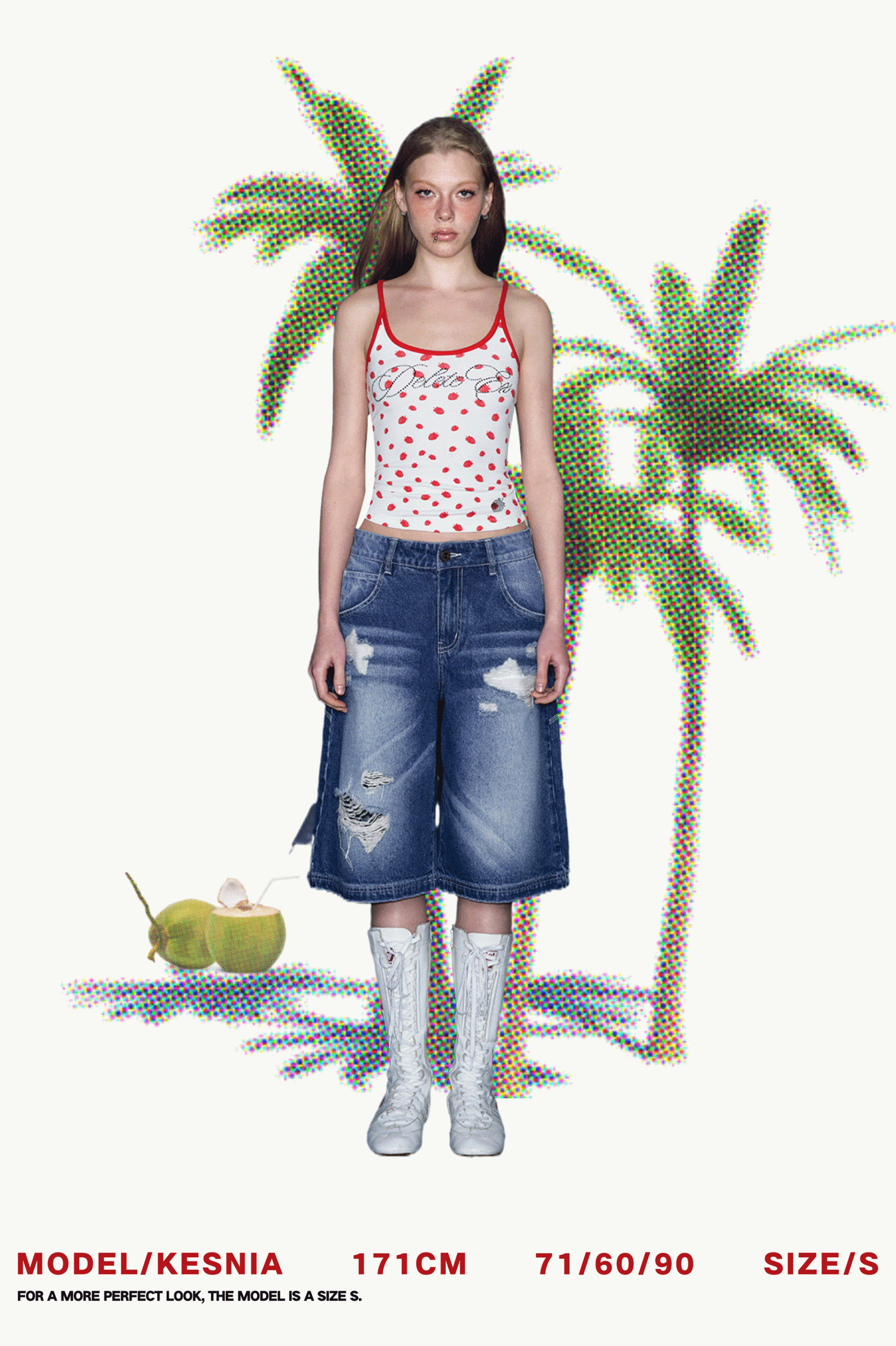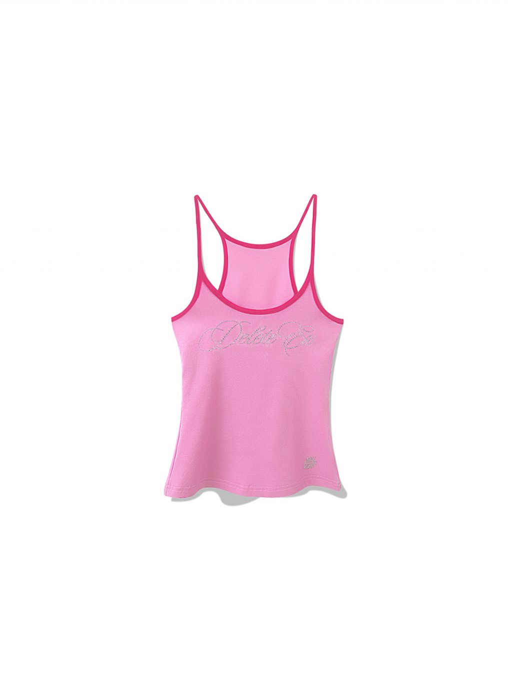 상큼한 딸기 패턴과 블링 크리스탈 로고가 포인트인 캐미탑으로 러블리한 무드와 Y2K 감성을 동시에 담아냈으며 얇고 부드러운 소재로 여름 시즌 단독 착용이나 이너로 활용하기 좋습니다.