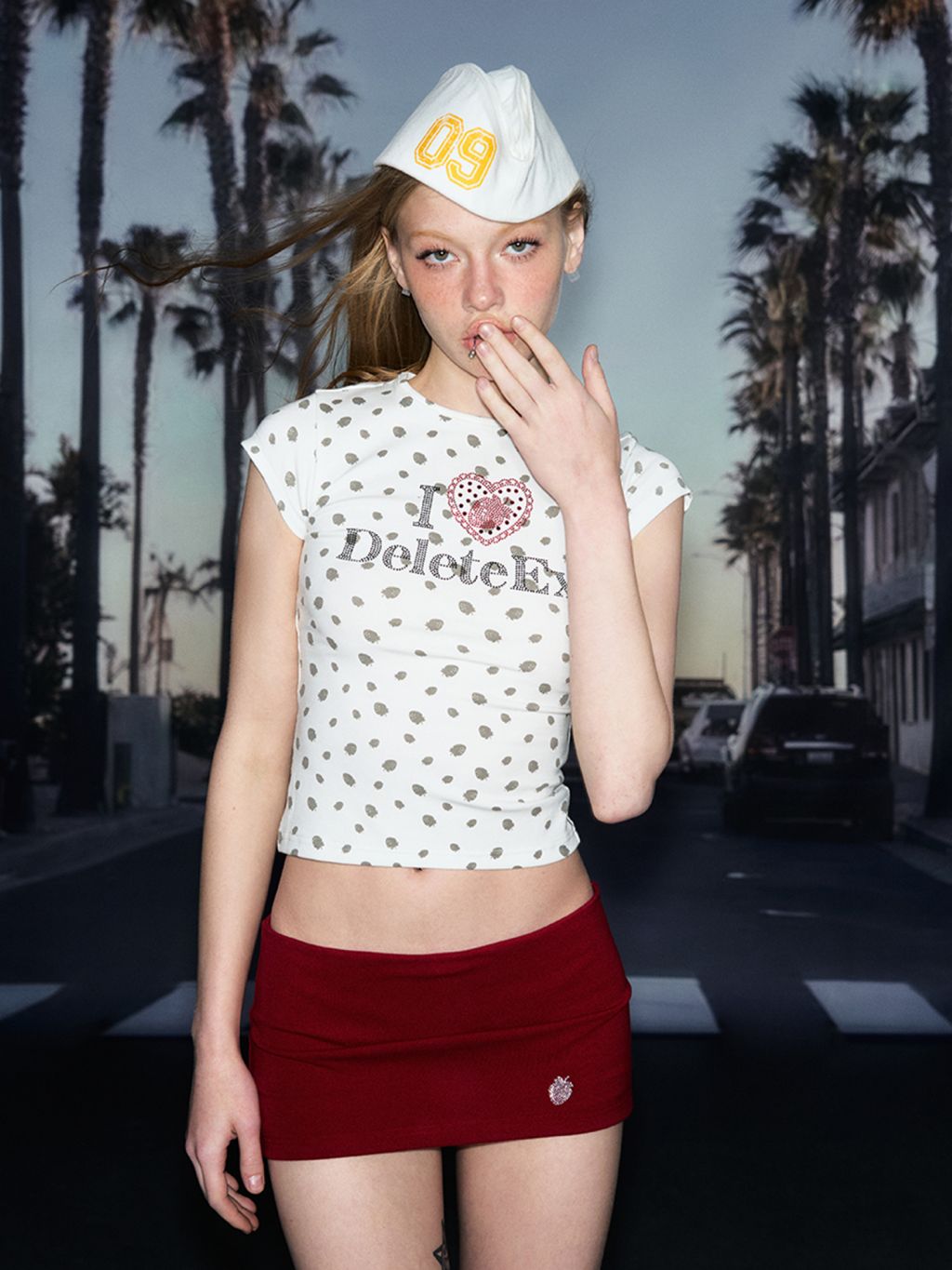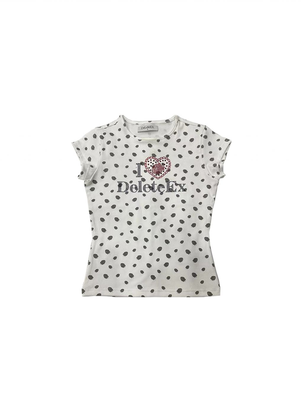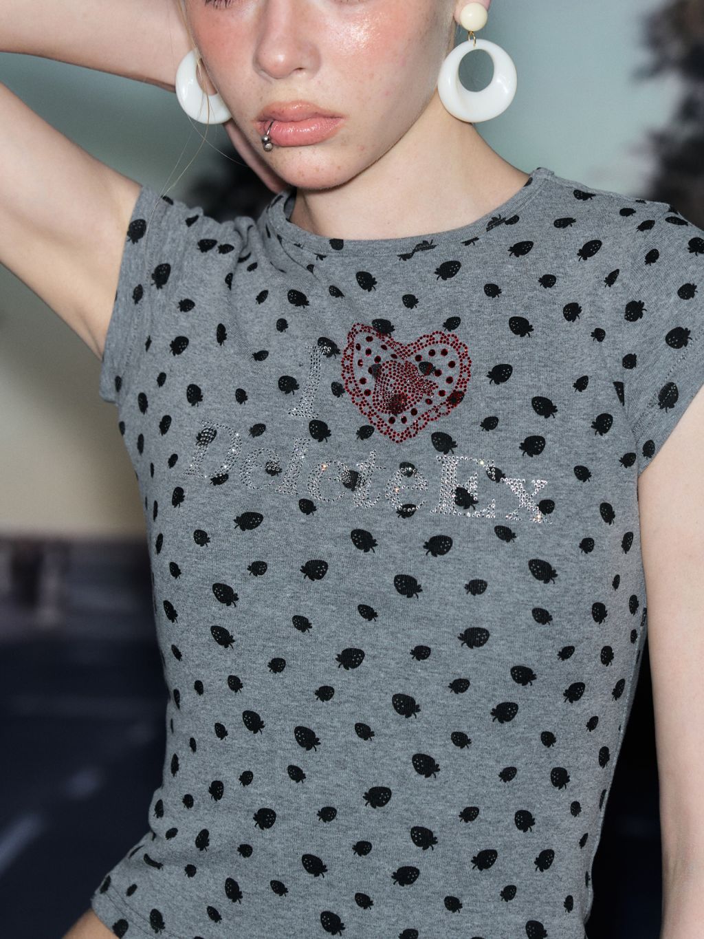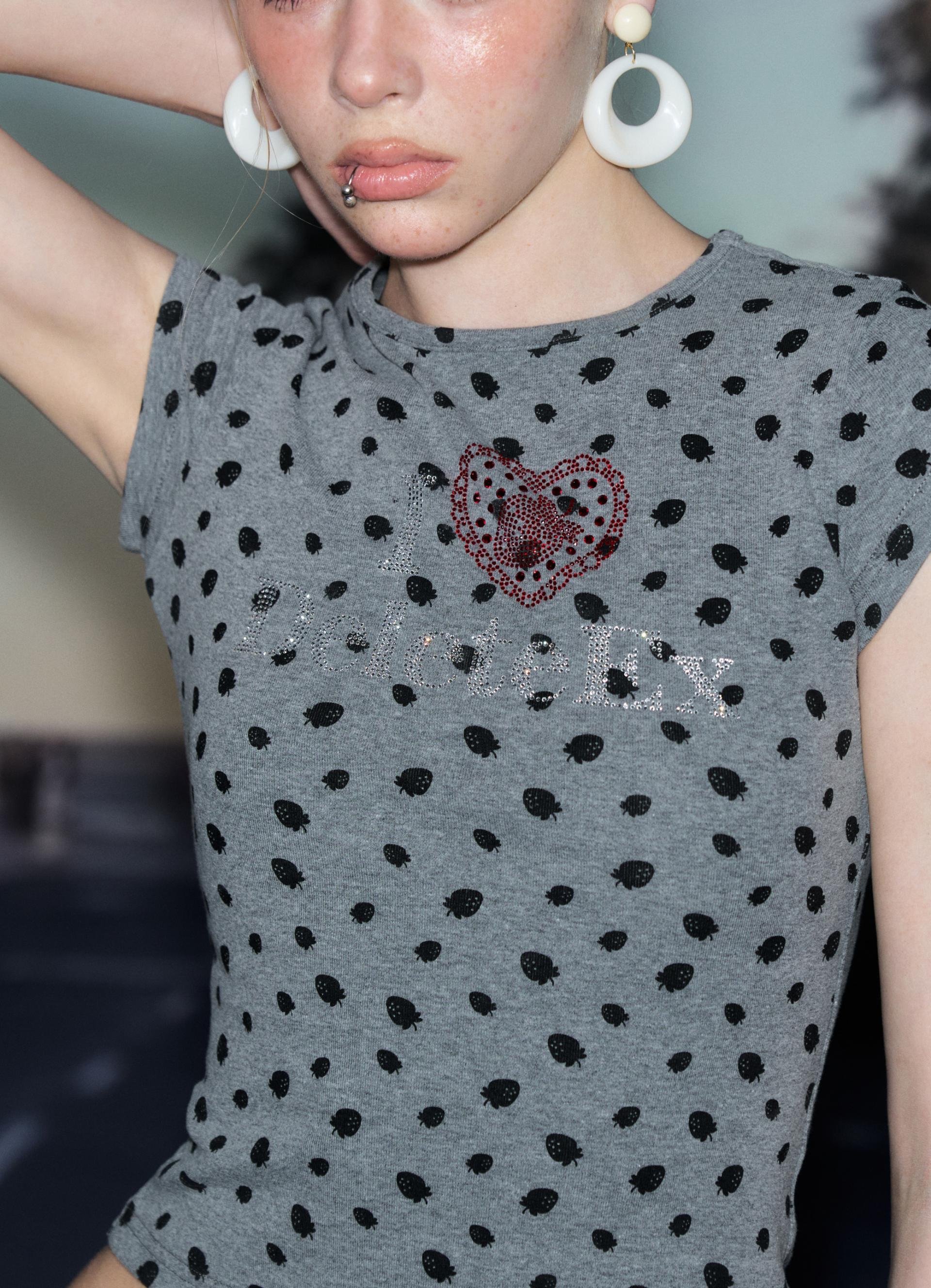 딸기 패턴과 반짝이는 큐빅 로고가 조합된 키치 무드의 슬림 티셔츠로 탄탄하면서도 부드러운 소재로 핏을 예쁘게 잡아줍니다.