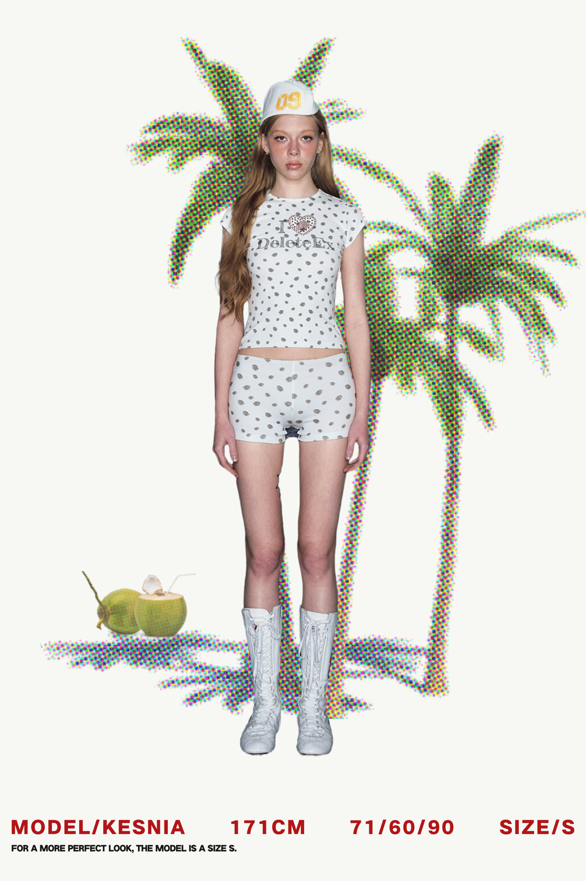 - 딸기 도트 패턴이 전체적으로 프린팅된 키치한 디자인