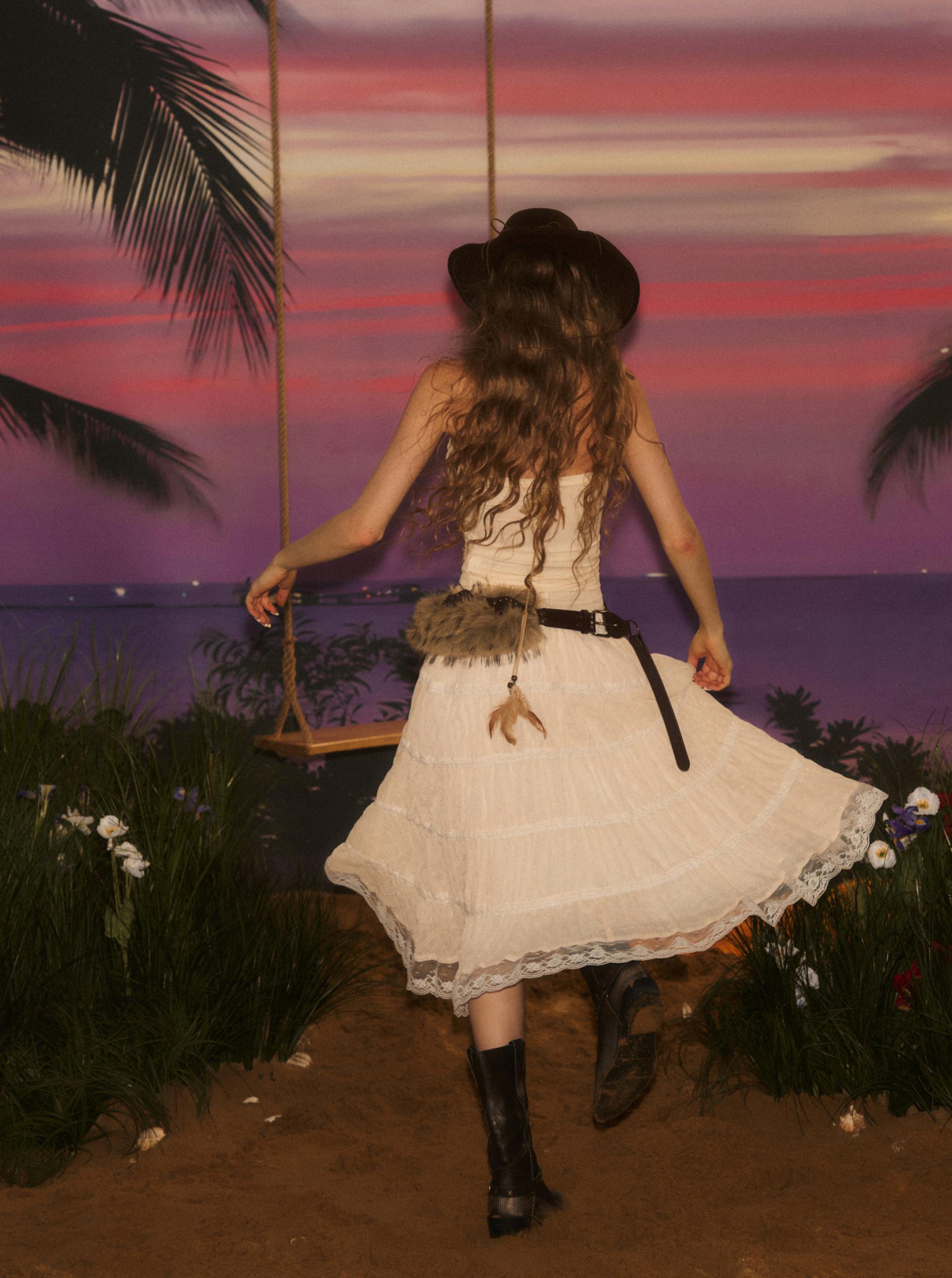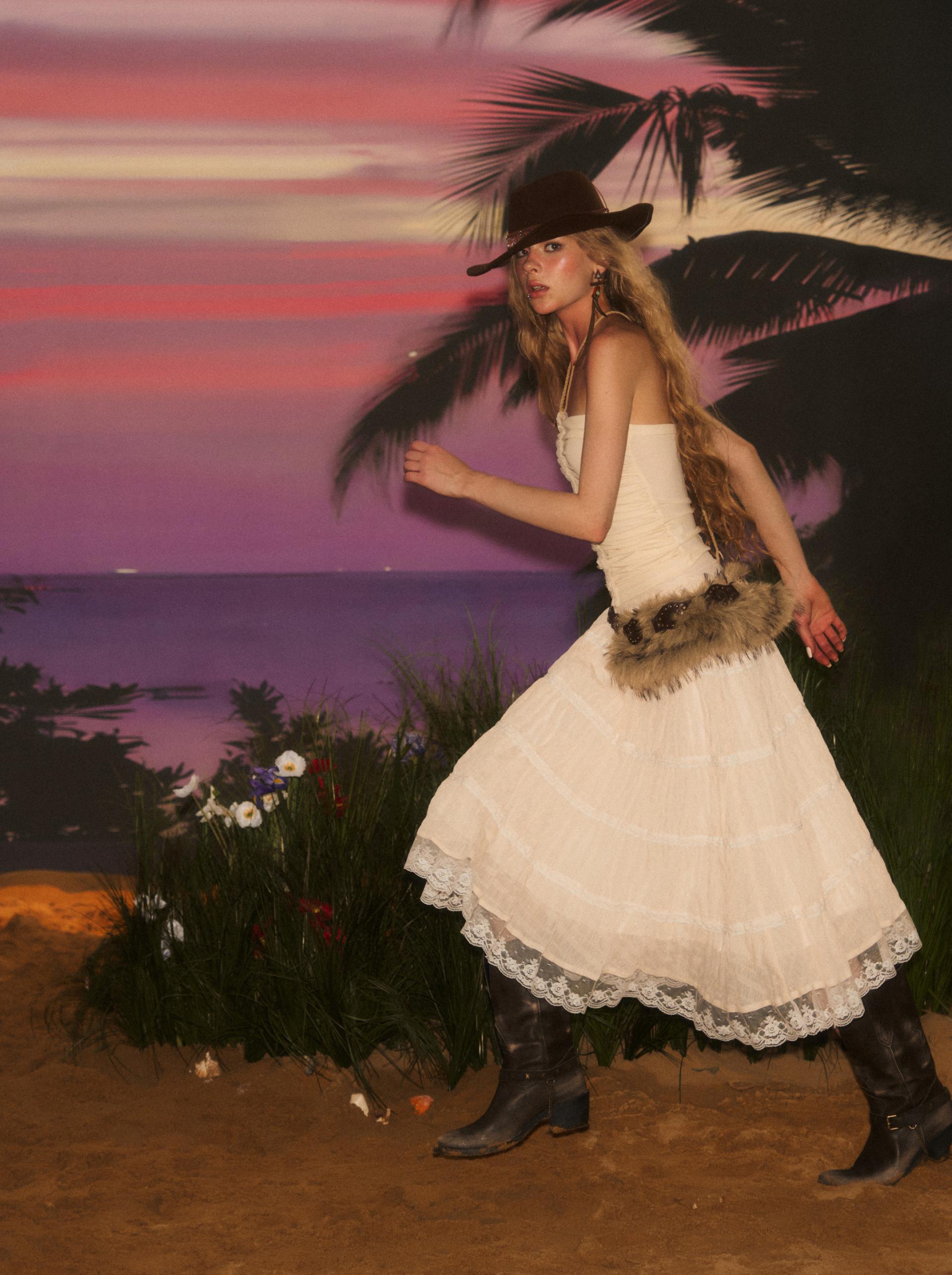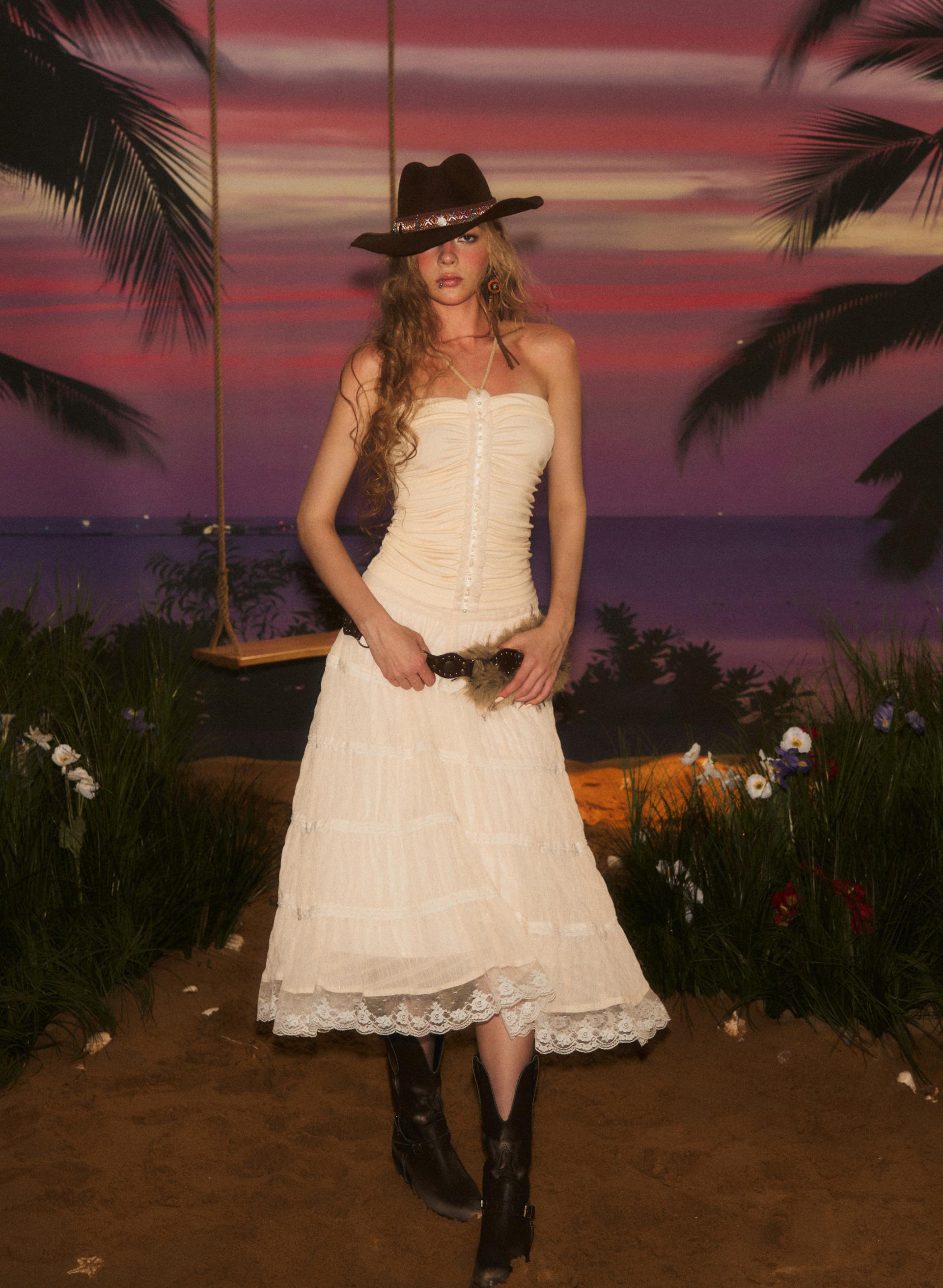 가볍고 은은한 시어 소재로 완성된 웨스턴 무드 롱 스커트로 풍성하게 퍼지는 실루엣과 레이스 디테일이 로맨틱한 무드를 더해주며 빈티지한 크림빛 컬러와 함께 한여름의 자유로운 보헤미안 감성을 연출합니다.