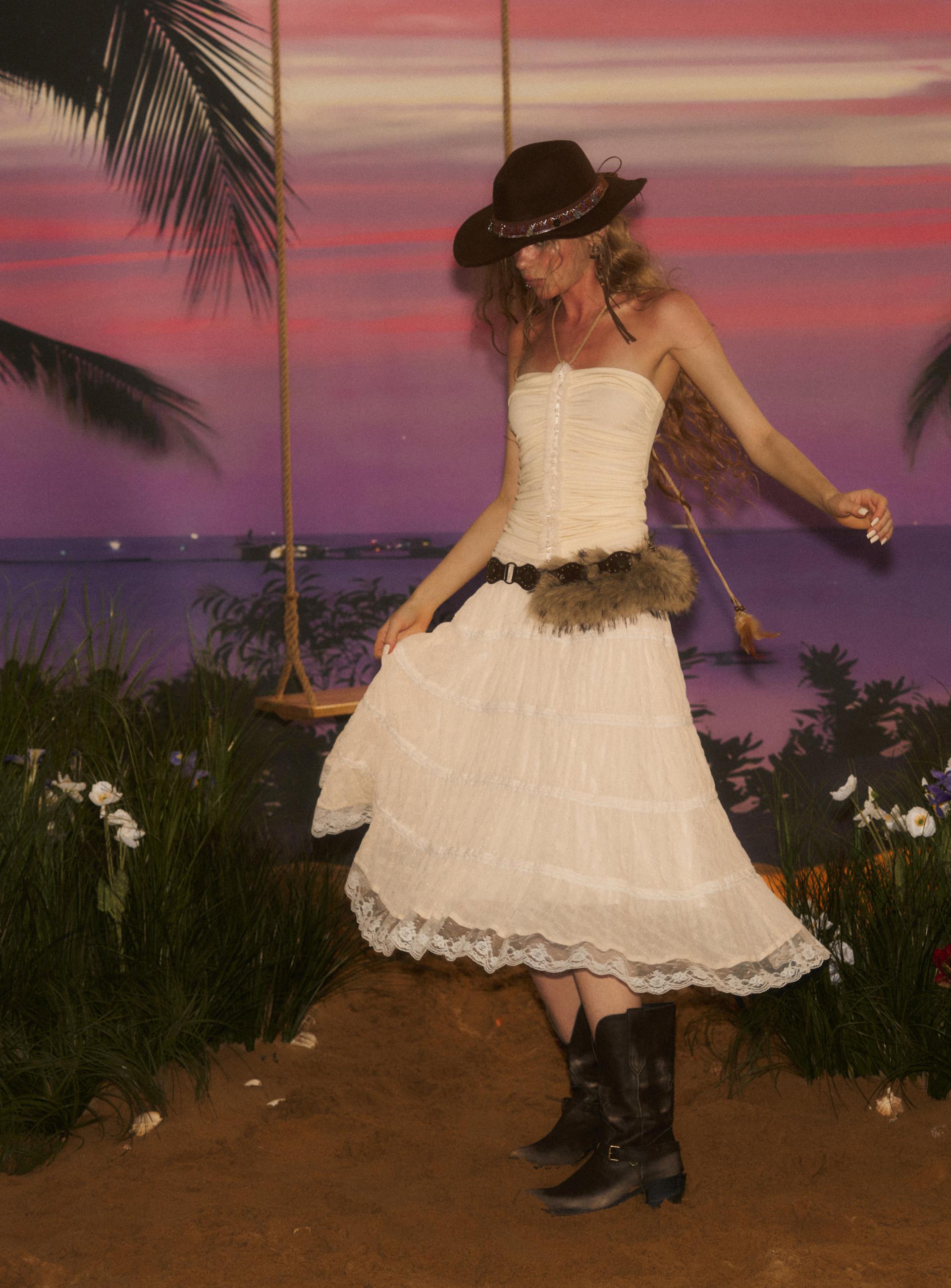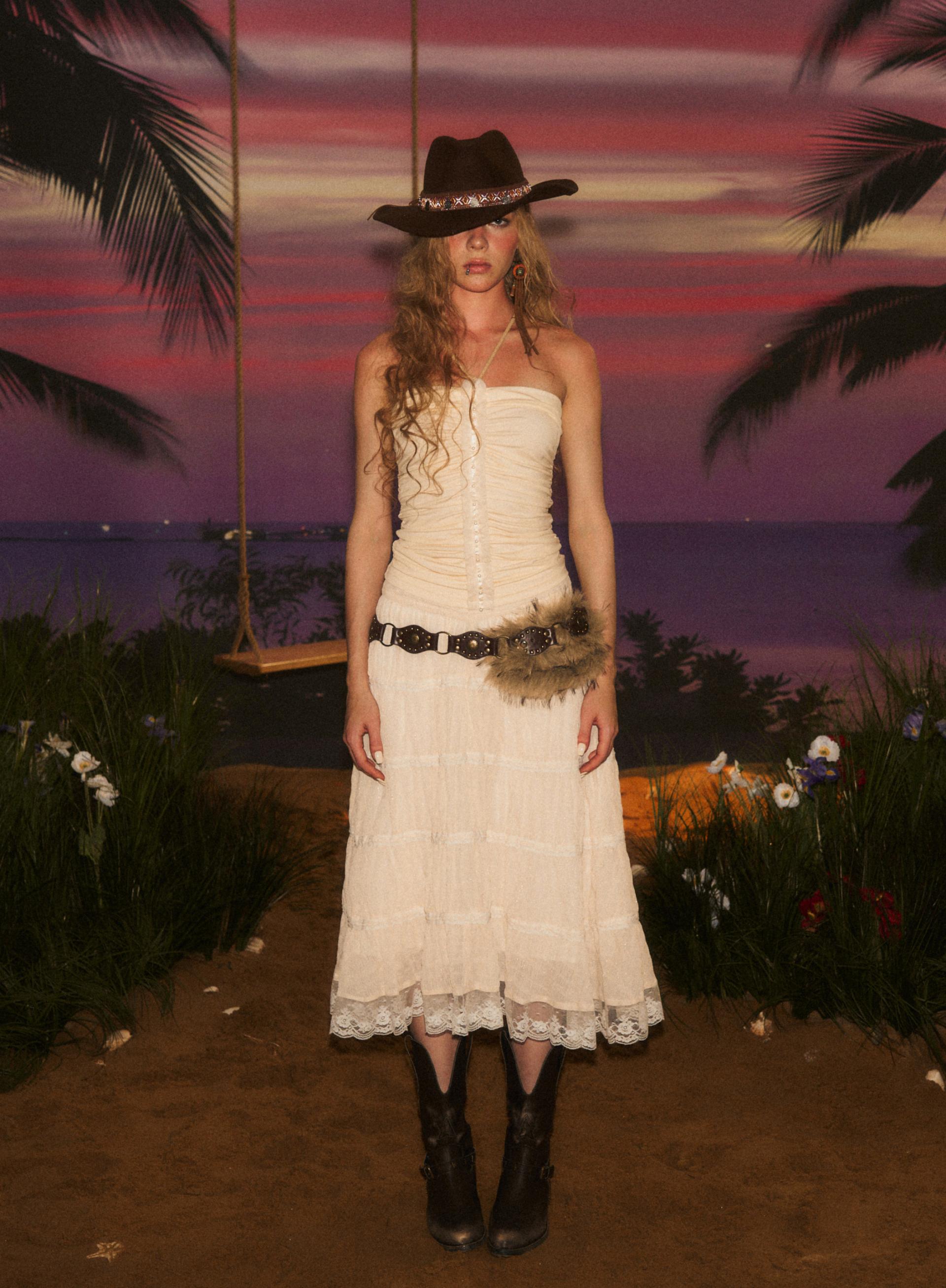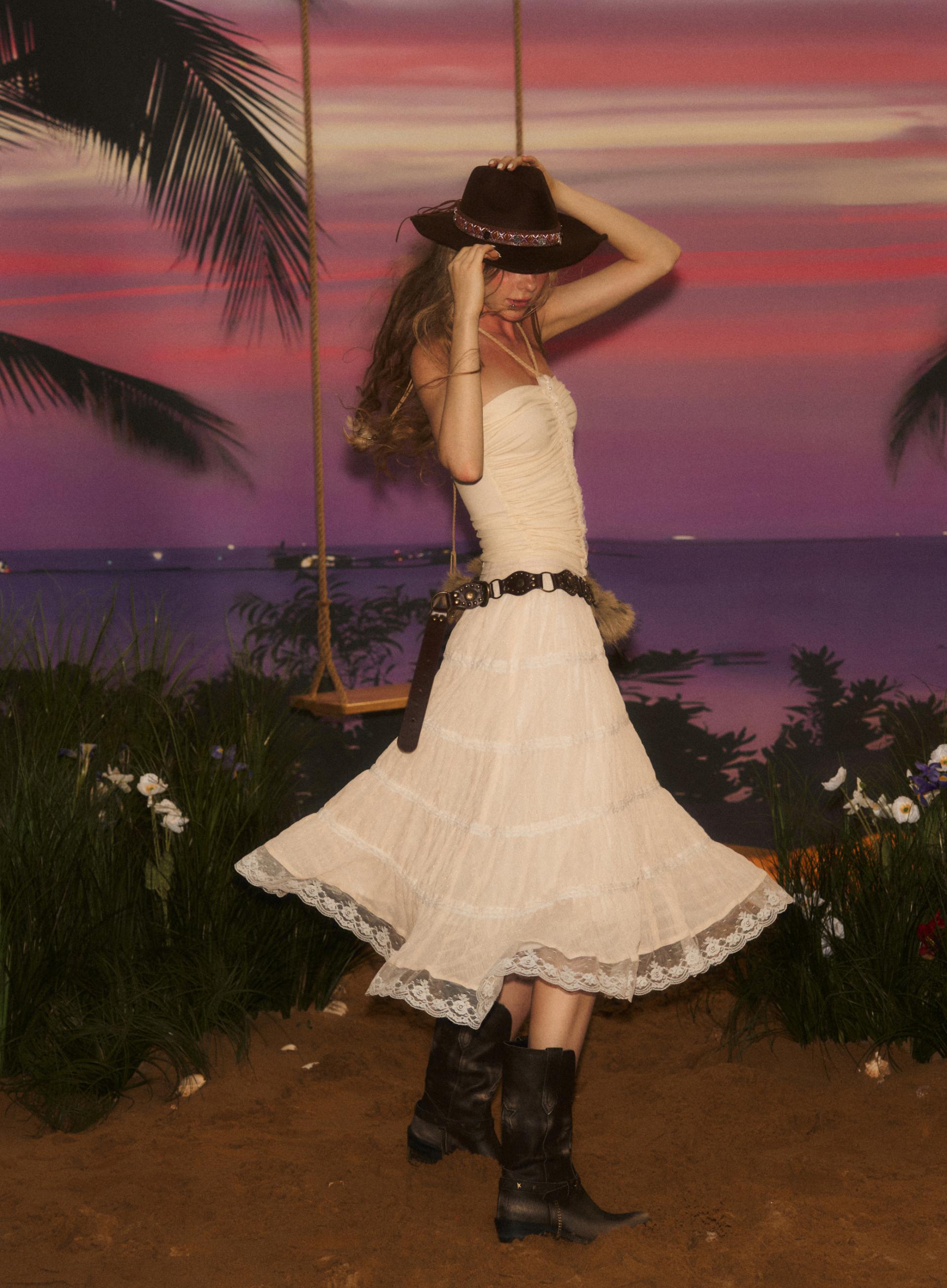 가볍고 은은한 시어 소재로 완성된 웨스턴 무드 롱 스커트로 풍성하게 퍼지는 실루엣과 레이스 디테일이 로맨틱한 무드를 더해주며 빈티지한 크림빛 컬러와 함께 한여름의 자유로운 보헤미안 감성을 연출합니다.