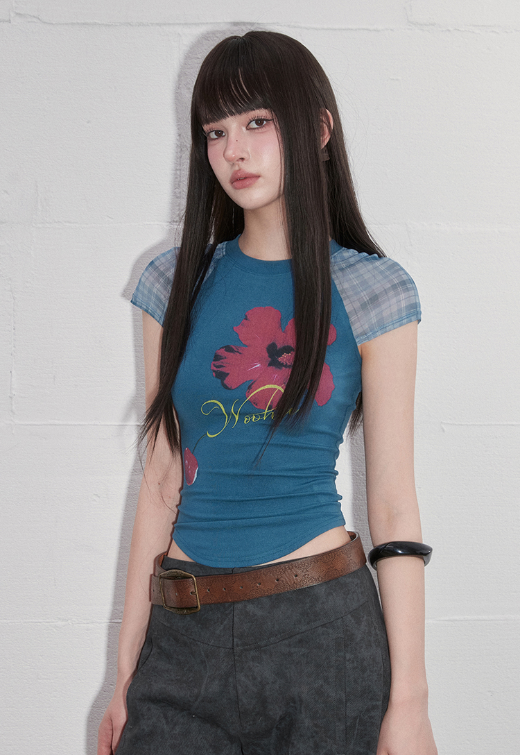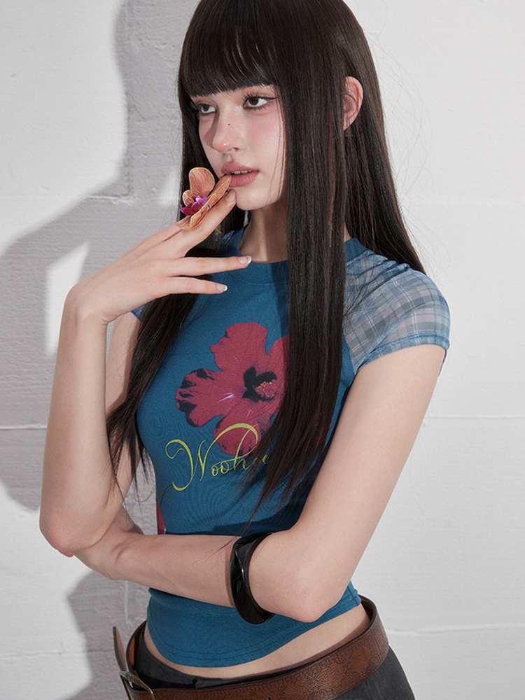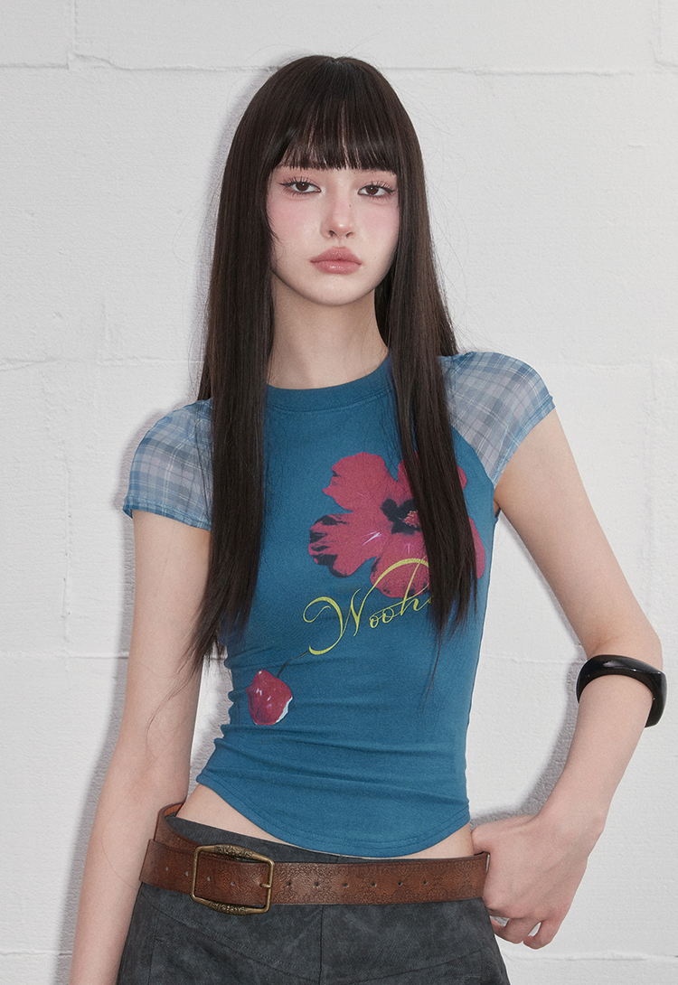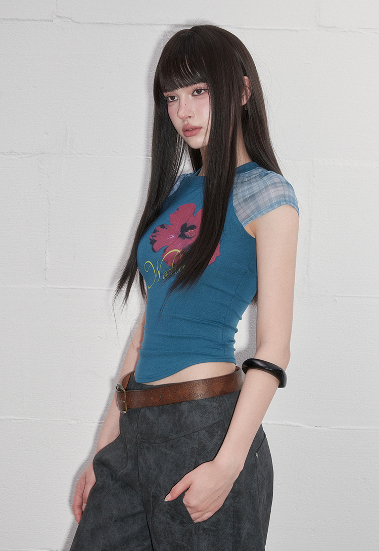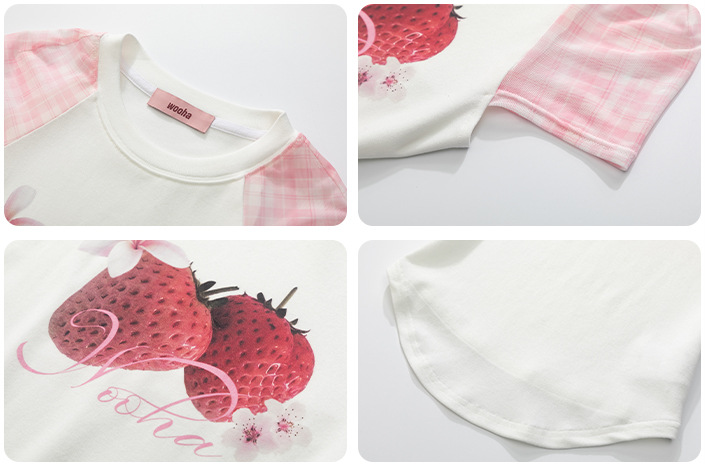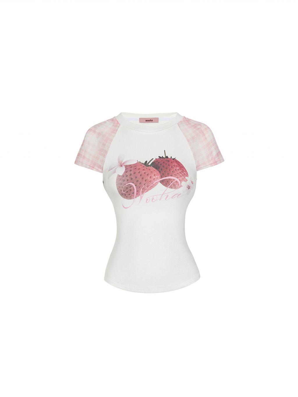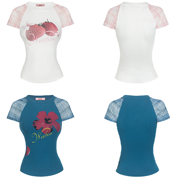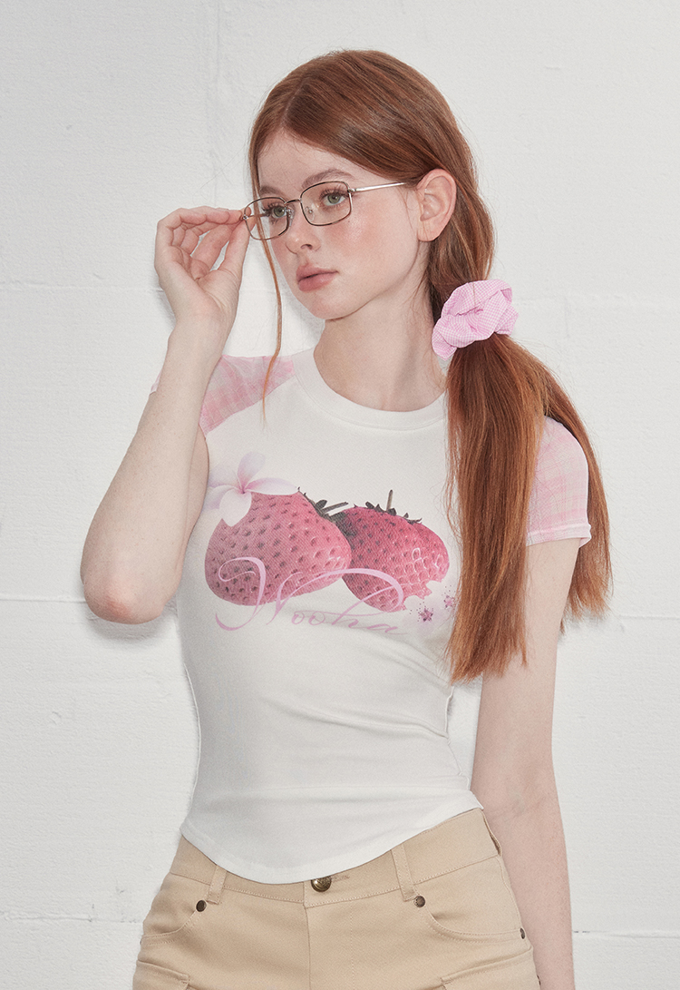 팝한 그래픽과 시스루 체크 소매가 어우러진 크롭 티셔츠로 탱글한 과일 프린트로 키치한 매력을 더하고, 바디라인을 타고 흐르는 슬림핏 실루엣으로 유니크한 무드를 완성합니다.