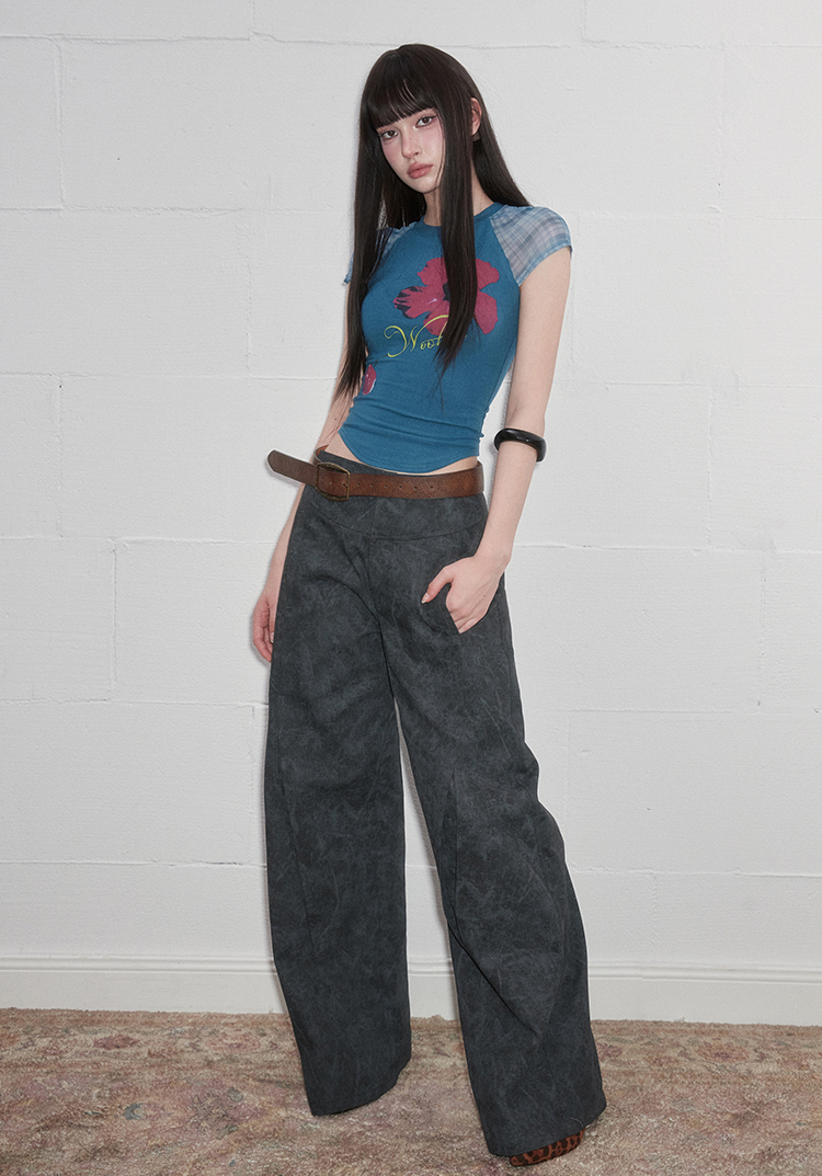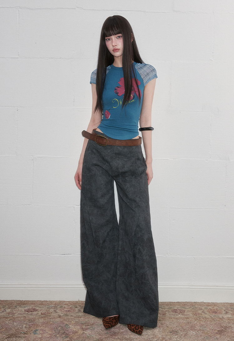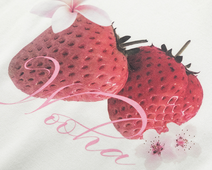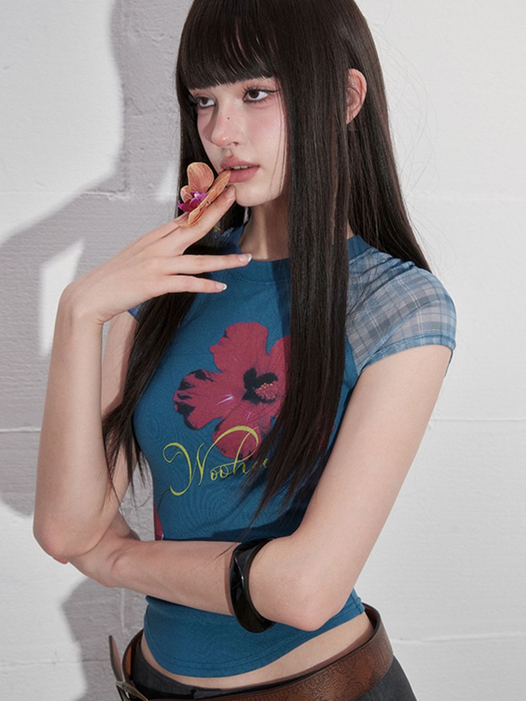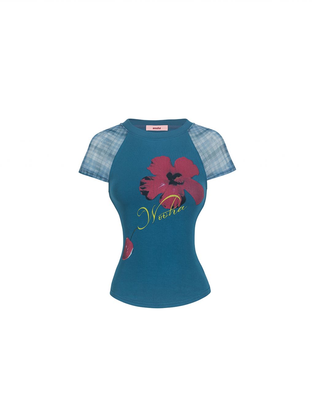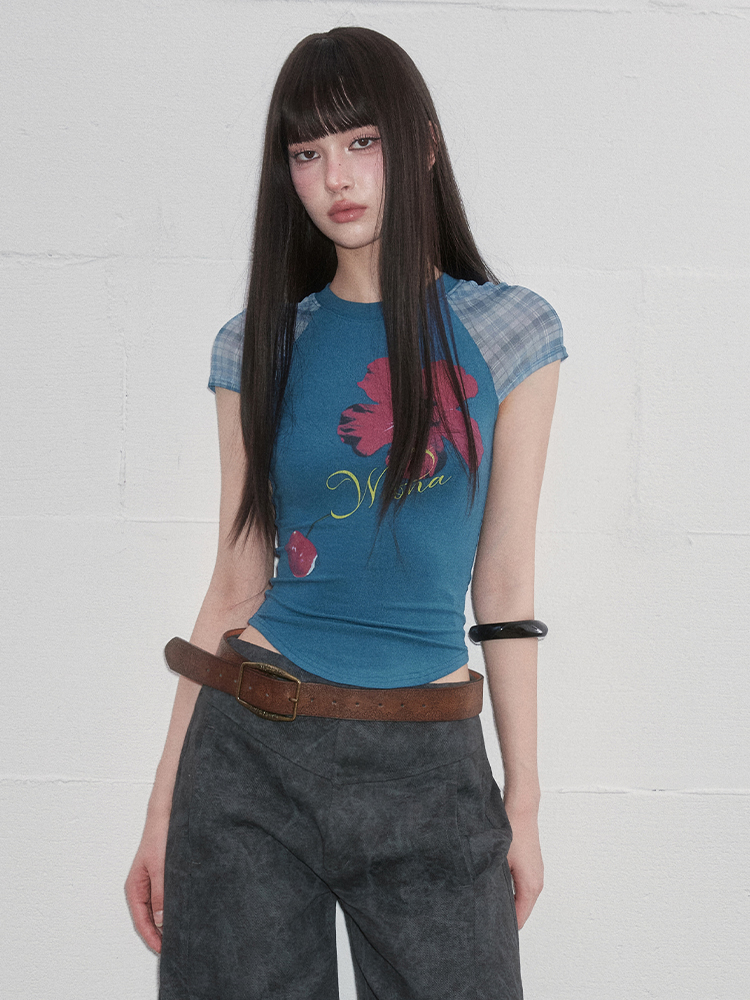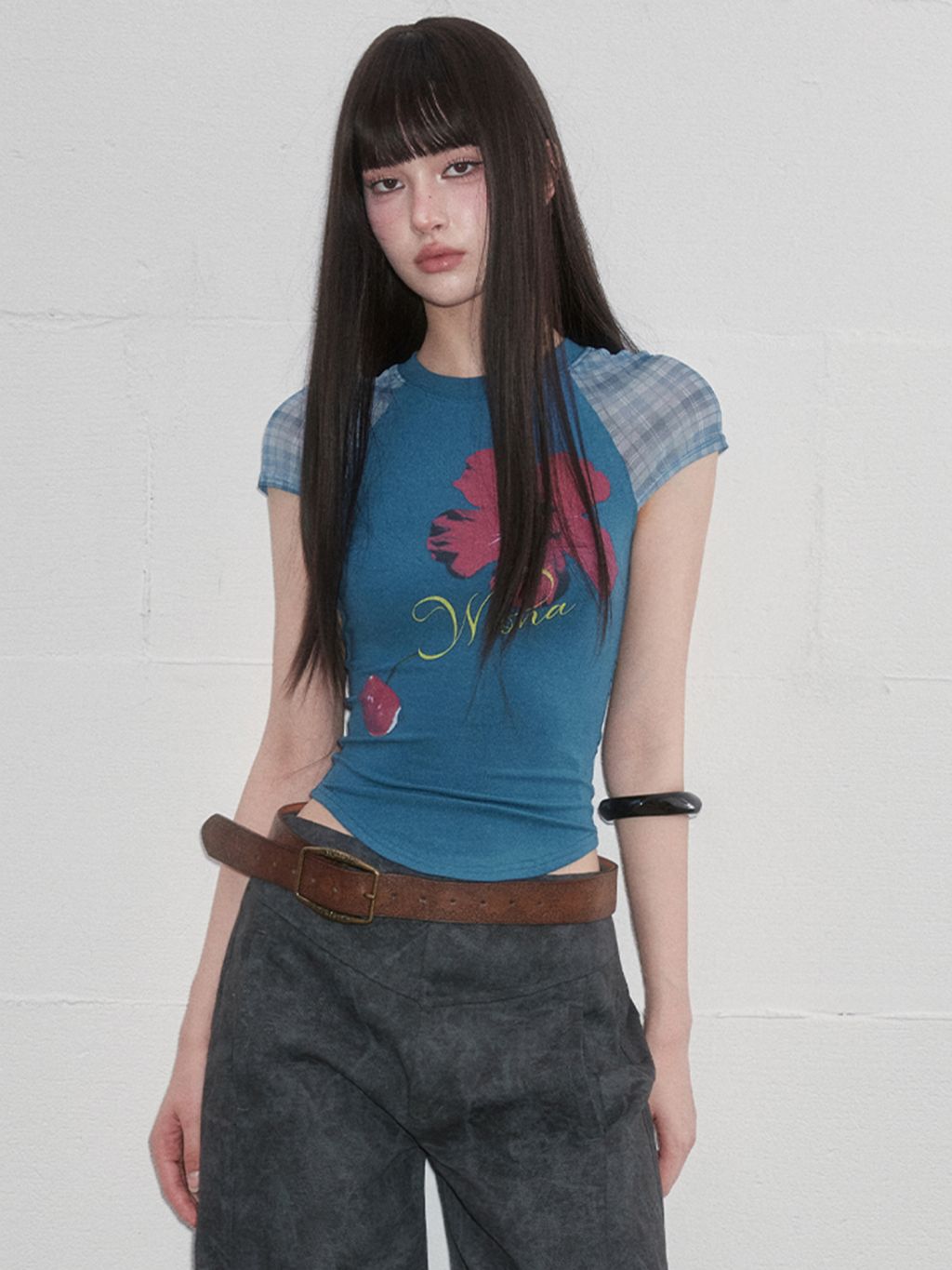 팝한 그래픽과 시스루 체크 소매가 어우러진 크롭 티셔츠로 탱글한 과일 프린트로 키치한 매력을 더하고, 바디라인을 타고 흐르는 슬림핏 실루엣으로 유니크한 무드를 완성합니다.