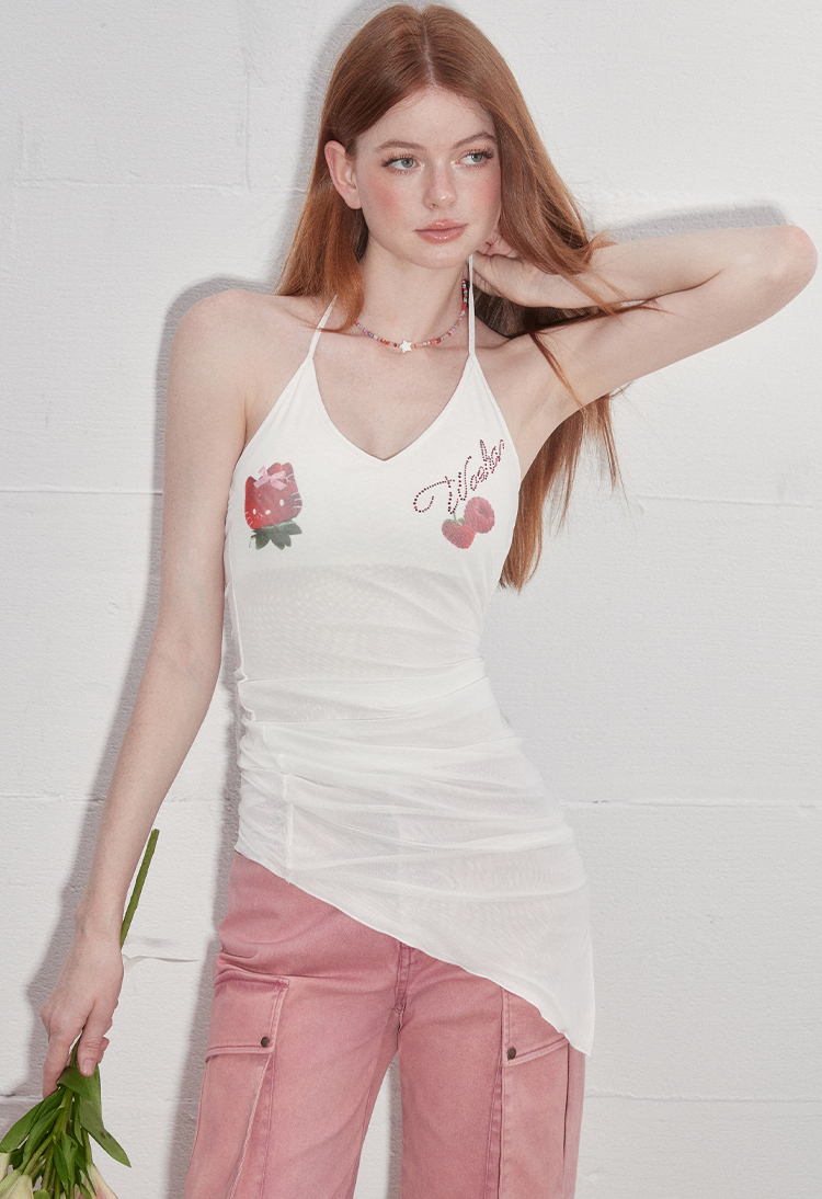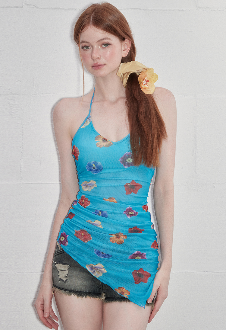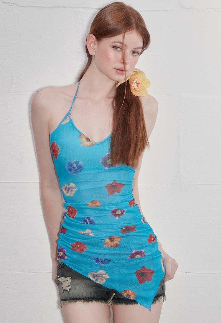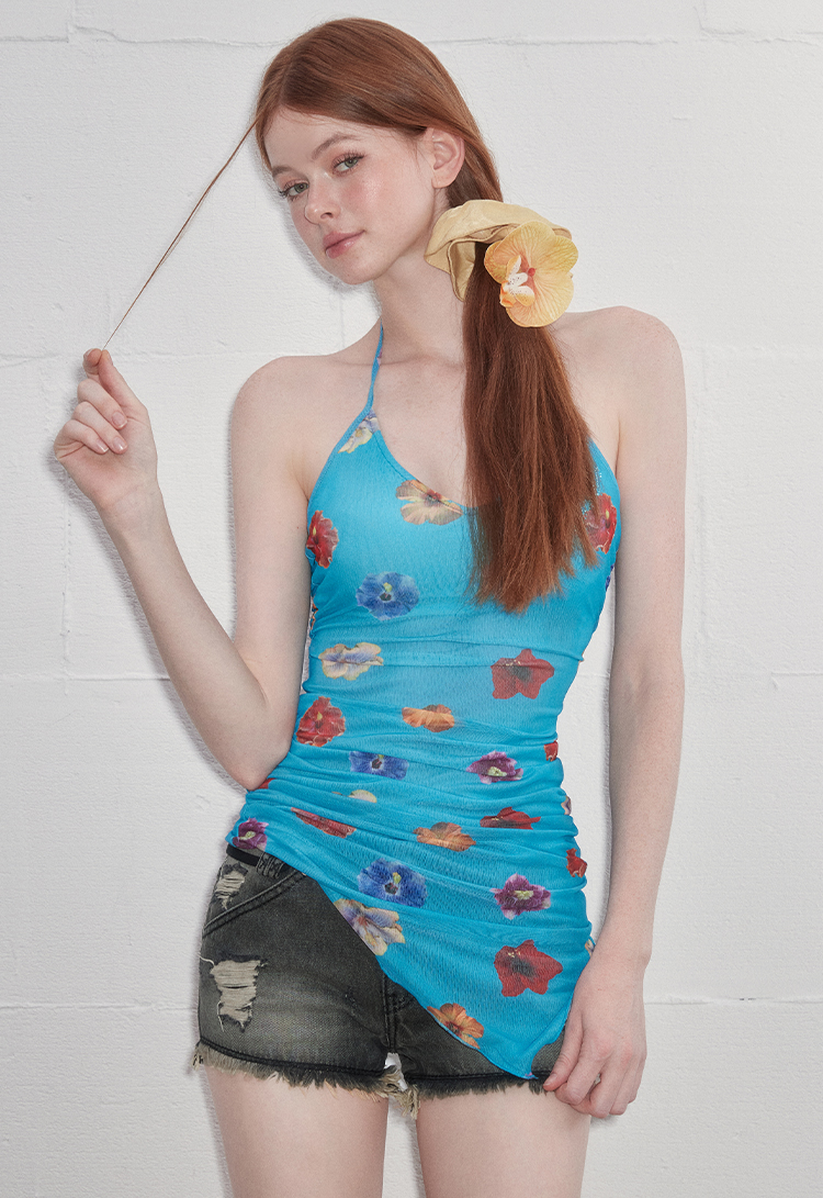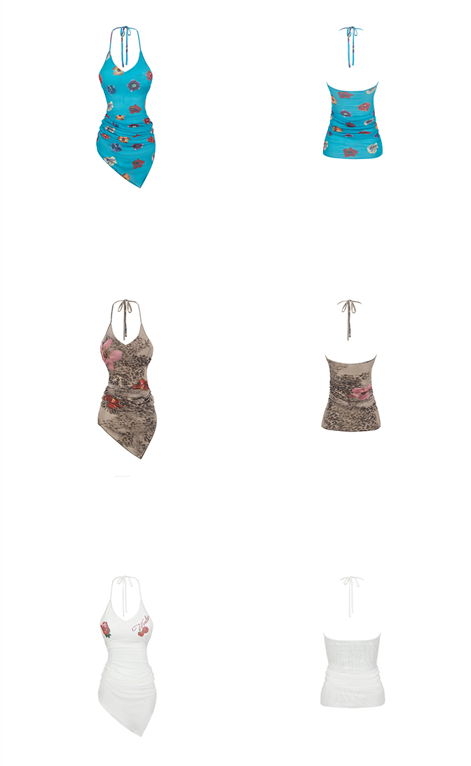 감각적인 그래픽과 입체적인 셔링 디테일로 시선을 사로잡는 홀터 탑으로 비대칭 헴라인이 스타일리시한 무드를 더하고 얇은 스트랩으로 여리한 실루엣을 연출해줍니다.