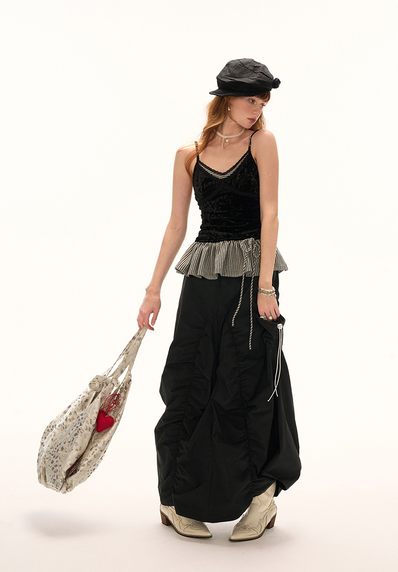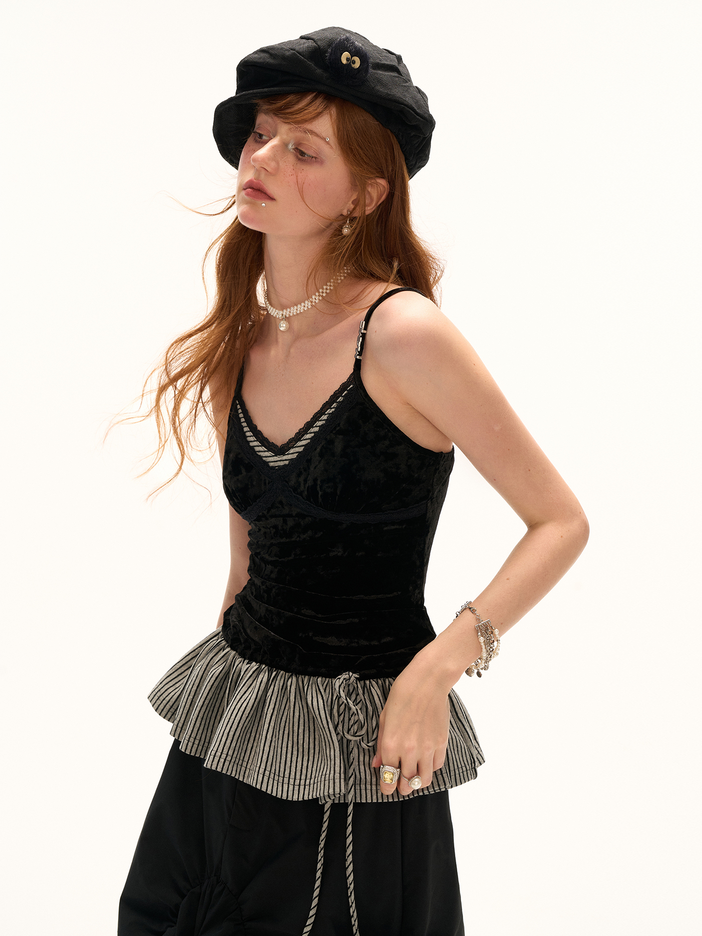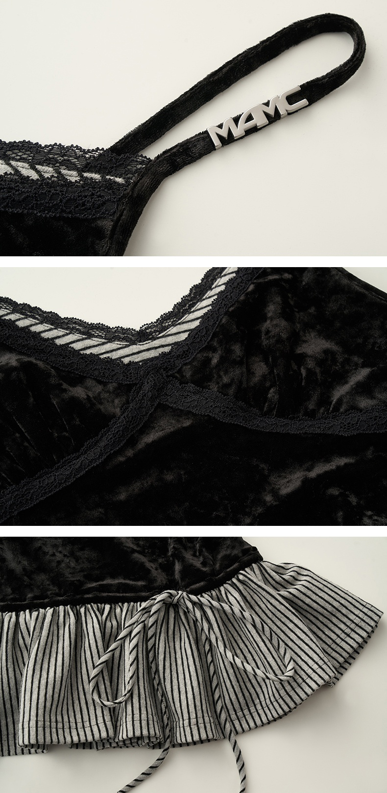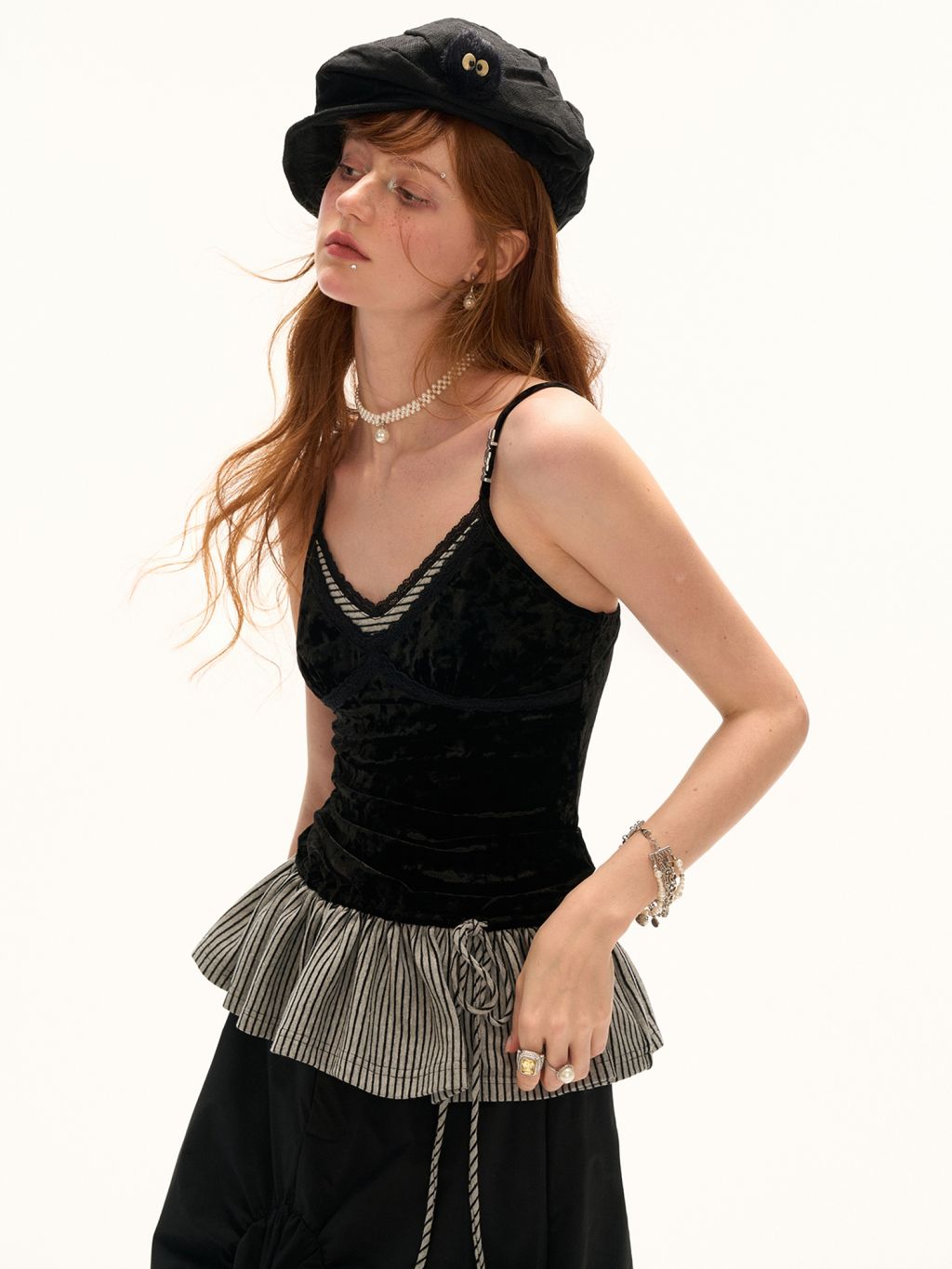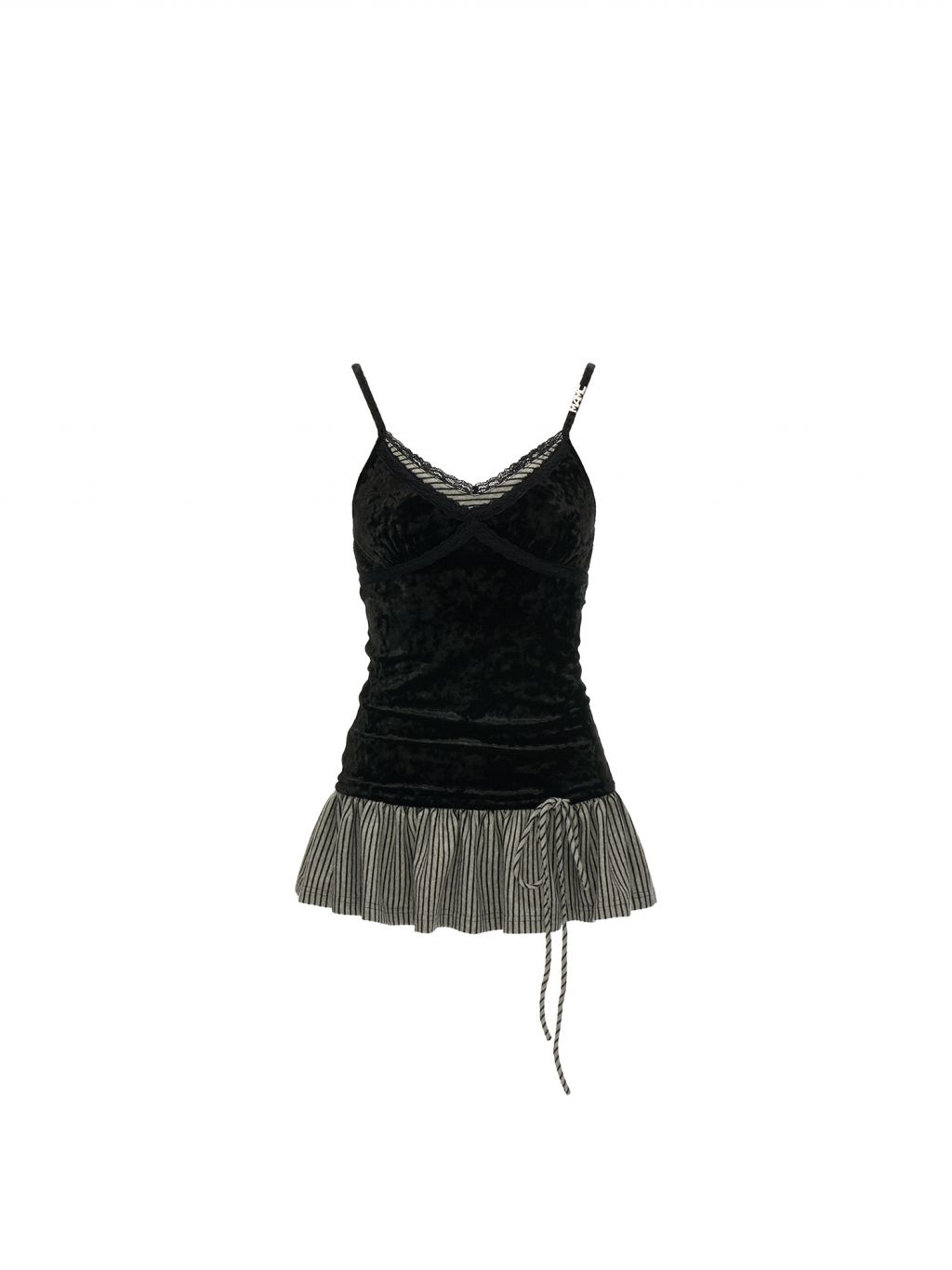 고급스러운 벨벳 소재와 스트라이프 패턴의 페플럼 디테일이 조화를 이루는 스트랩 톱으로 바디에 부드럽게 밀착되는 실루엣과 깊은 V넥 라인이 세련된 분위기를 연출하며 밑단 스트랩으로 자연스러운 셰이프 조절이 가능해 다양한 스타일링에 활용할 수 있습니다.