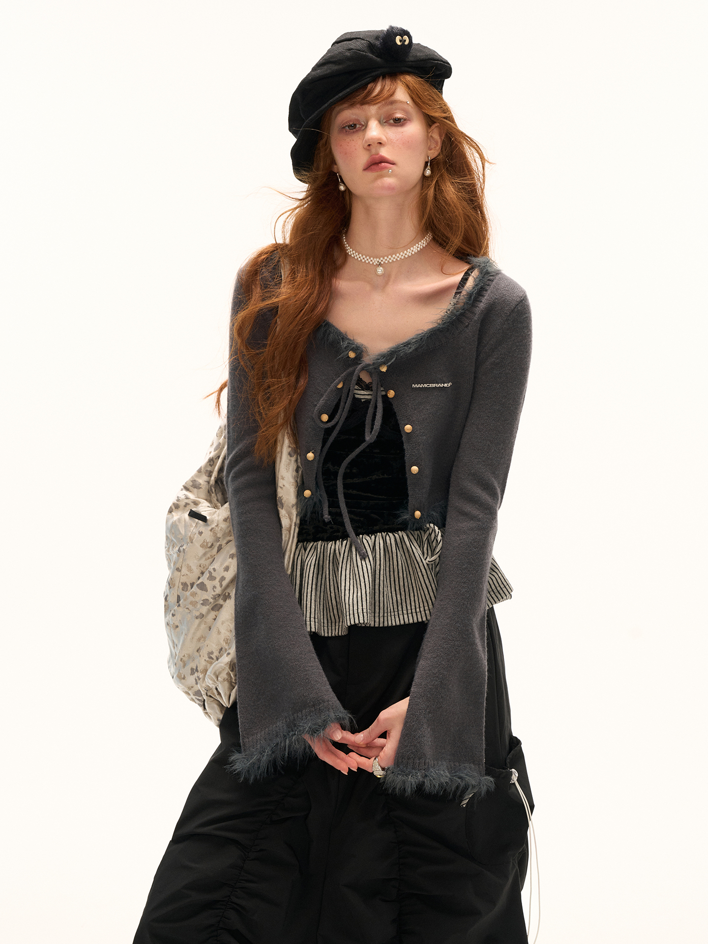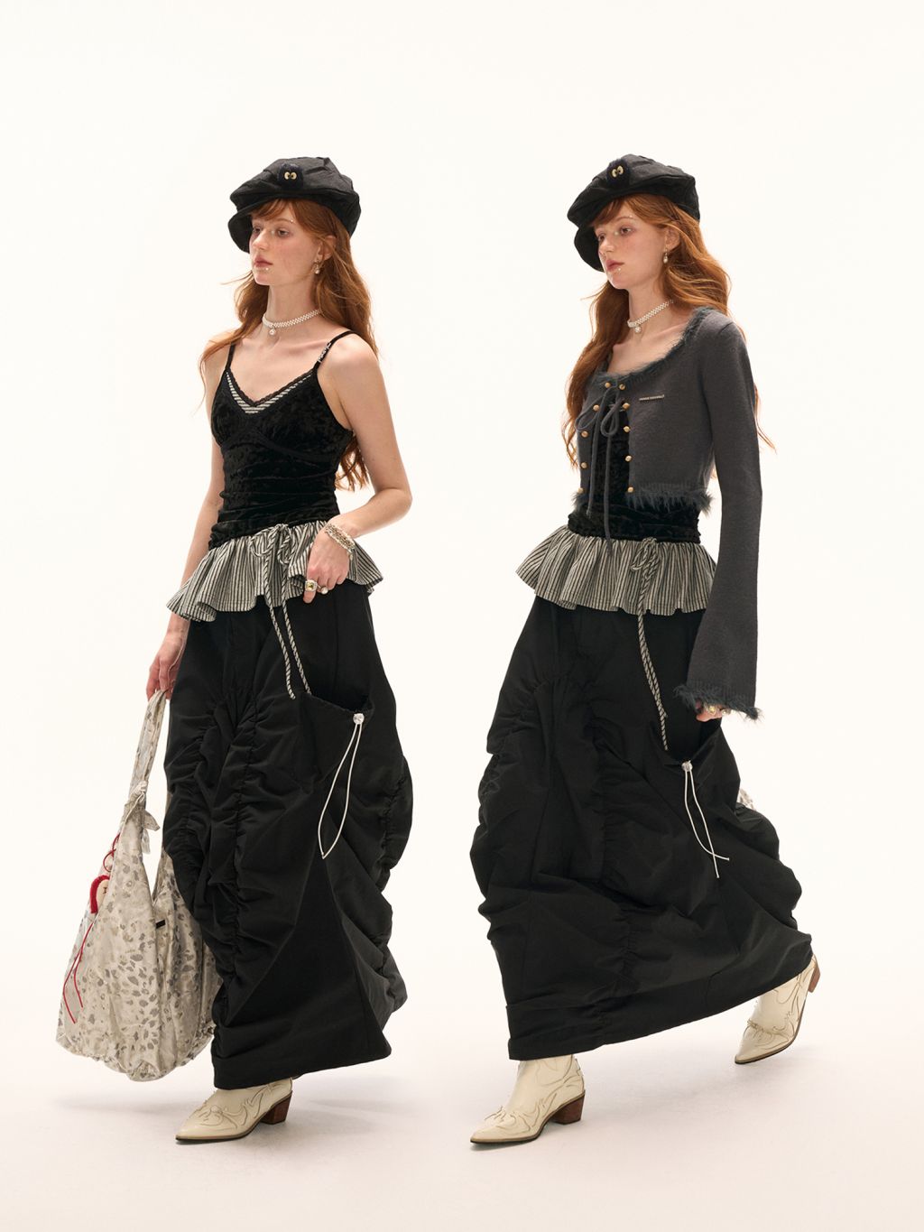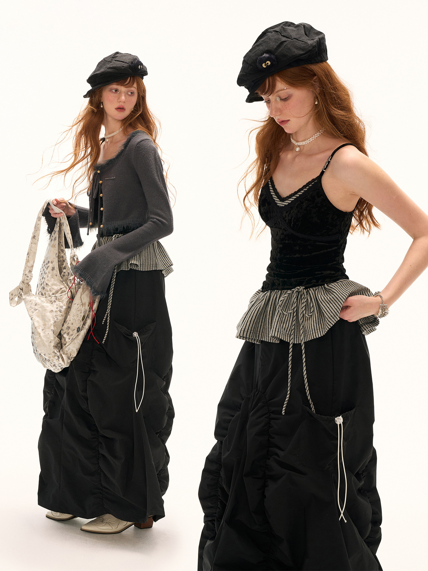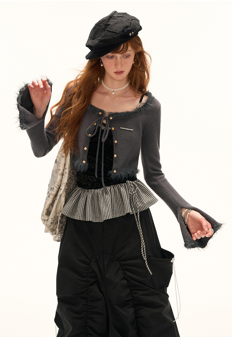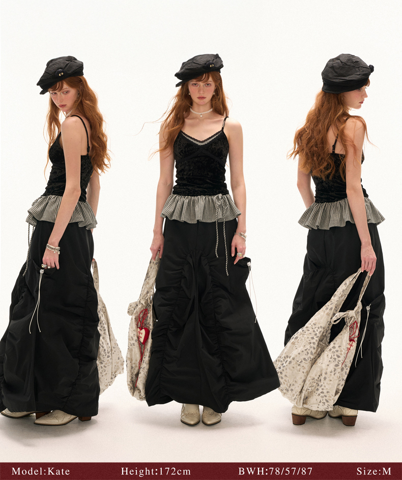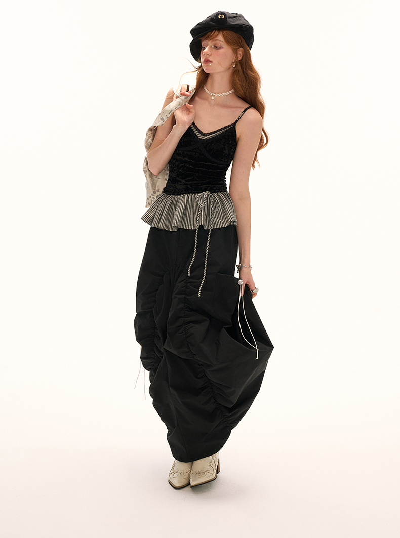 고급스러운 벨벳 소재와 스트라이프 패턴의 페플럼 디테일이 조화를 이루는 스트랩 톱으로 바디에 부드럽게 밀착되는 실루엣과 깊은 V넥 라인이 세련된 분위기를 연출하며 밑단 스트랩으로 자연스러운 셰이프 조절이 가능해 다양한 스타일링에 활용할 수 있습니다.