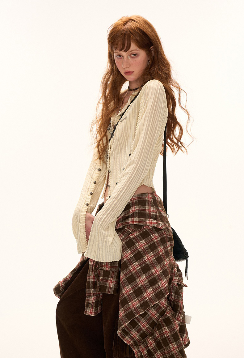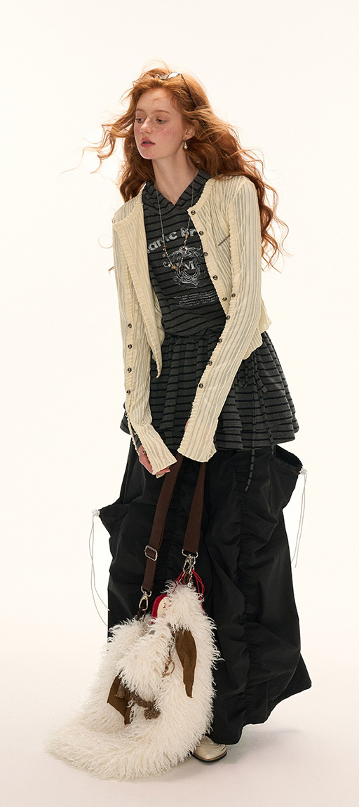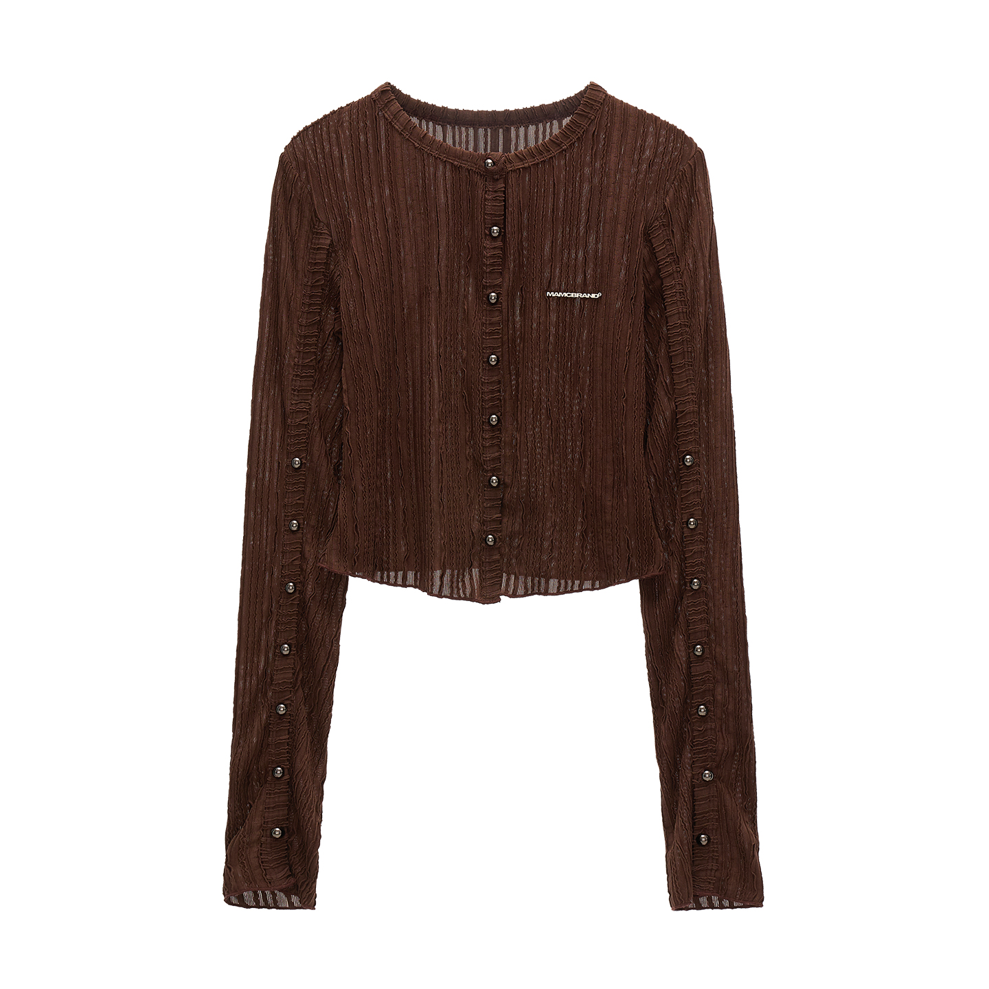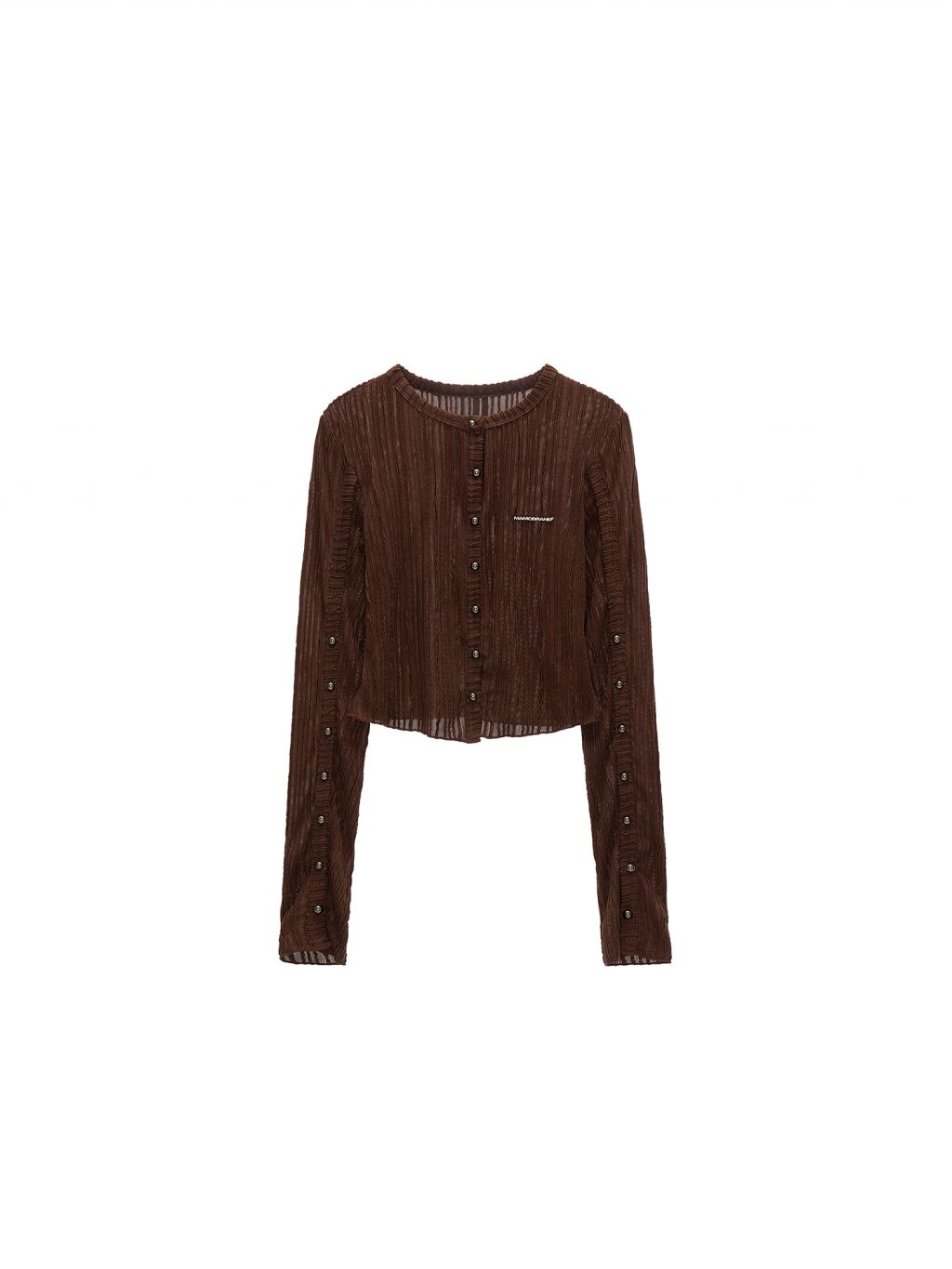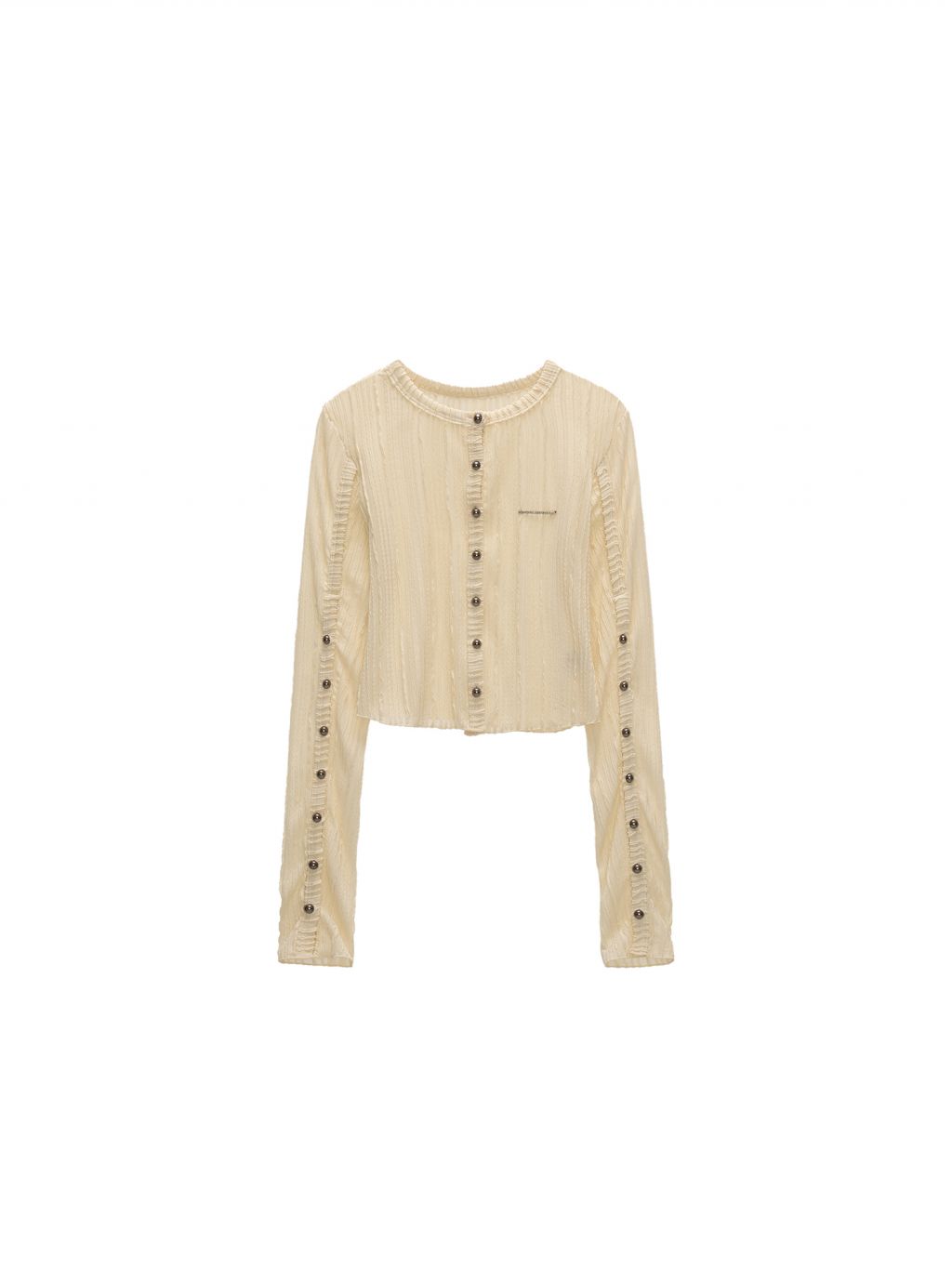 잔잔한 스트라이프 패턴과 셔링 텍스처가 돋보이는 버튼 가디건으로 소매와 프론트 전면에 이어진 버튼 디테일로 다양한 스타일링 연출이 가능하며 크롭 기장과 슬림한 실루엣으로 단독 또는 레이어드 착용 시 세련된 무드를 완성합니다.