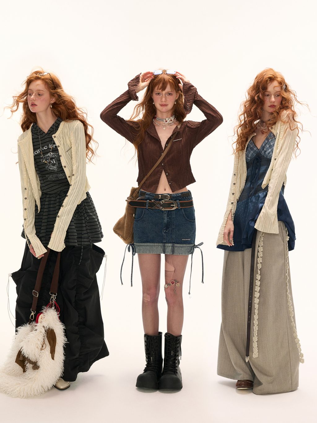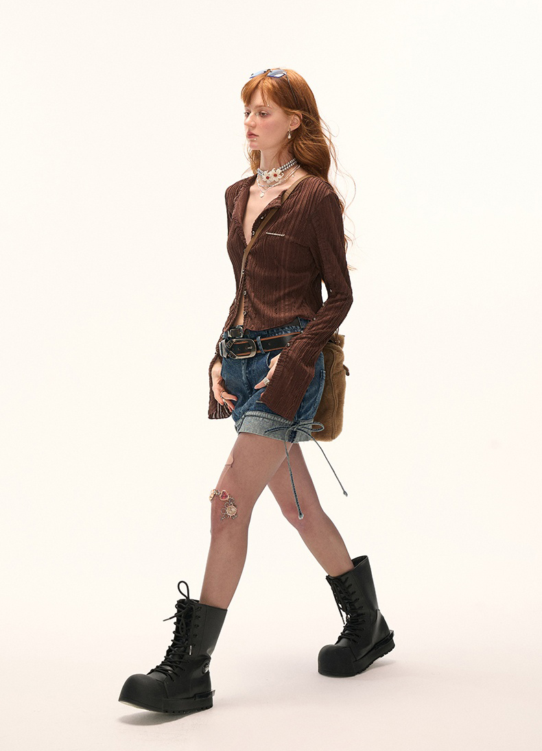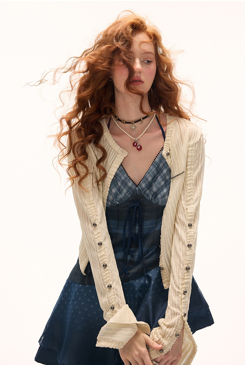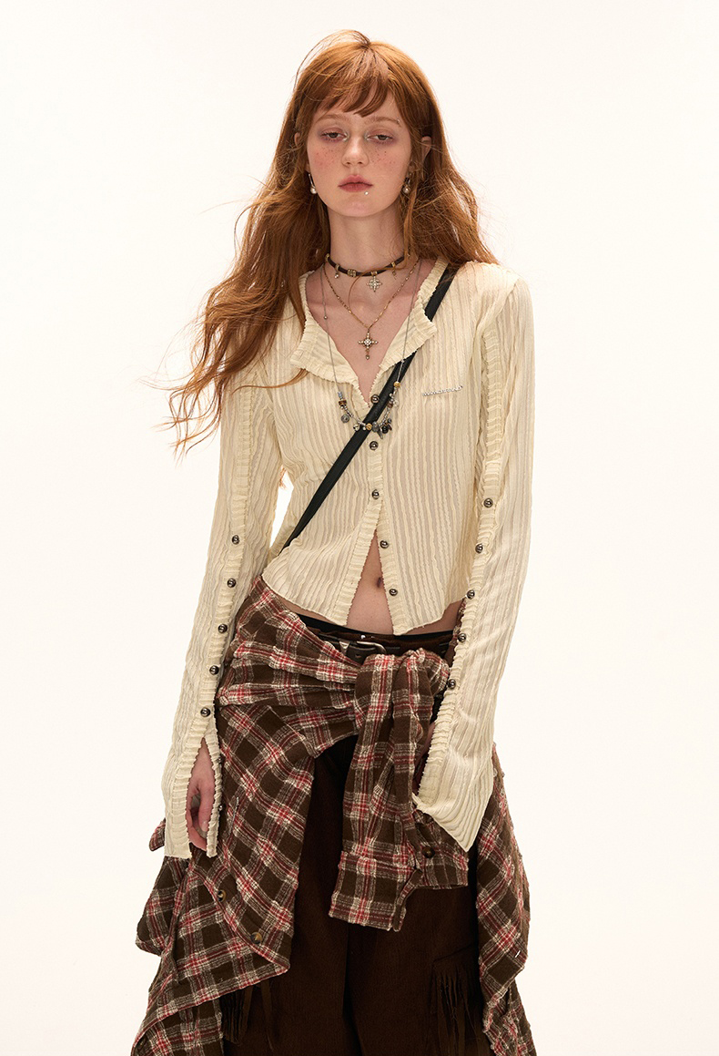 잔잔한 스트라이프 패턴과 셔링 텍스처가 돋보이는 버튼 가디건으로 소매와 프론트 전면에 이어진 버튼 디테일로 다양한 스타일링 연출이 가능하며 크롭 기장과 슬림한 실루엣으로 단독 또는 레이어드 착용 시 세련된 무드를 완성합니다.