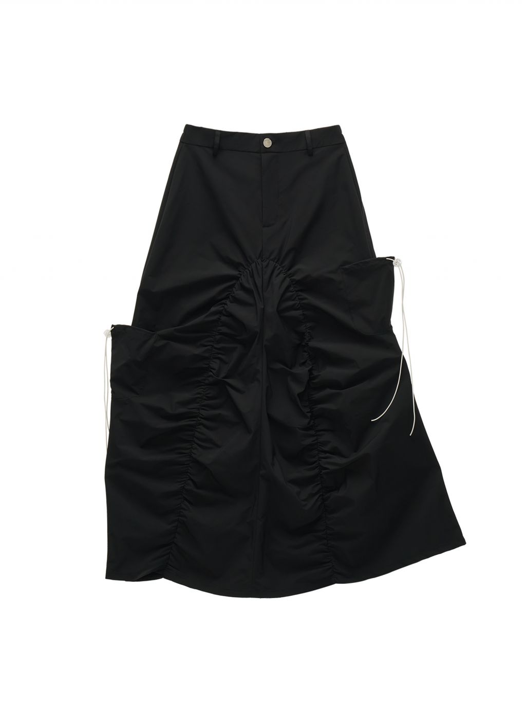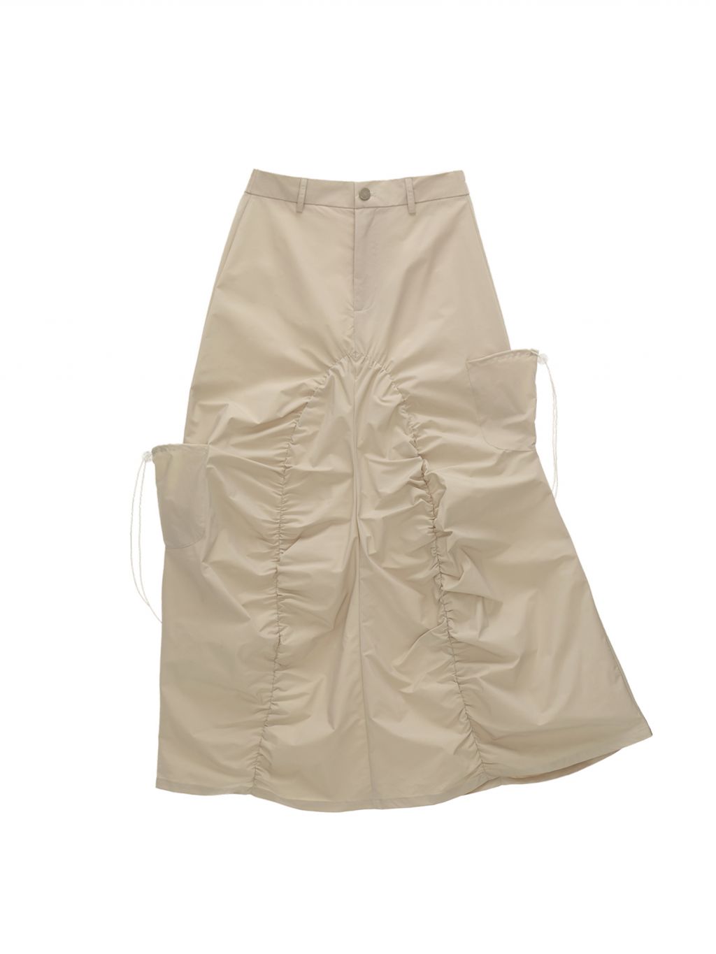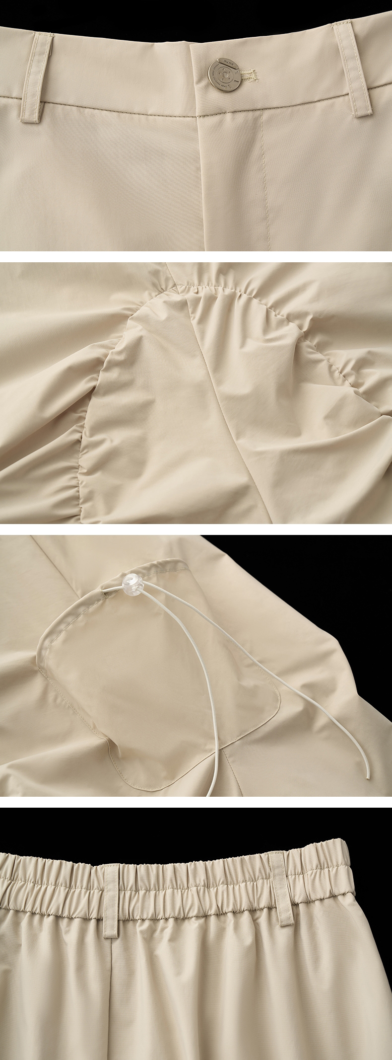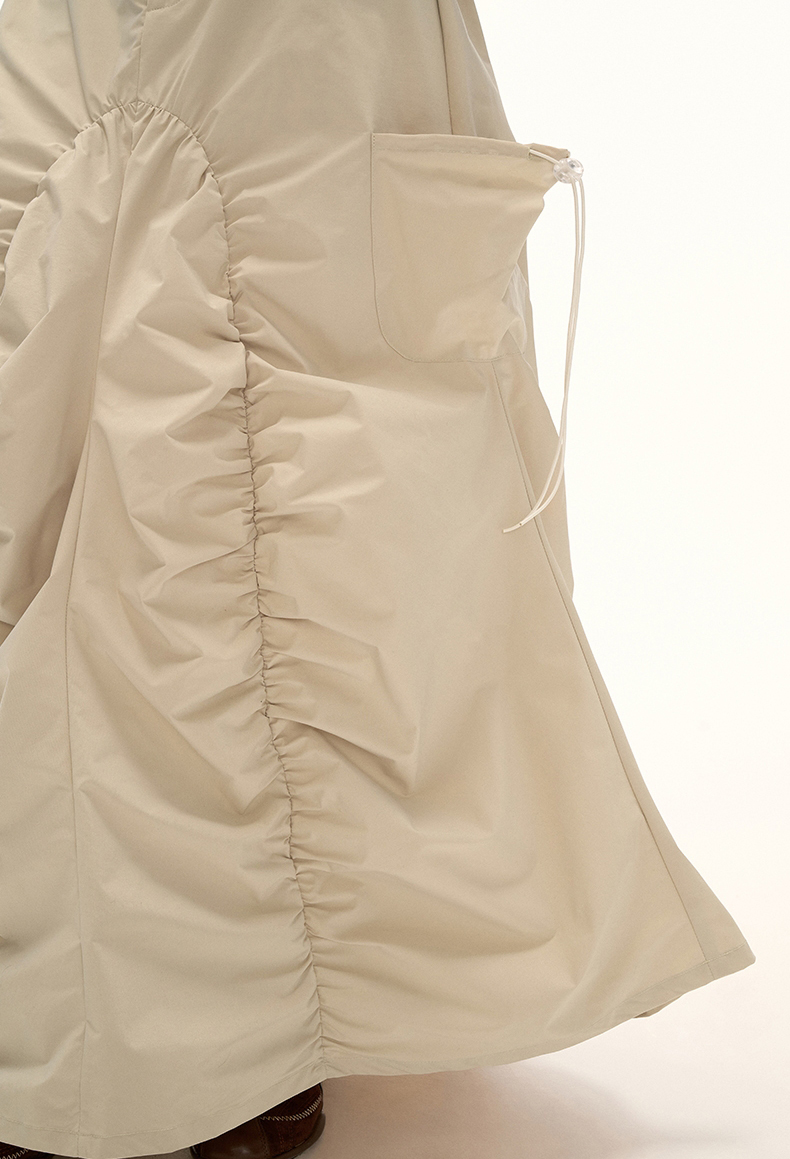 입체적인 셔링 디테일과 카고 포켓이 어우러져 유니크한 무드를 완성하며 드로스트링으로 실루엣 변형이 가능해 스타일에 따라 다양한 분위기를 연출할 수 있습니다.