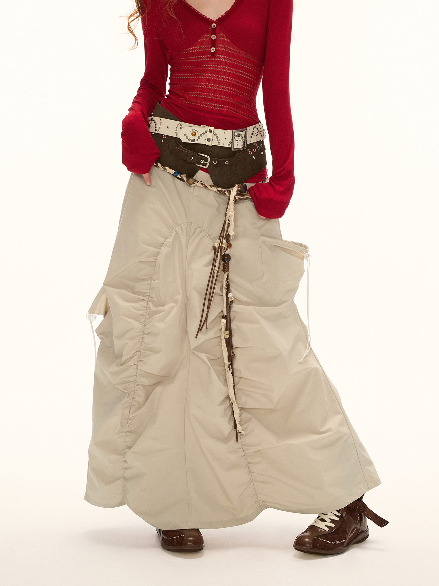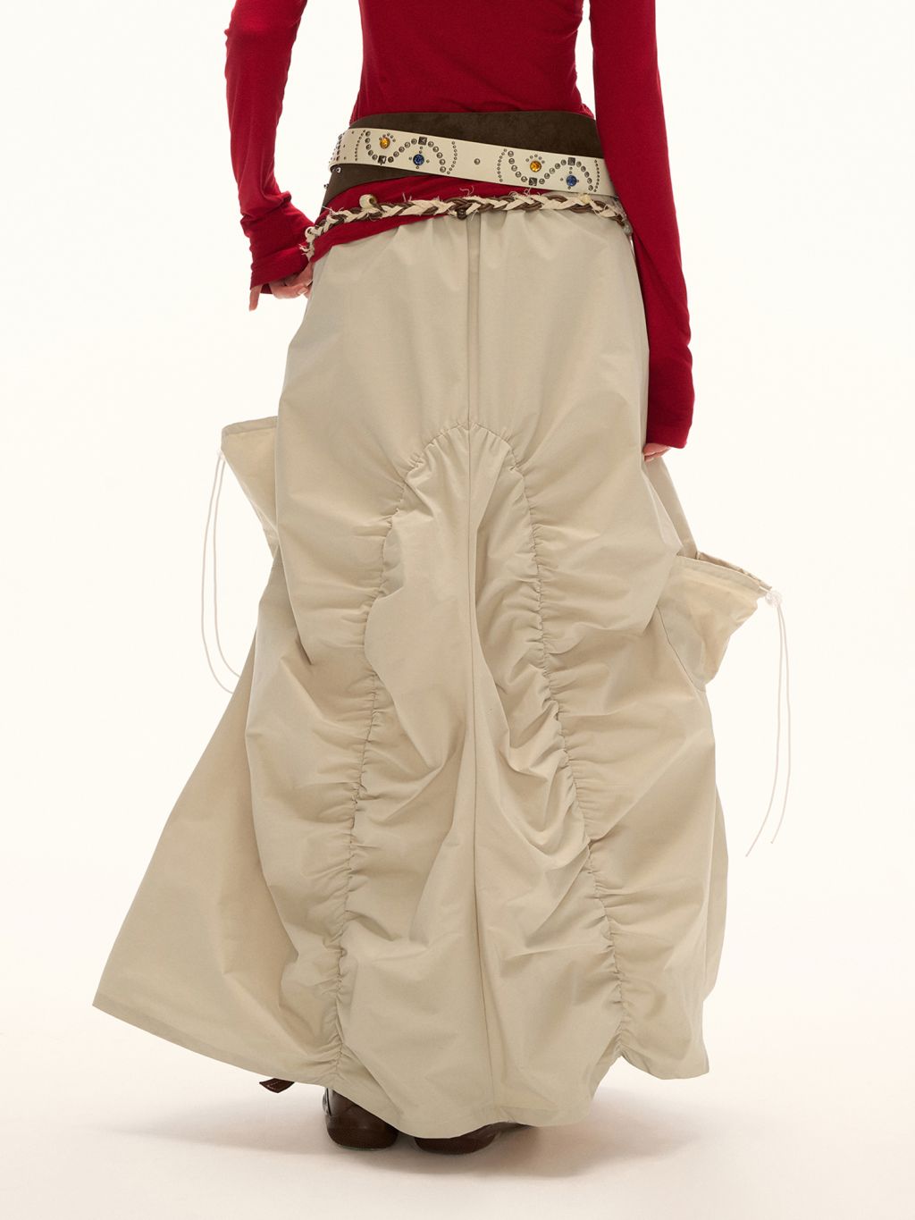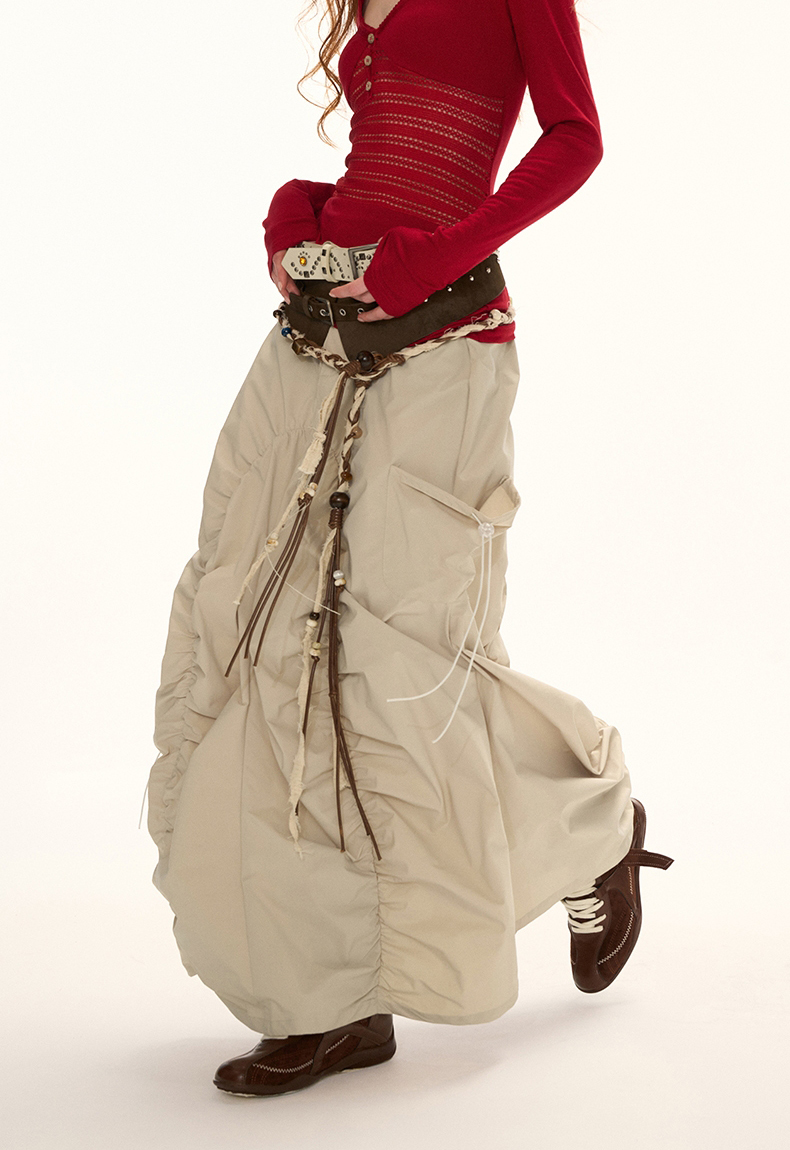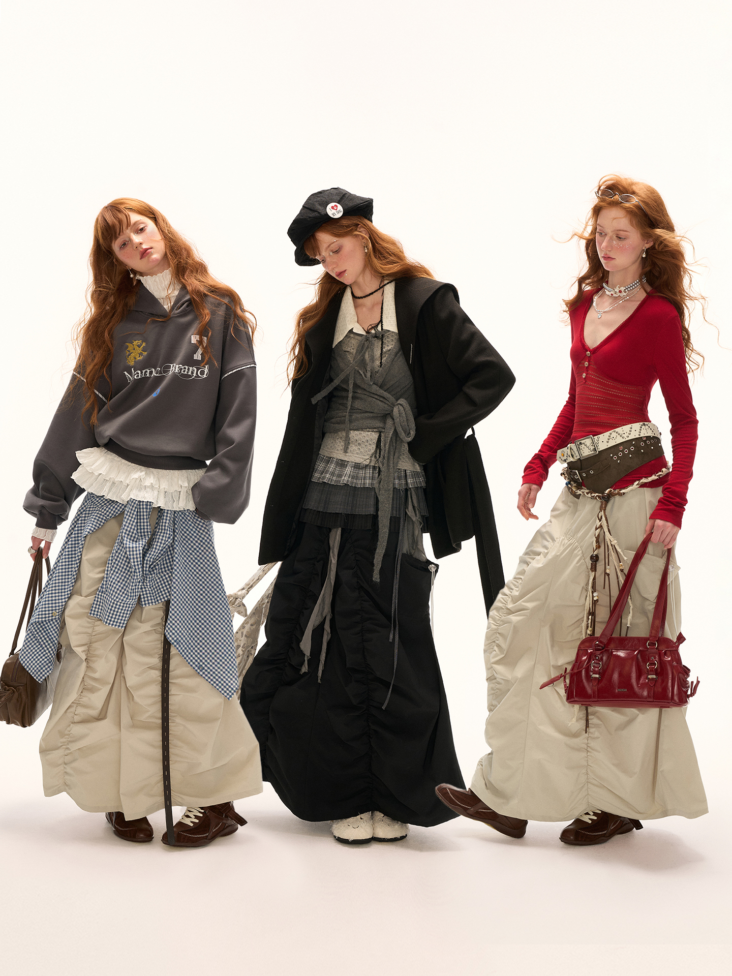 입체적인 셔링 디테일과 카고 포켓이 어우러져 유니크한 무드를 완성하며 드로스트링으로 실루엣 변형이 가능해 스타일에 따라 다양한 분위기를 연출할 수 있습니다.