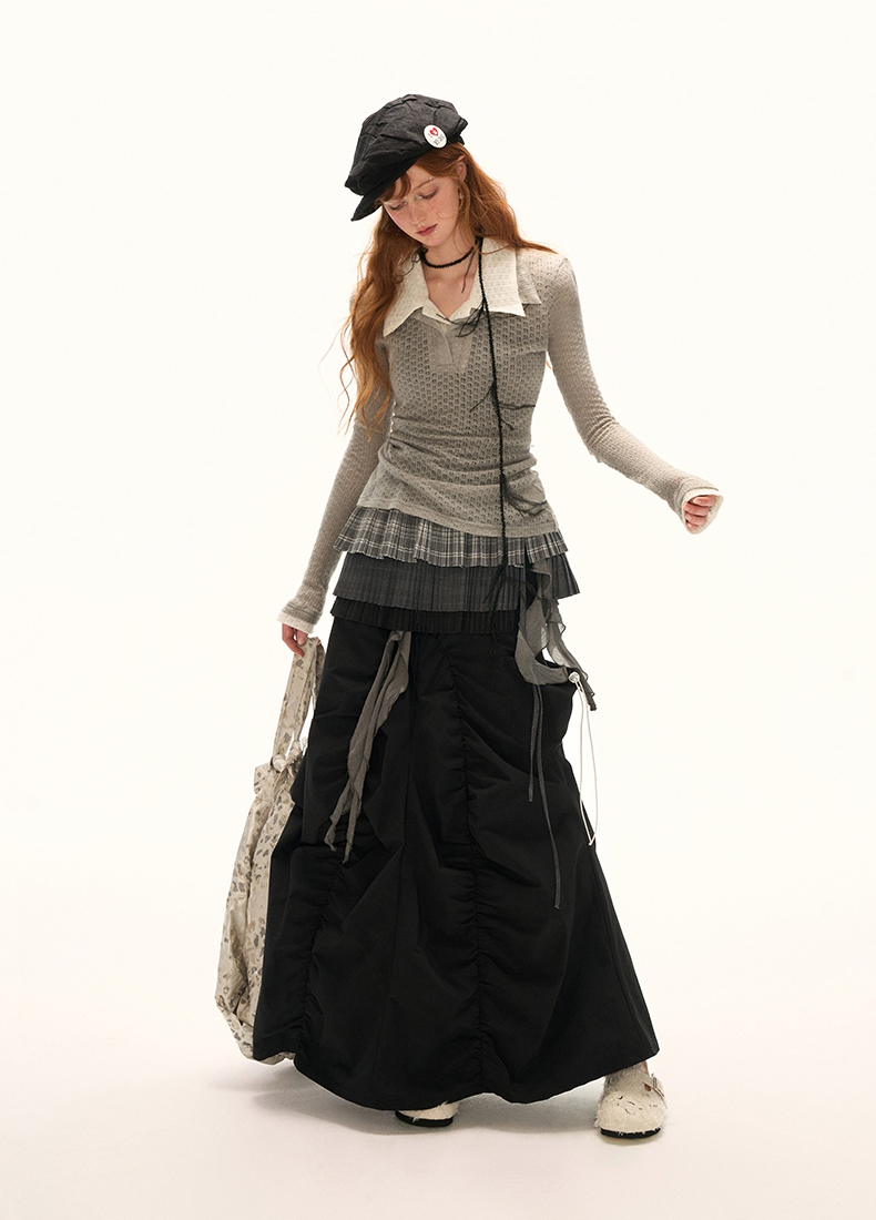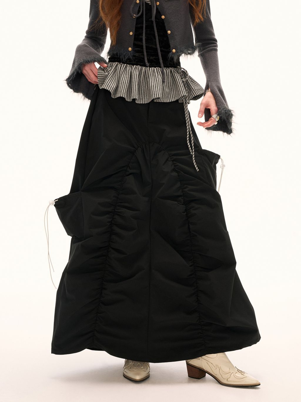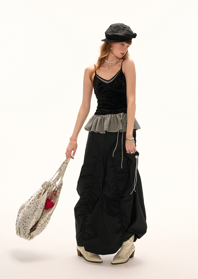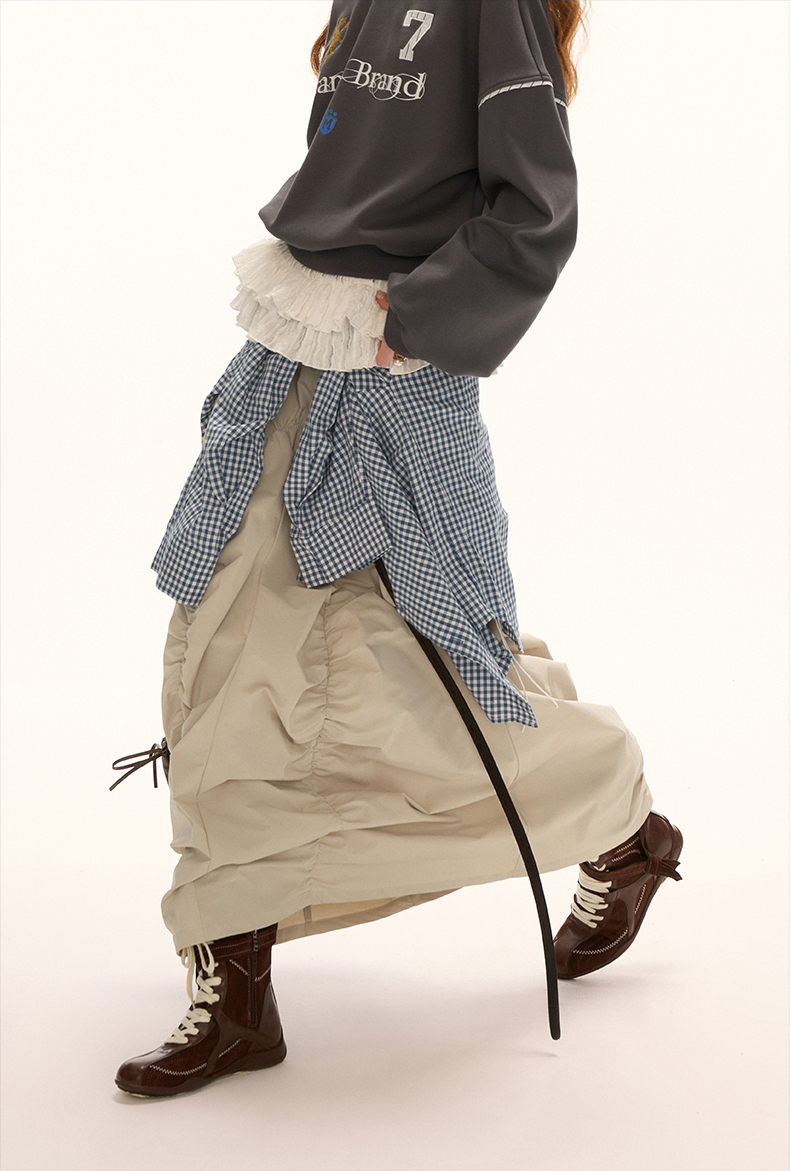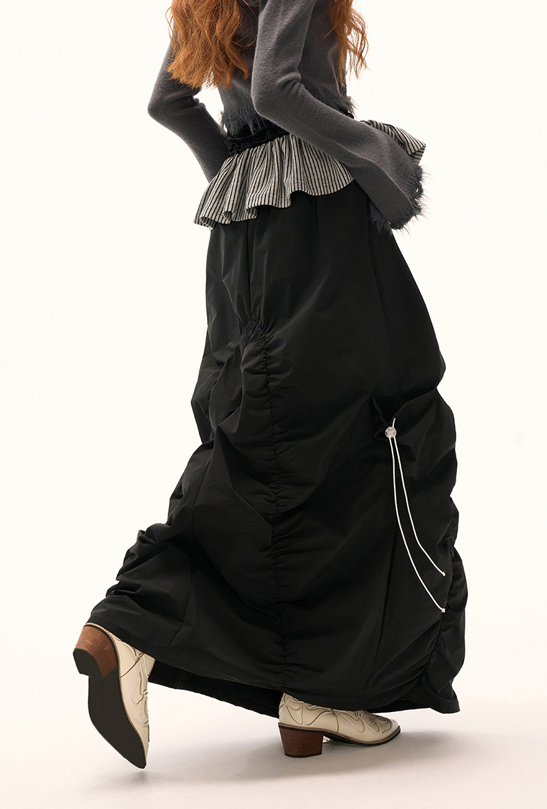 입체적인 셔링 디테일과 카고 포켓이 어우러져 유니크한 무드를 완성하며 드로스트링으로 실루엣 변형이 가능해 스타일에 따라 다양한 분위기를 연출할 수 있습니다.