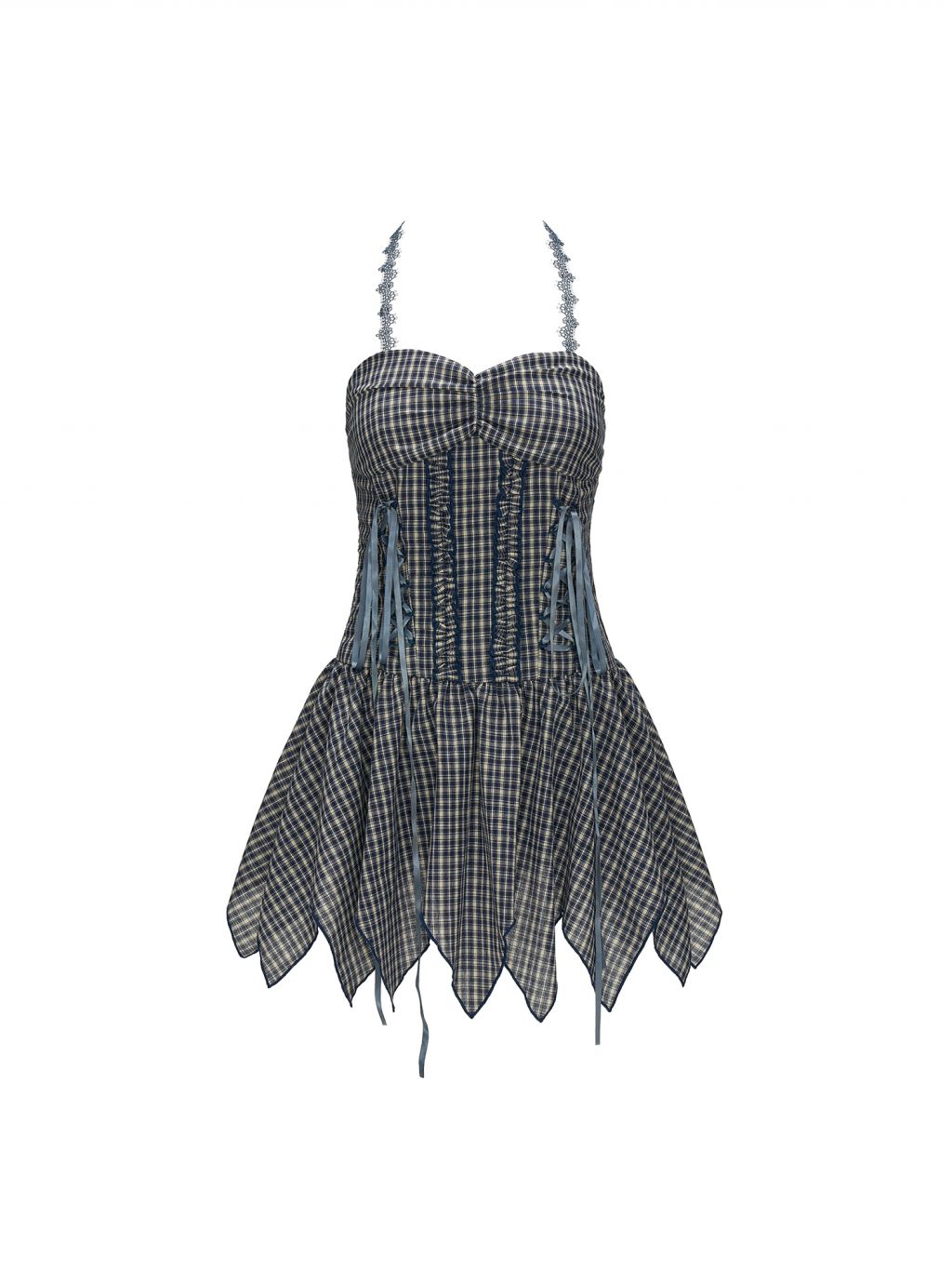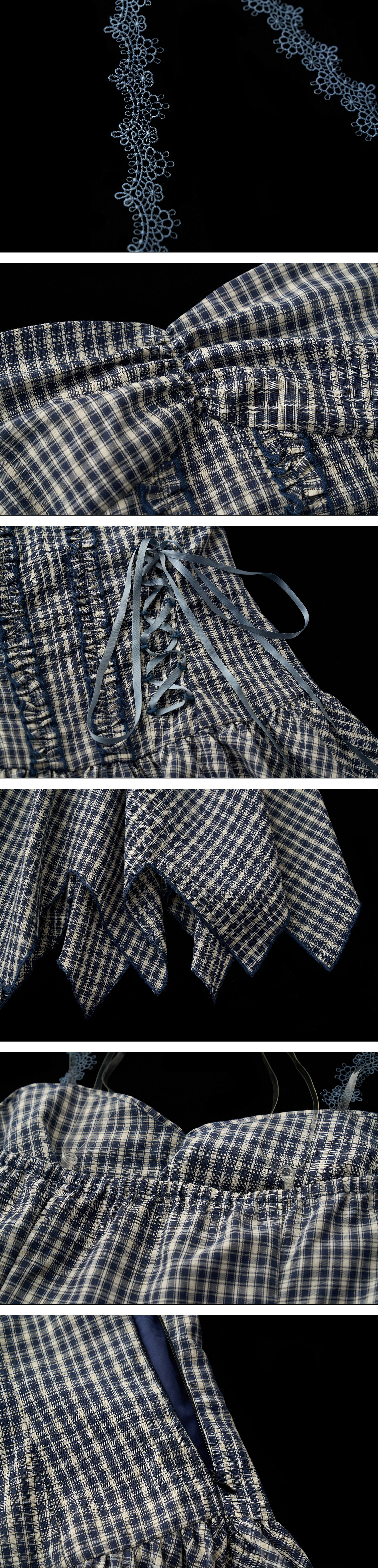 체크 패턴과 언밸런스한 커팅 디테일이 시선을 사로잡는 드레스로 코르셋 스타일의 레이스업 디테일이 바디 라인을 잡아주며 레이어드에 따라 키치하면서도 러블리하게 변주 가능한 아이템입니다.