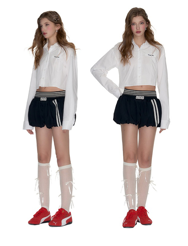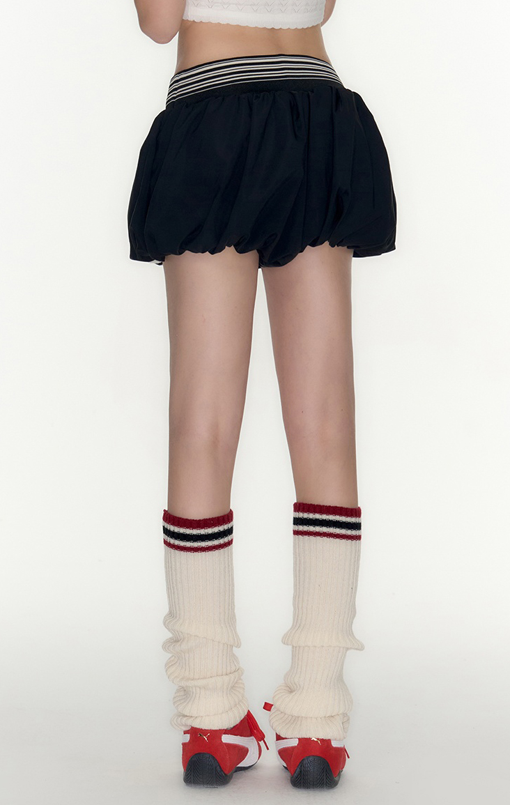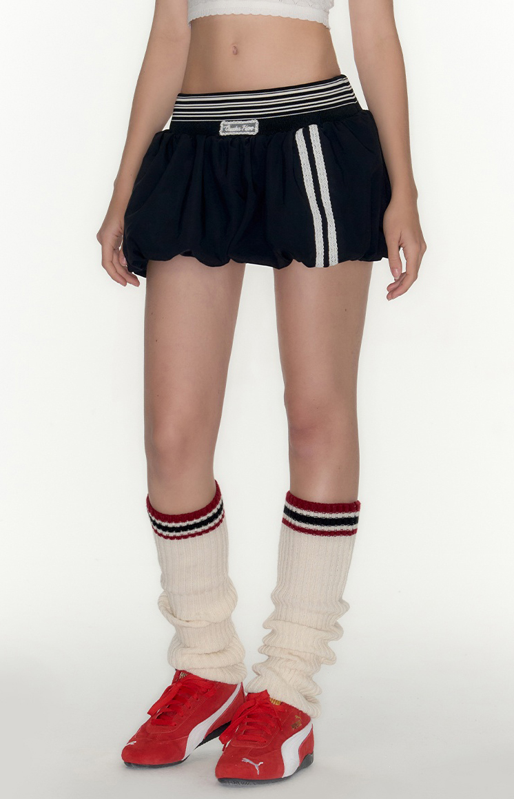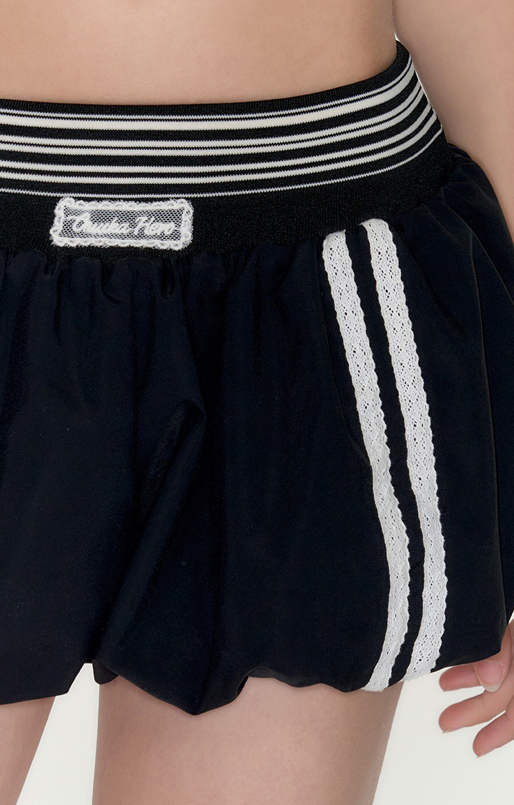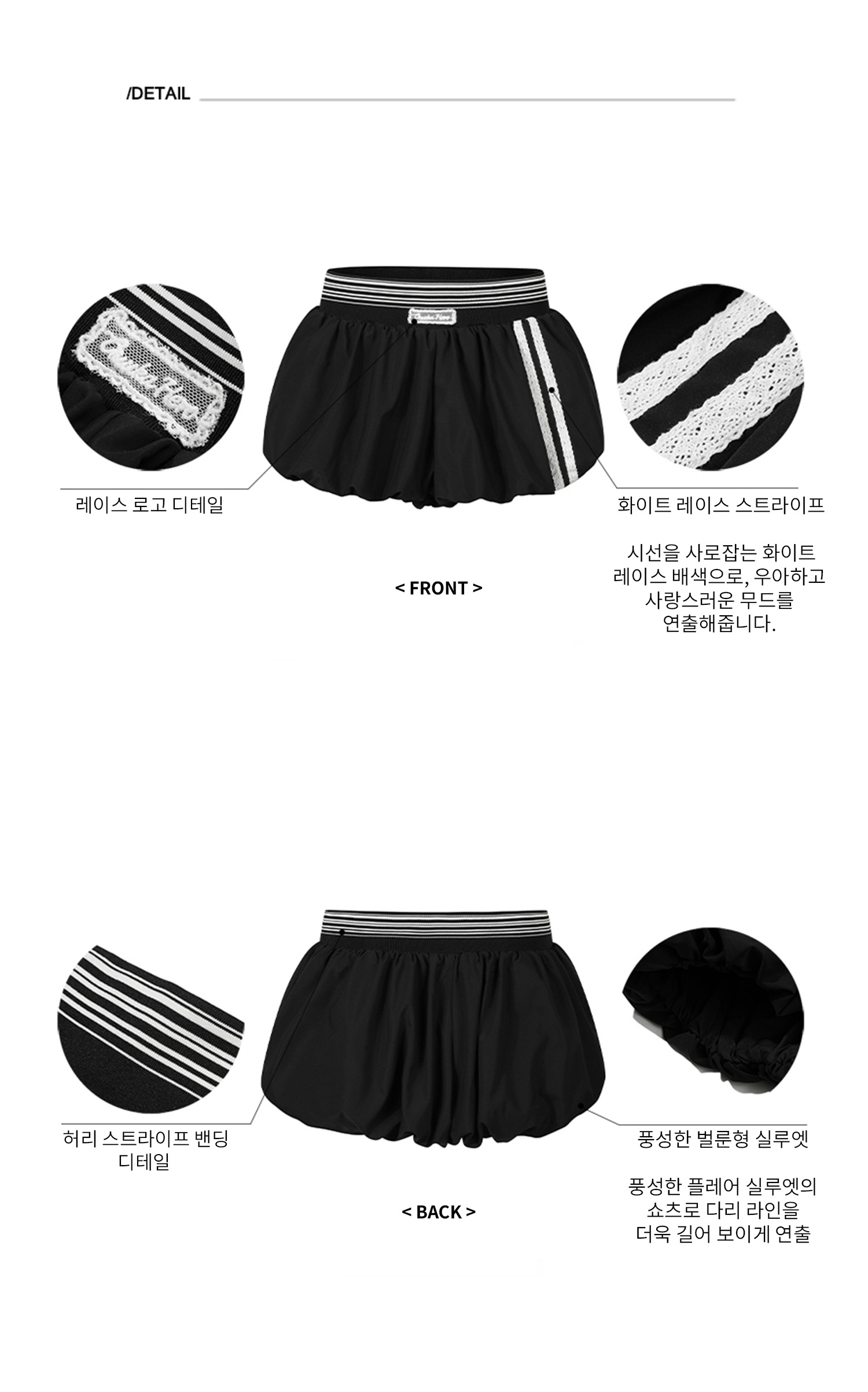 러블리하면서도 스포티한 무드의 볼륨감이 매력적인 벌룬 실루엣의 쇼츠로 스트라이프 밴딩과 레이스 디테일이 포인트를 더해줍니다.